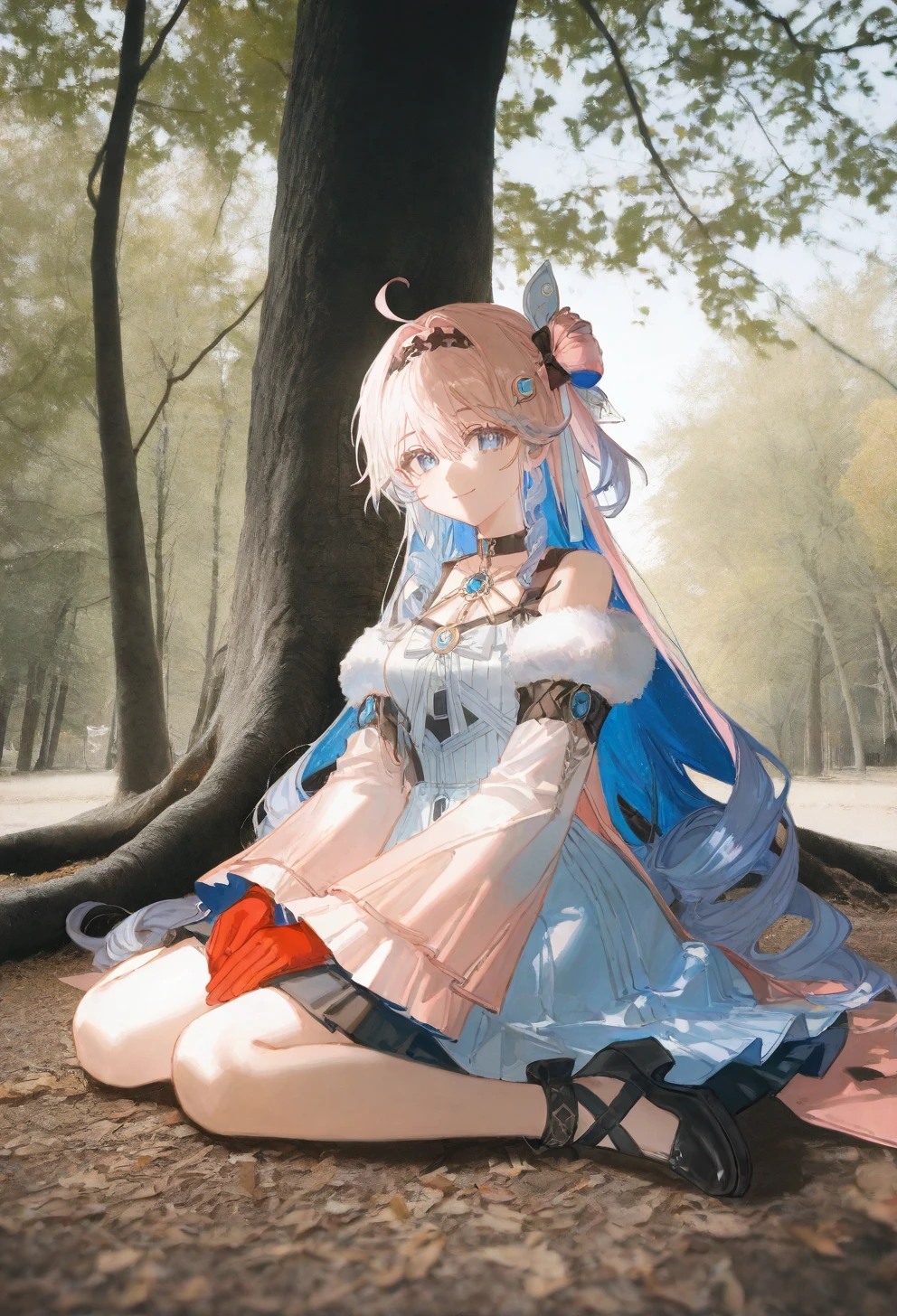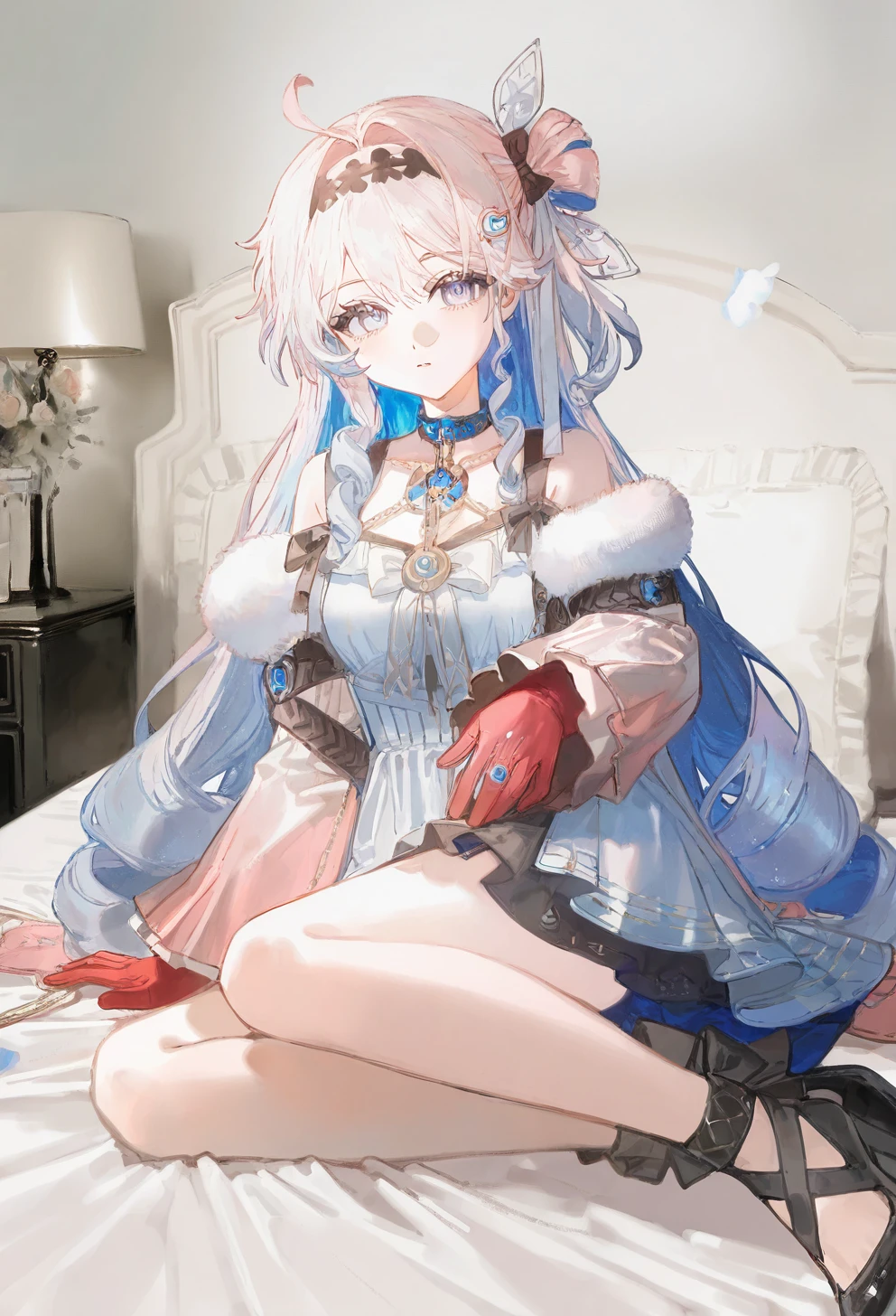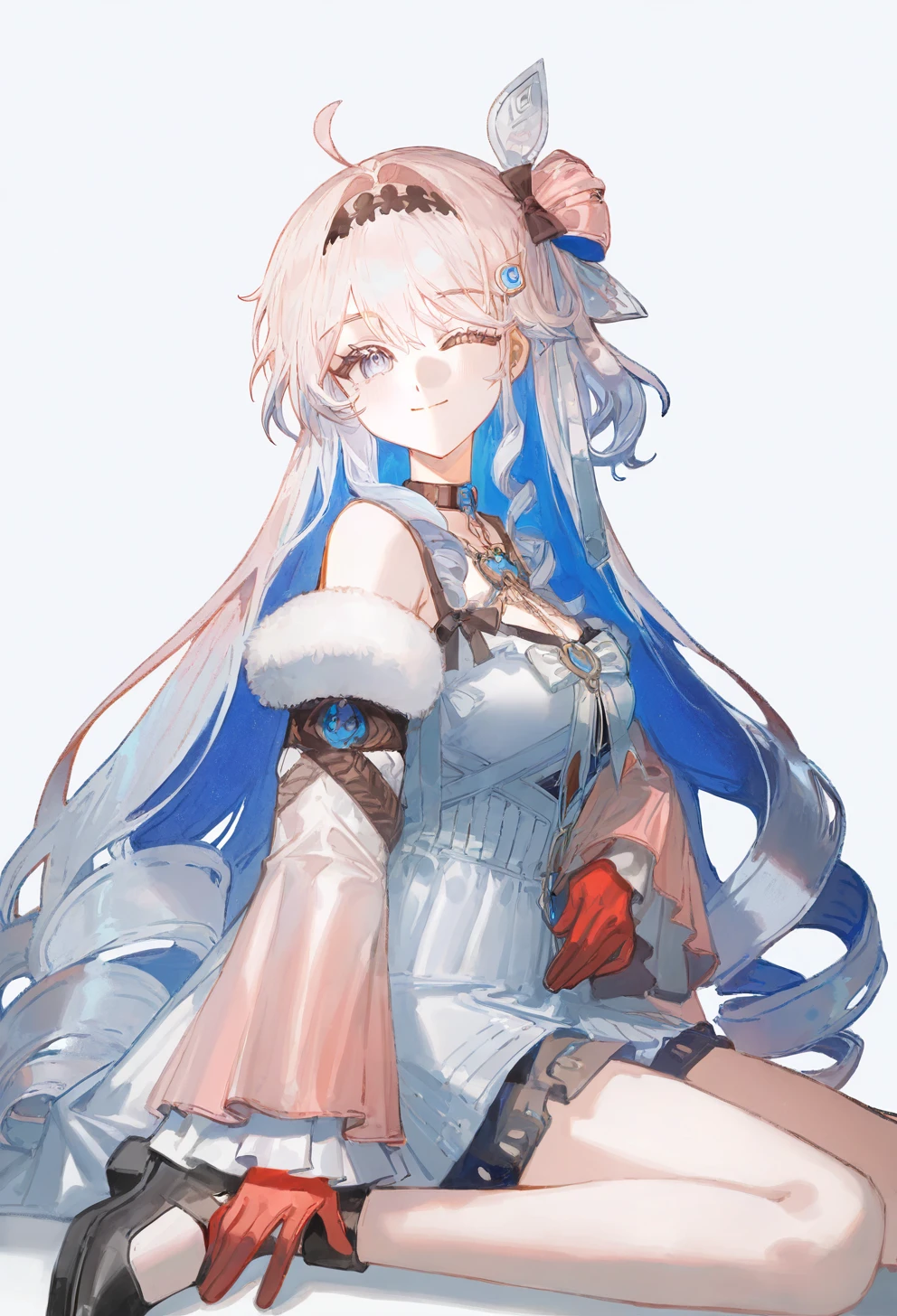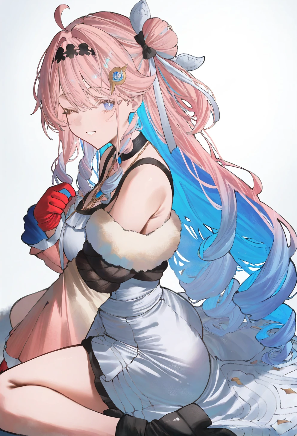 denia, 1girl, solo, multicolored hair, pink hair, blue hair, gradient hair, colored inner hair, long hair, drill hair, single side bun, one side up, ahoge, blue eyes, black hairband, hair ornament, white dress, black choker, red gloves, jewelry, black footwear, high heelsLora仅发布在civitai未经授权禁止转载
