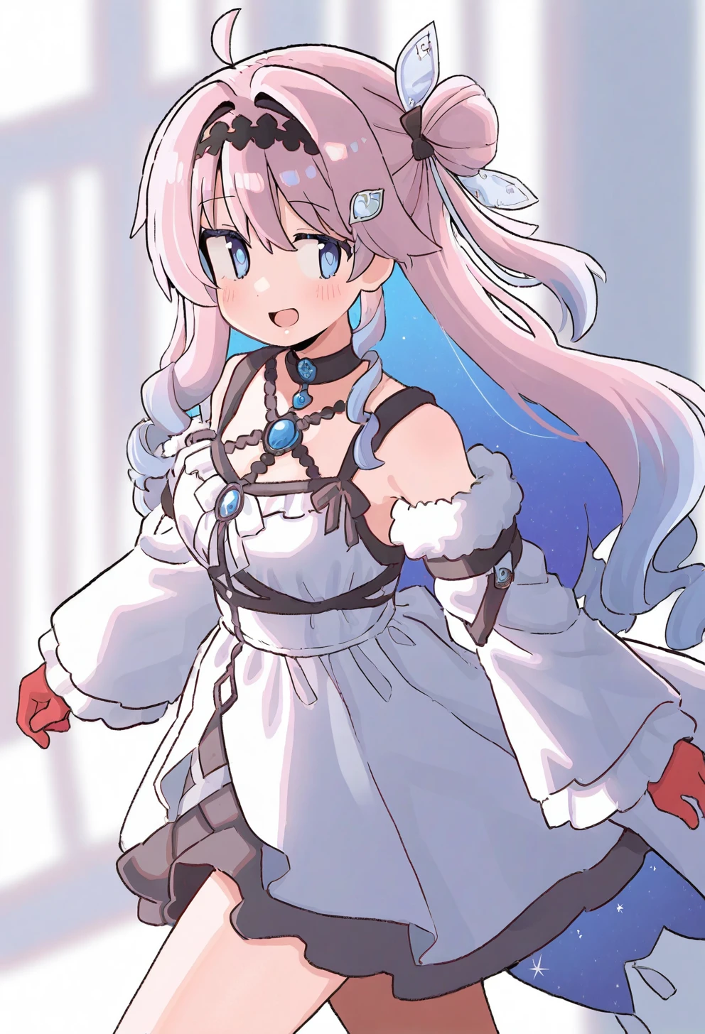 denia, 1girl, solo, multicolored hair, pink hair, blue hair, gradient hair, colored inner hair, long hair, drill hair, single side bun, one side up, ahoge, blue eyes, black hairband, hair ornament, white dress, black choker, red gloves, jewelry, black footwear, high heels