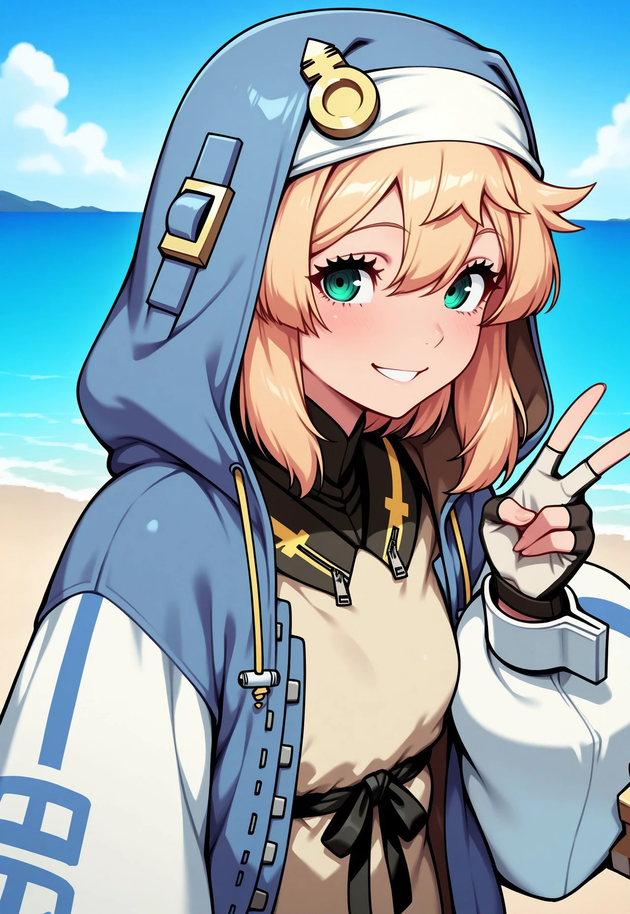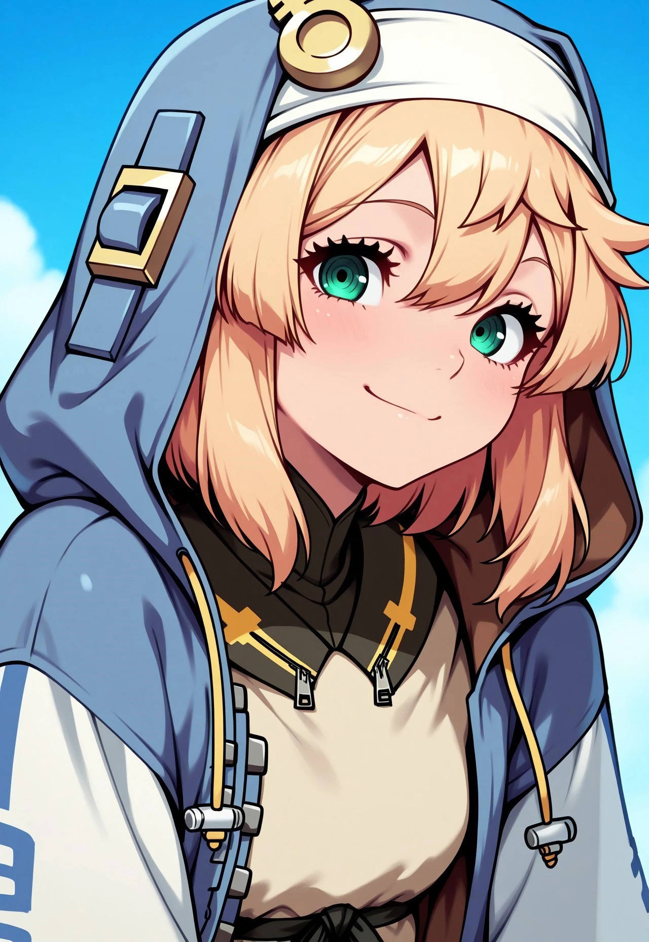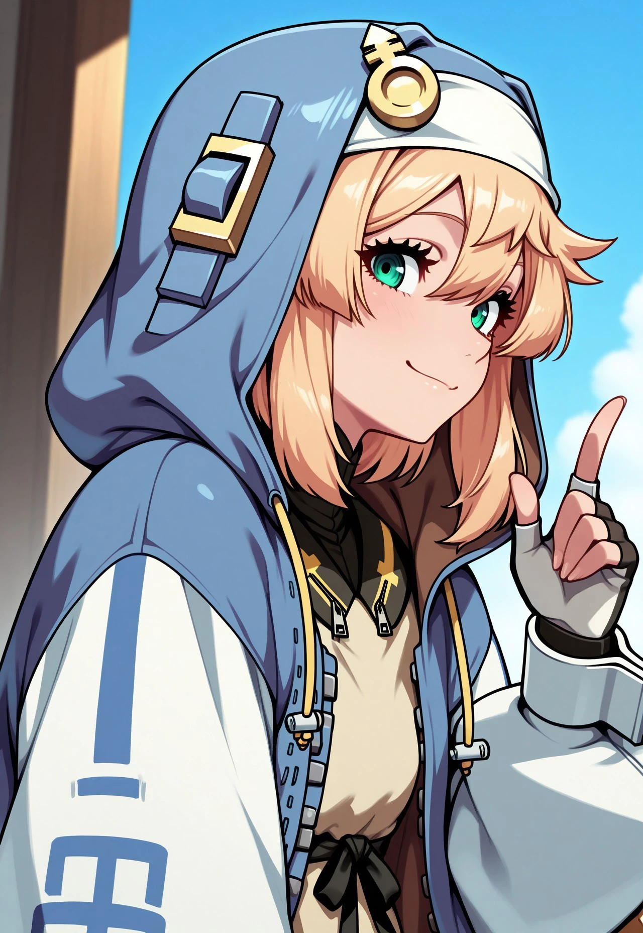 Prompt: very aesthetic, amazing quality, masterpiece, best quality, high quality, absurdres, high resolution, detailed, very detailed, extremely detailed, precise, accurate, Bridget, 1girl, green eyes, blonde hair, hood, fingerless gloves