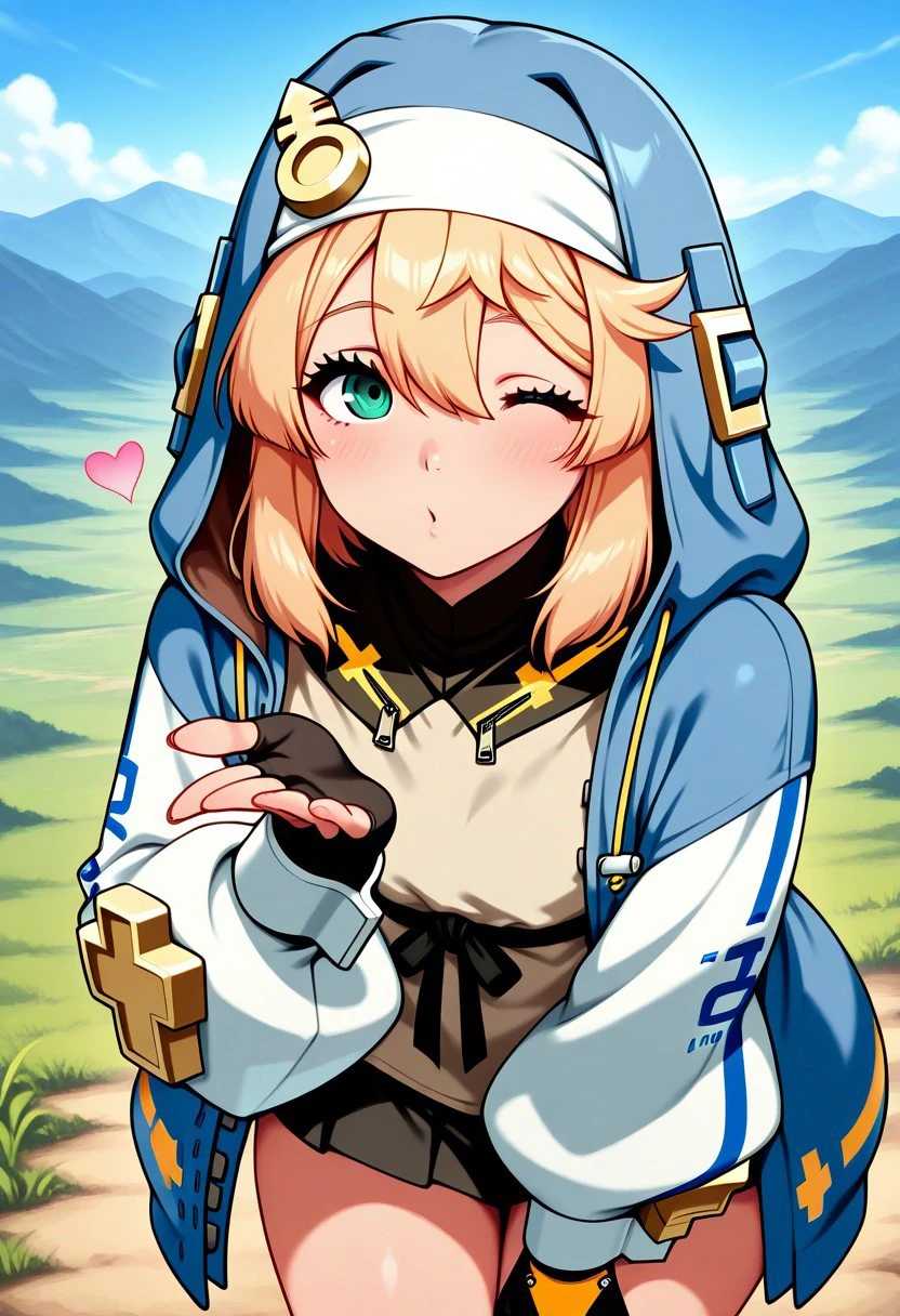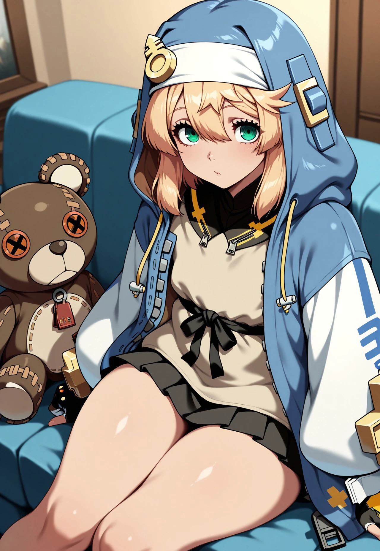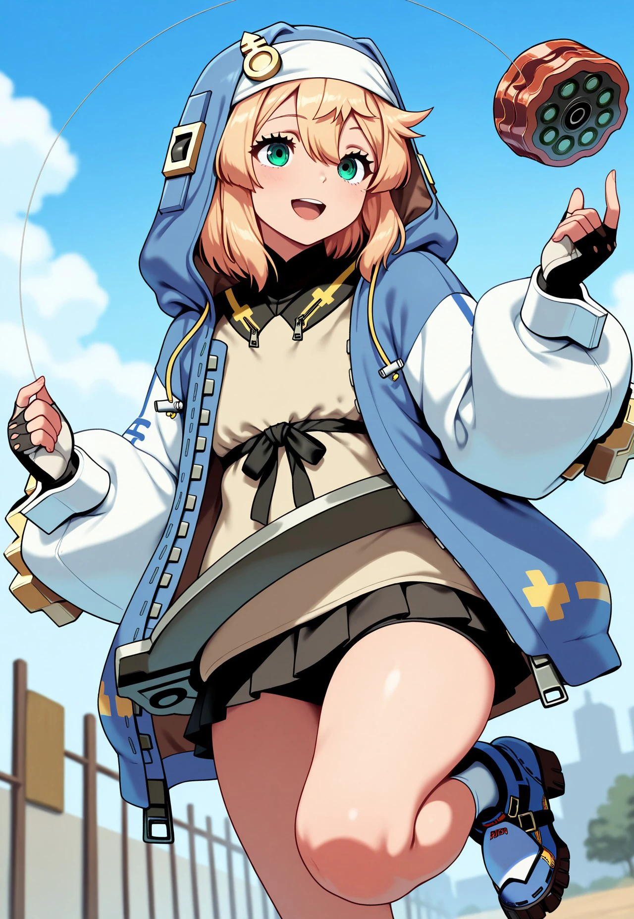 Prompt: very aesthetic, amazing quality, masterpiece, best quality, high quality, absurdres, high resolution, detailed, very detailed, extremely detailed, precise, accurate, Bridget, 1girl, green eyes, blonde hair, hood, fingerless gloves