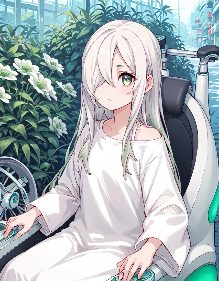 anemone_real,1girl, bare shoulders, long hair, green hair, 1girl, long sleeves, green eyes, white shirt, white hair, wheelchair, (hair over one eye),