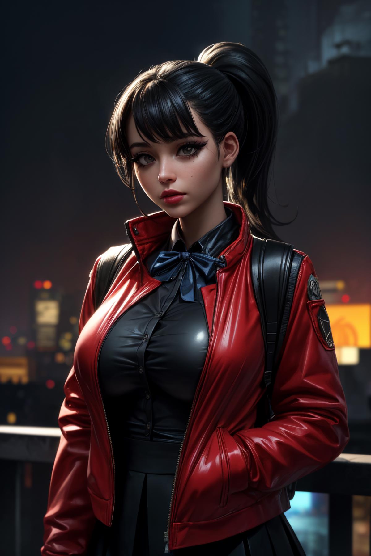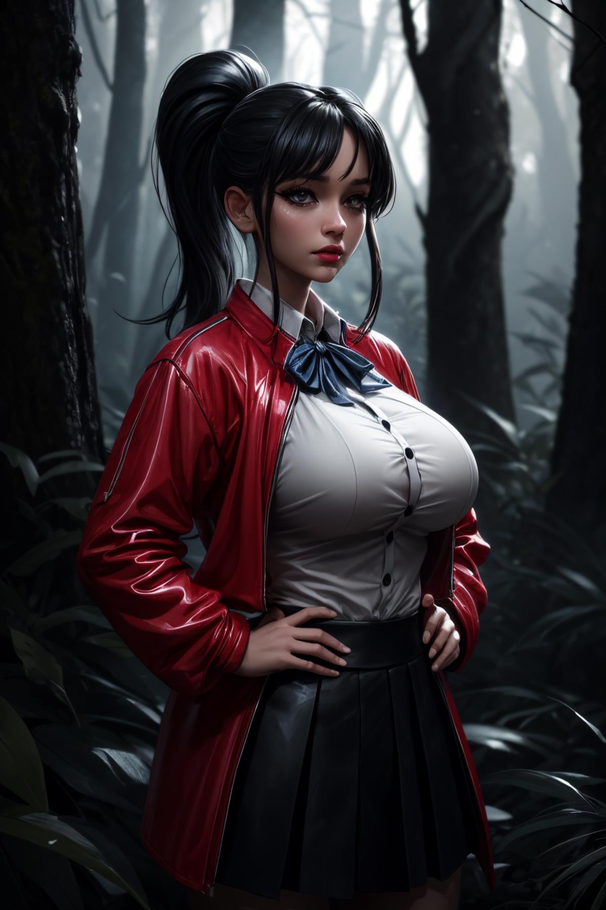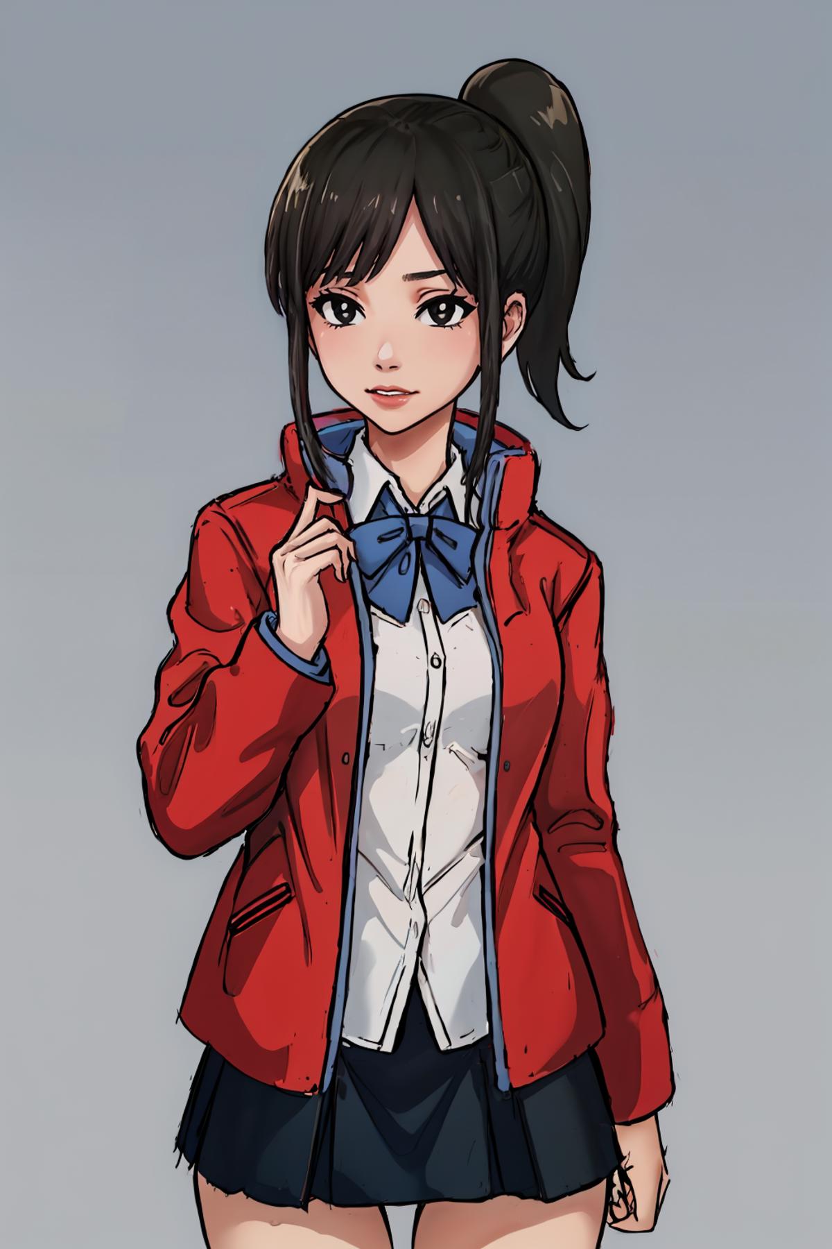 Default Outfit: red jacket, collared shirt, bow, skirt