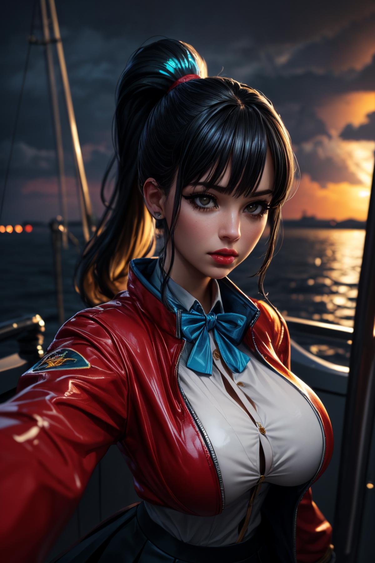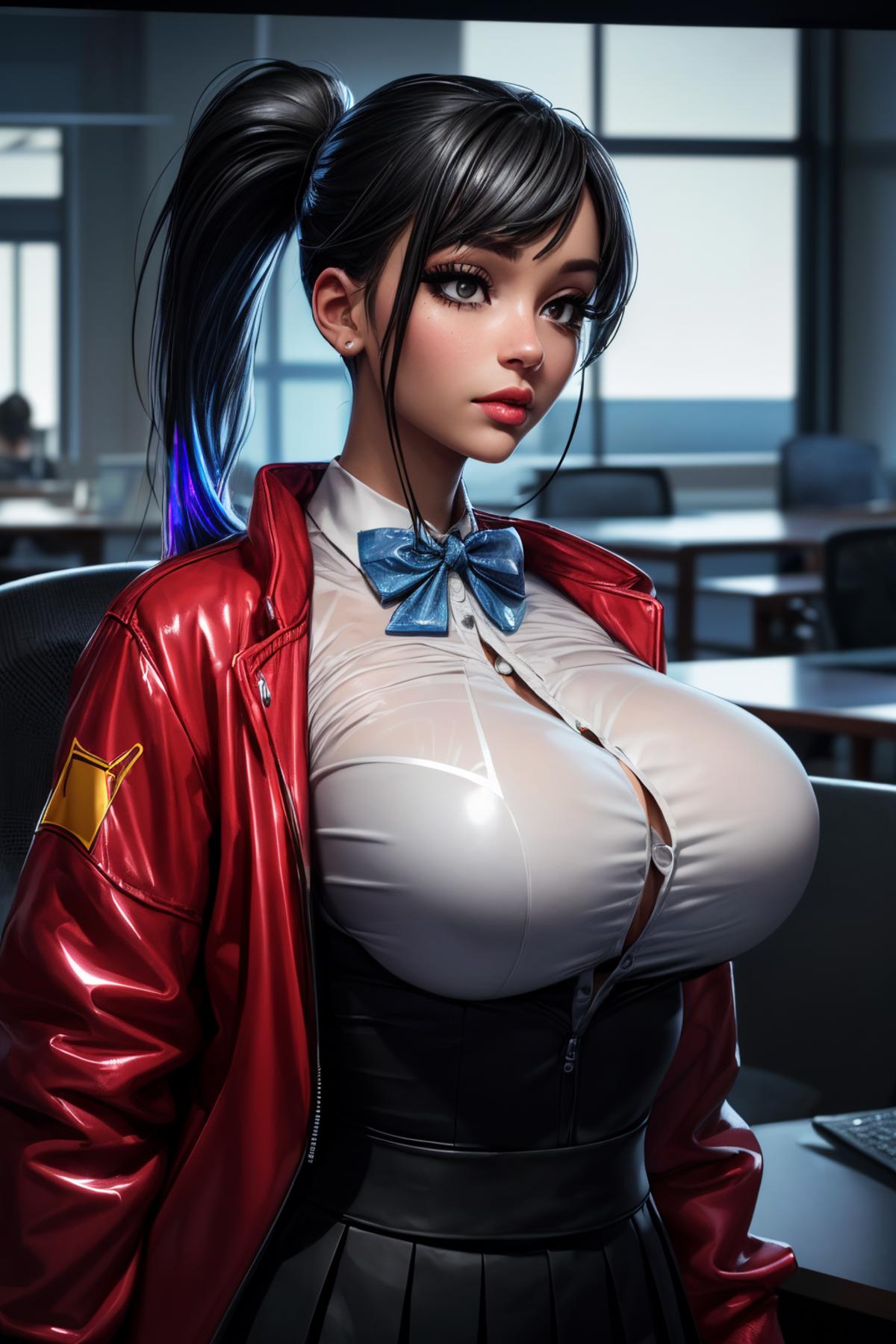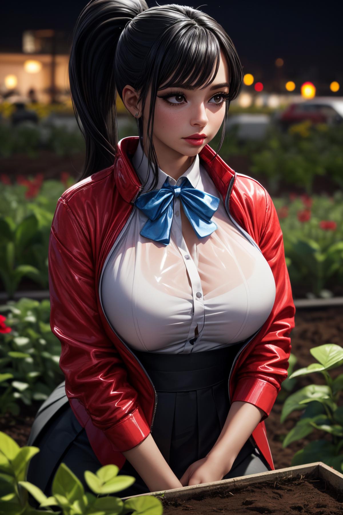 Default Outfit: red jacket, collared shirt, bow, skirt