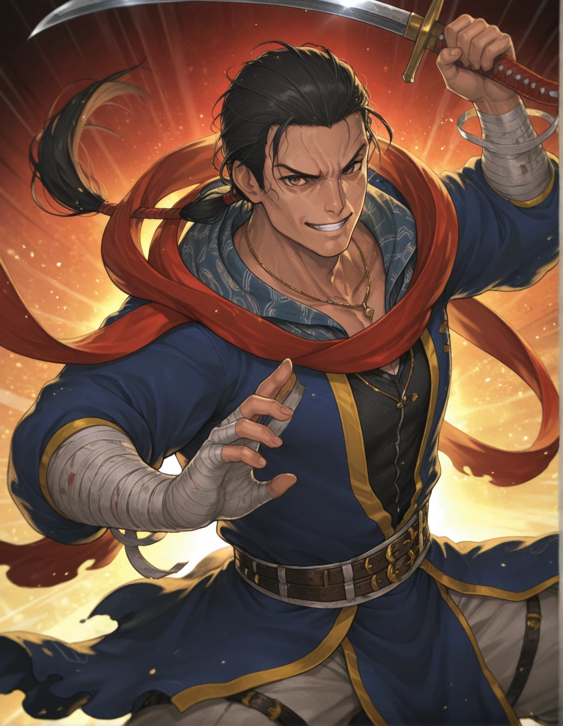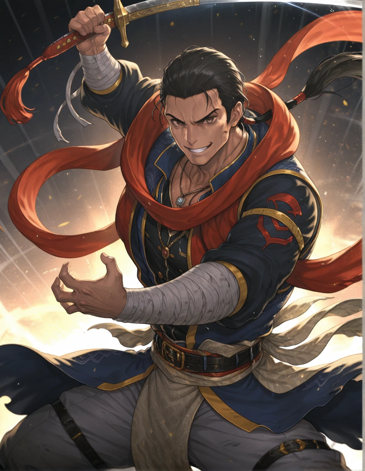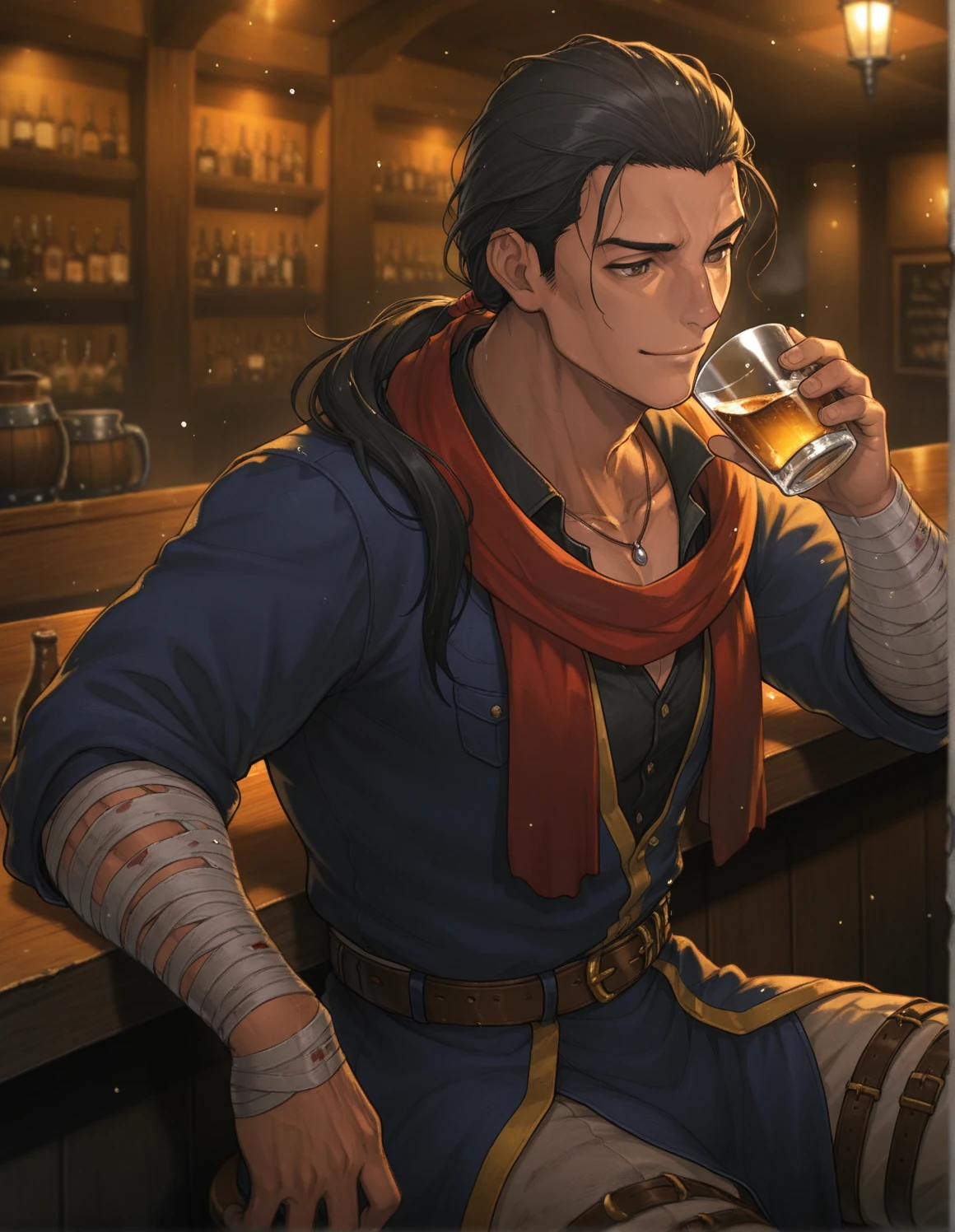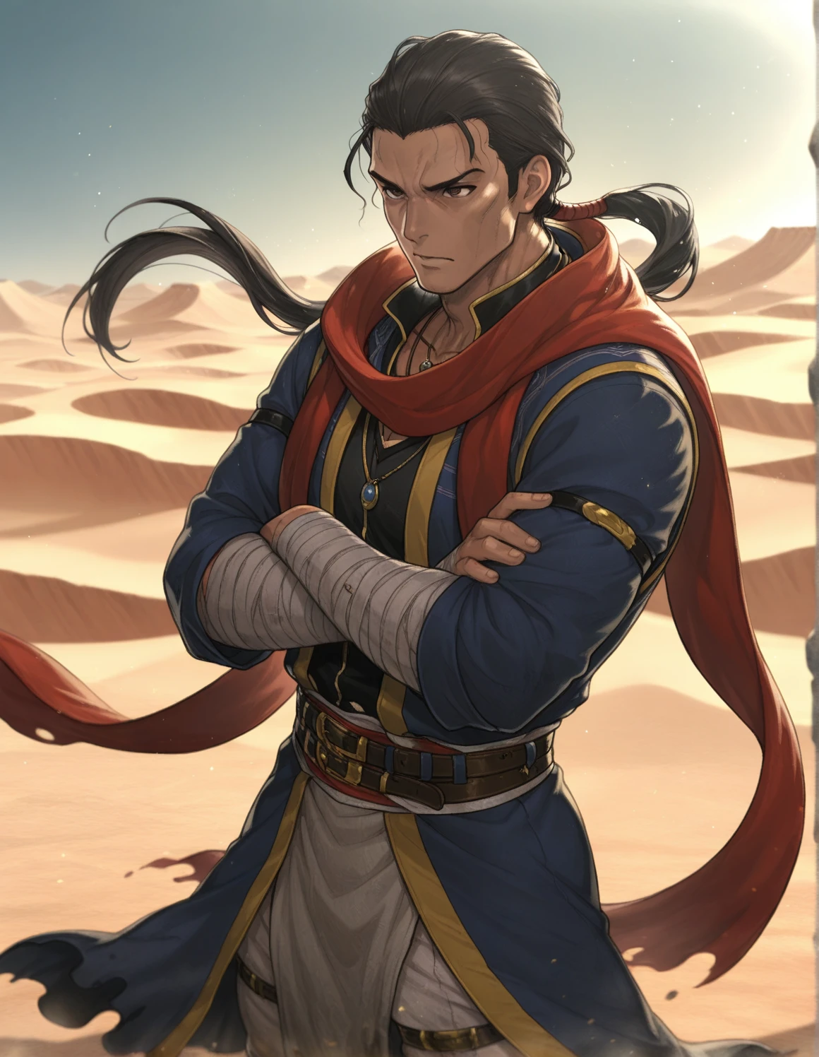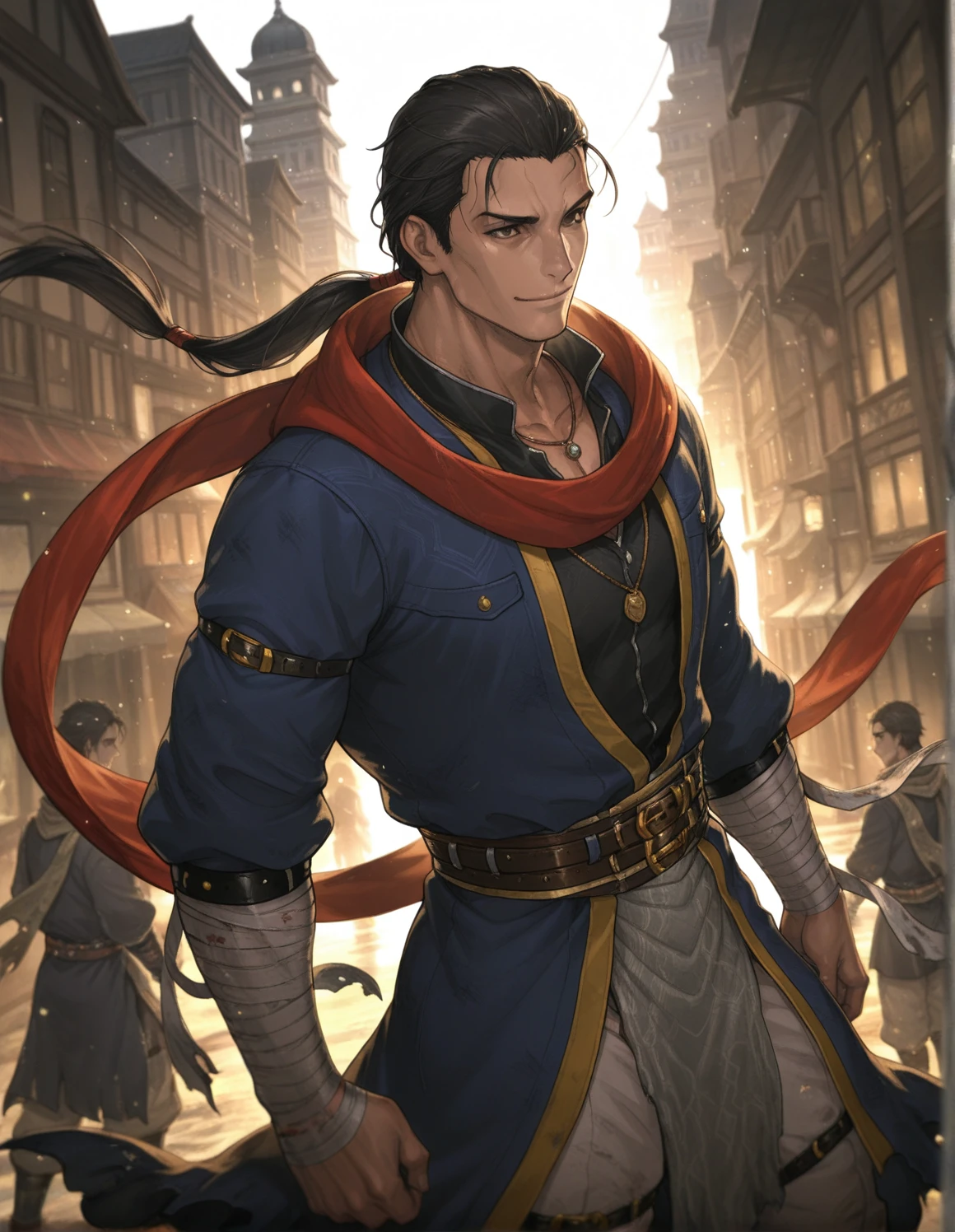 1male, rs3hrd, manly, brown eyes, black hair, low ponytail, long hair, necklace, scarf, bandages, belt,