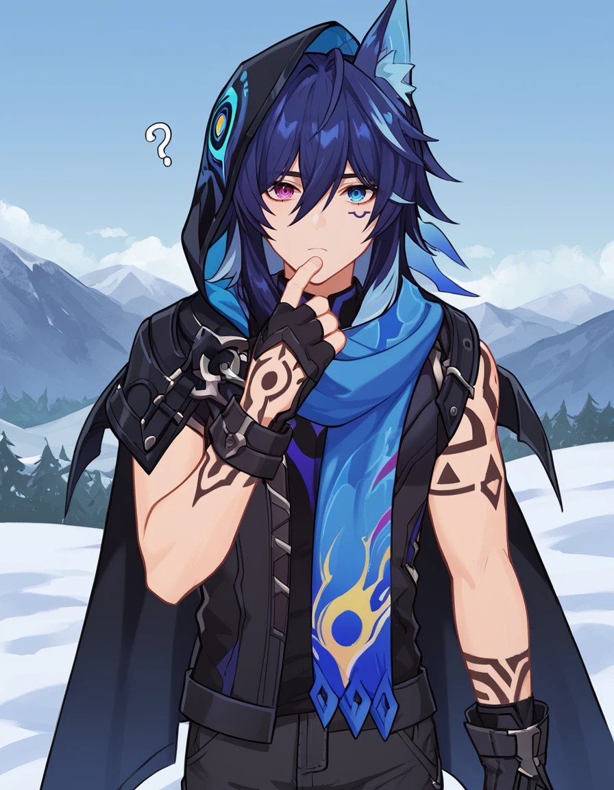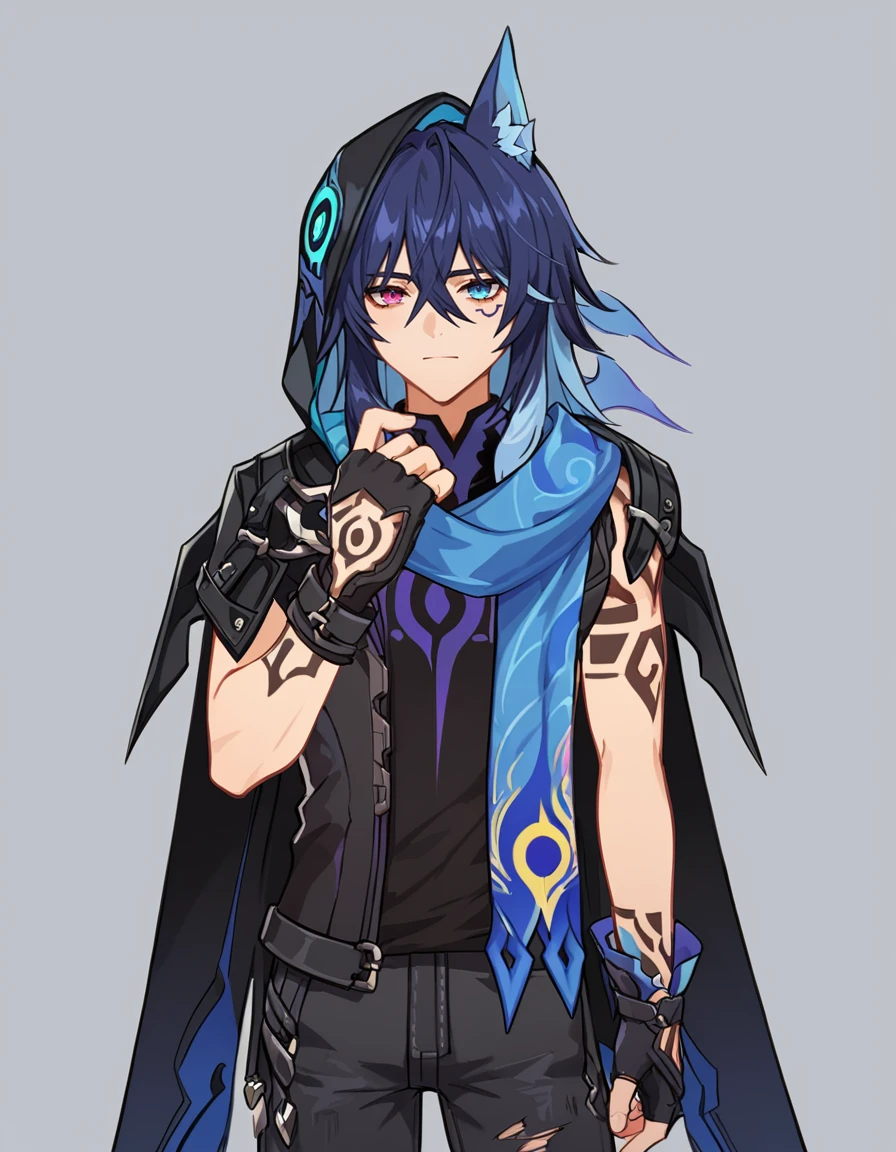ororon, blue hair, multicolored hair, long hair, hair between eyes, heterochromia, blue eyes, purple eye, facial mark, arm tattoo, animal earsClothes