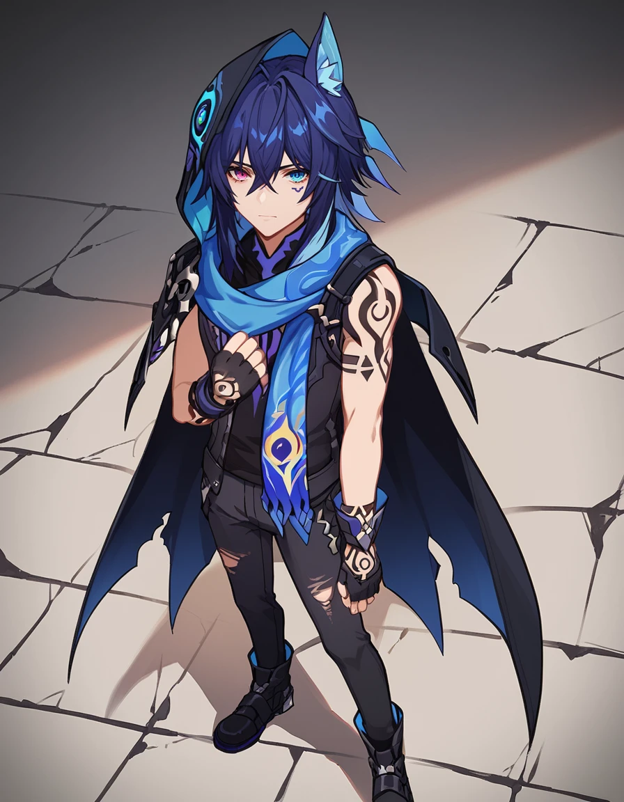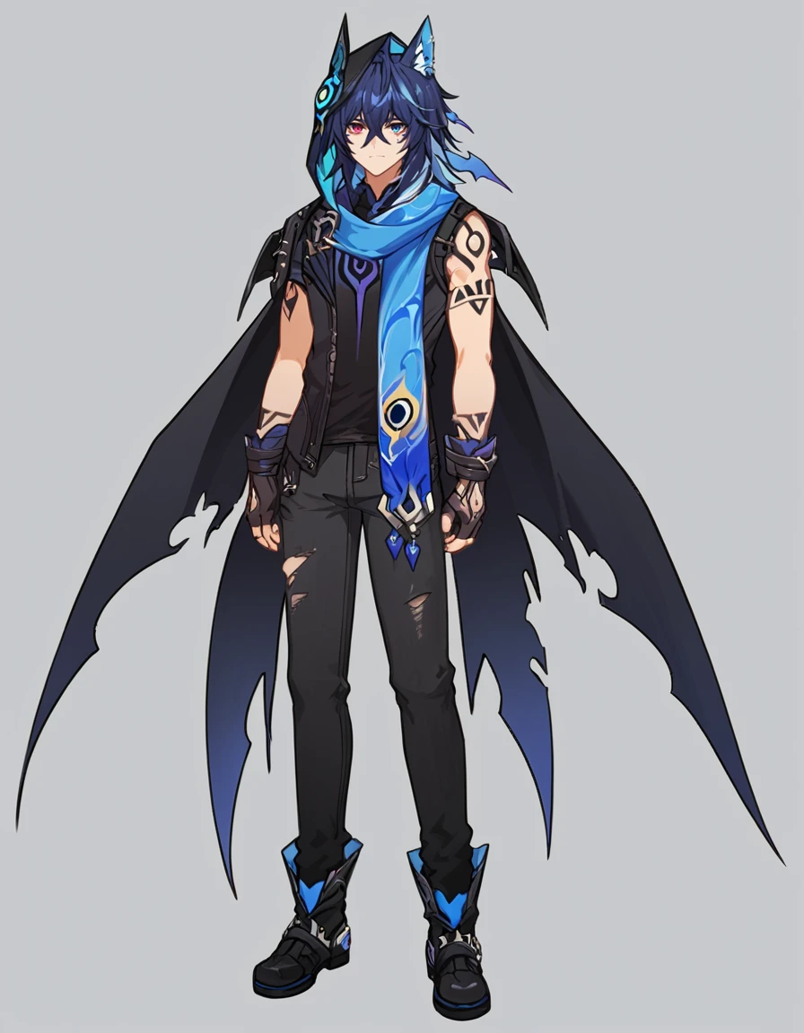 hood up, blue scarf, black gloves, fingerless gloves, torn clothes, black jacket, sleeveless jacket, black shirt, black pants, black footwearStats for Nerds