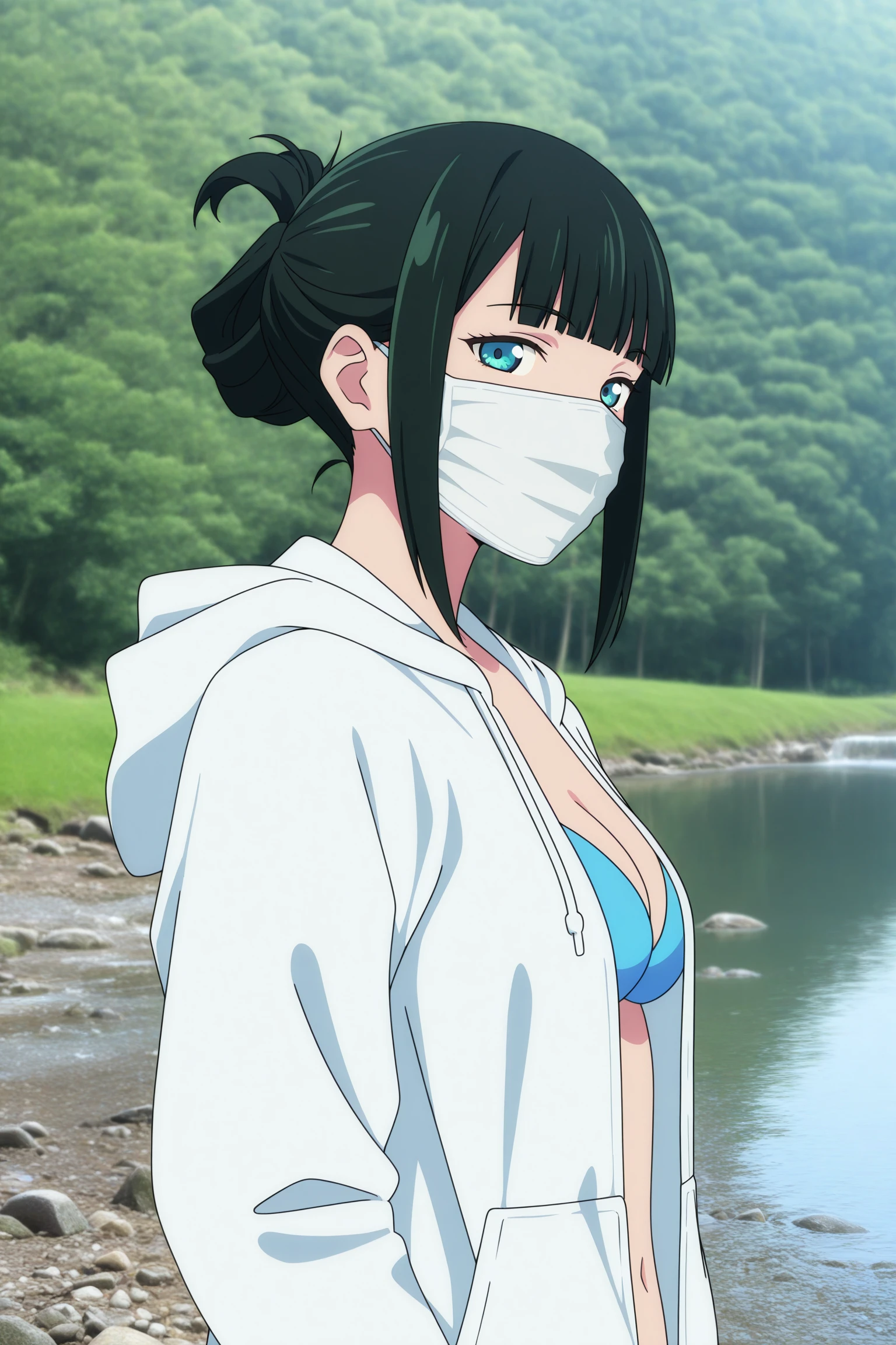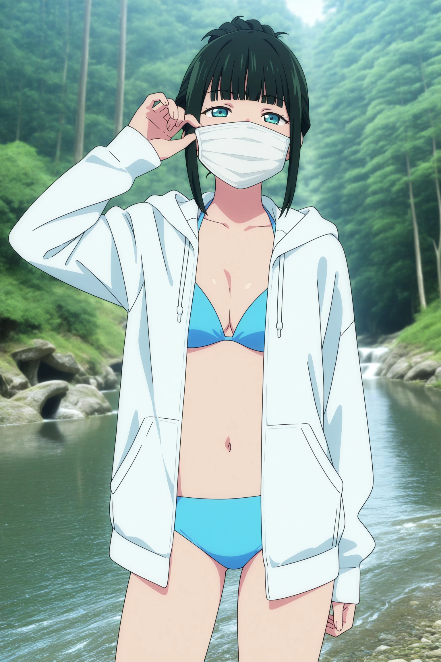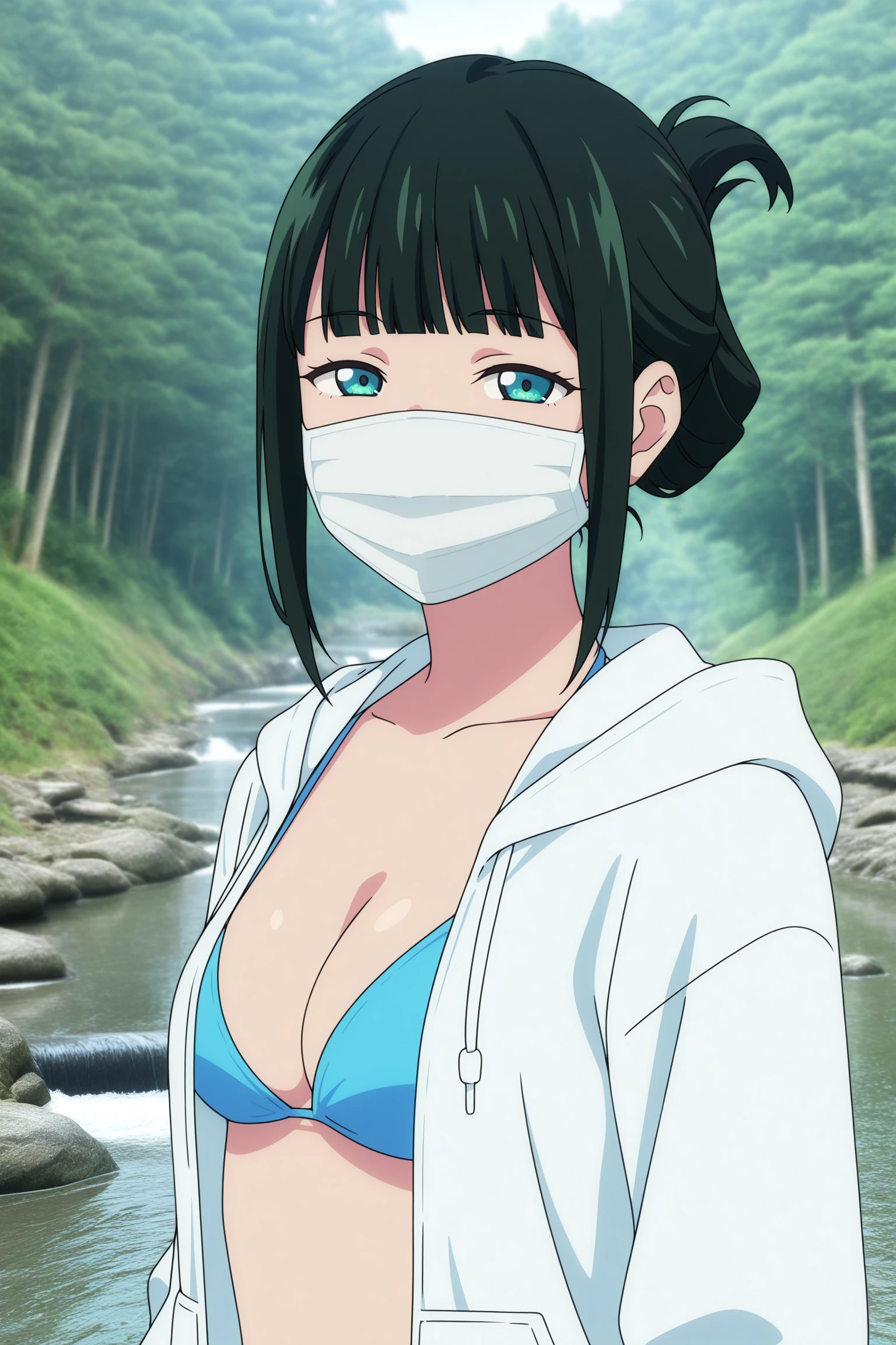 hass, short hair, green hair, updo, sidelocks, blunt bangs, aqua eyes, white mask, surgical mask, white jacket, hooded jacket, open jacket, drawstring, blue bikini