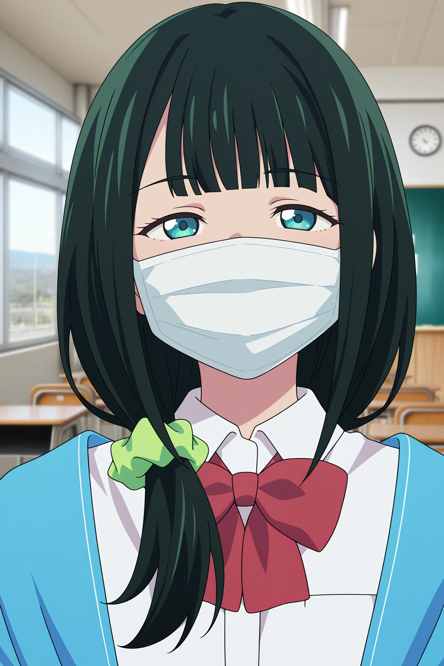 hass, long hair, green hair, low ponytail, hair scrunchie, blunt bangs, aqua eyes, white mask, surgical mask, short sleeves, white shirt, collared shirt, red bowtie, blue shawl, black skirt, pleated skirt, white socks, kneehighs, brown footwear, loafersBikini & Hooded Jacket