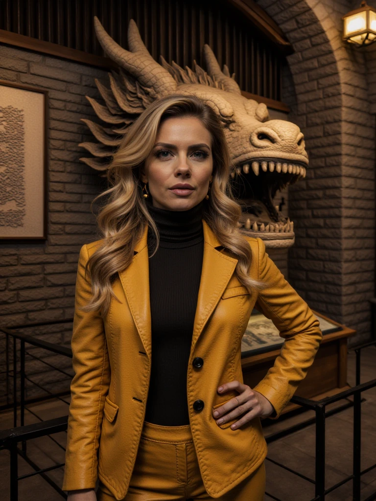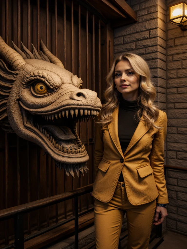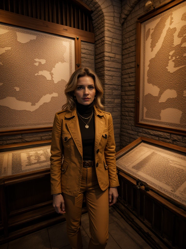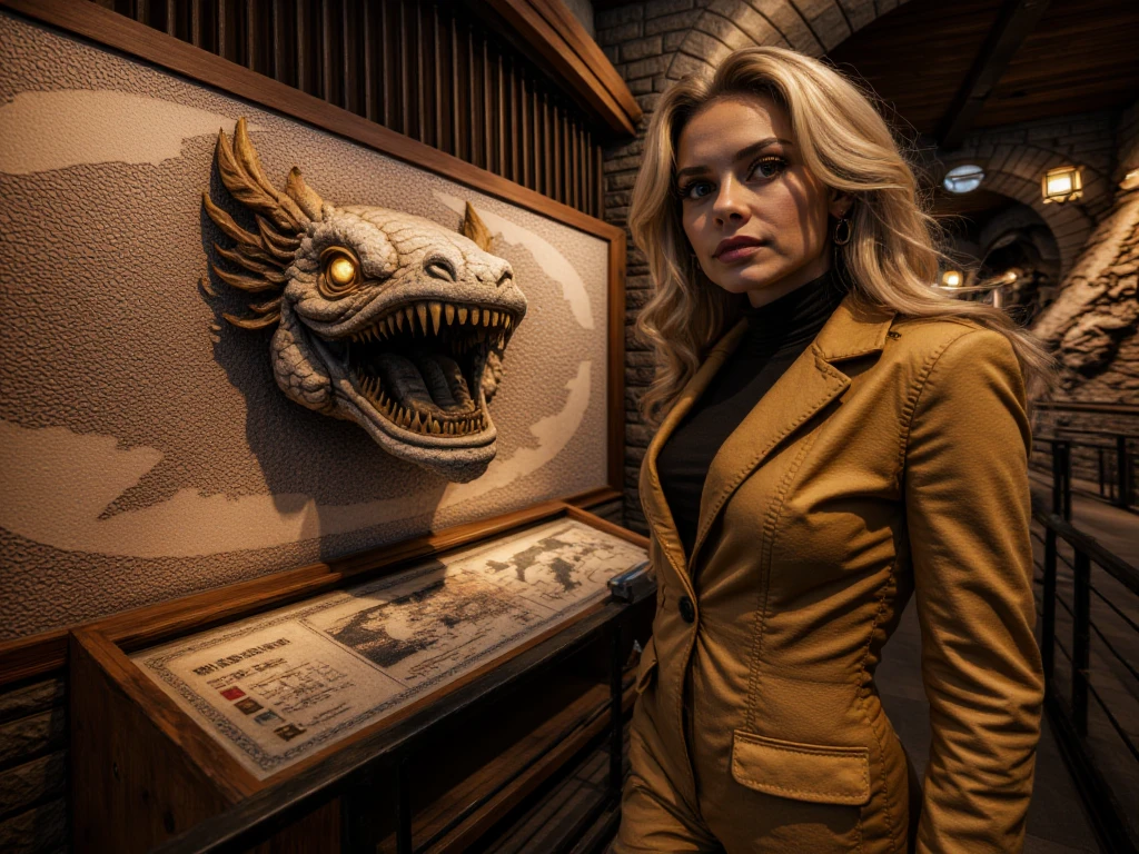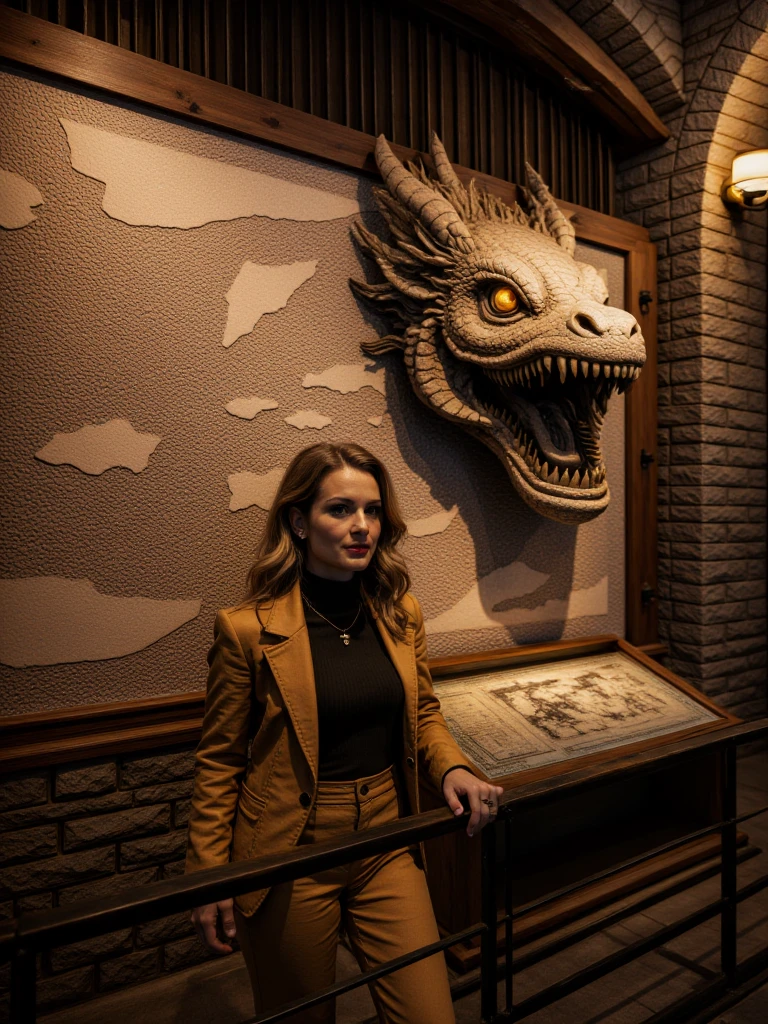 Stone-built museum hallway, grand arched corridor built from rough-hewn stone blocks with vaulted ceilings and evenly spaced hanging lanterns casting warm amber light. A smooth dark pathway curves forward between black metal railings. On the left wall, large framed ancient maps and carved relief maps are mounted above glass-topped display cases showing old manuscripts and documents. On the right wall, a massive textured stone map relief features a dramatic three-dimensional dragon head sculpture with glowing orange eyes and sharp teeth emerging from the surface. Upright illuminated display cases stand on stone ledges, and potted green plants sit near the railing. Warm lantern light contrasts with cooler blue light in the distant glass-paneled ceiling.