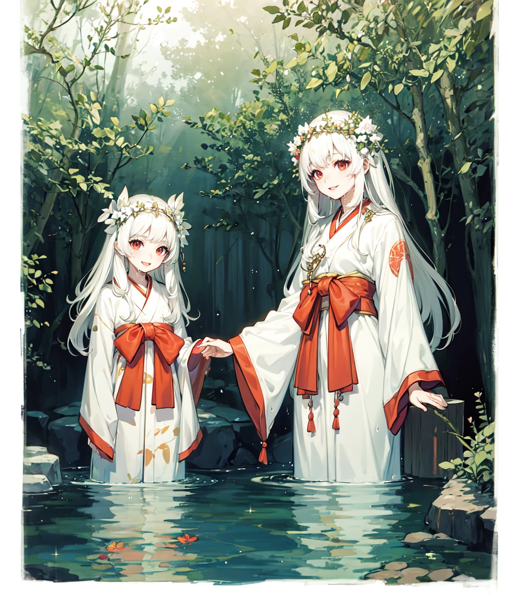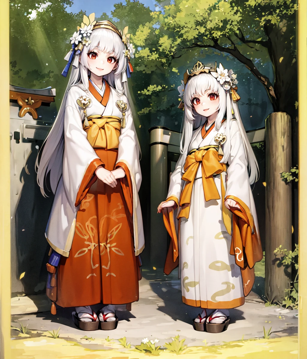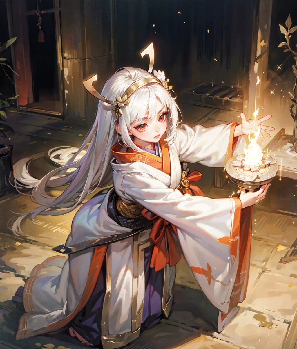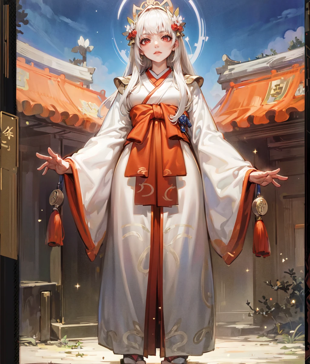 Notable tags: white hair, long hair, japanese clothes, gold hair ornament, red eyes