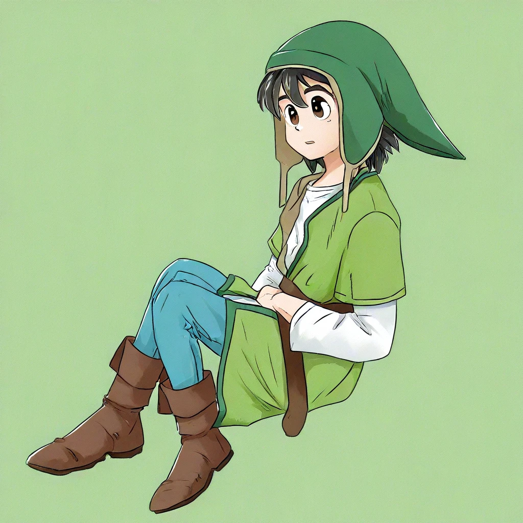 herodq, 1boy, male focus, solo, black hair, hat, green headwear, brown eyes, shirt, white shirt, tunic, green tunic, layered sleeves, short over long sleeves, belt, pants, blue pants, boots, brown footwear,