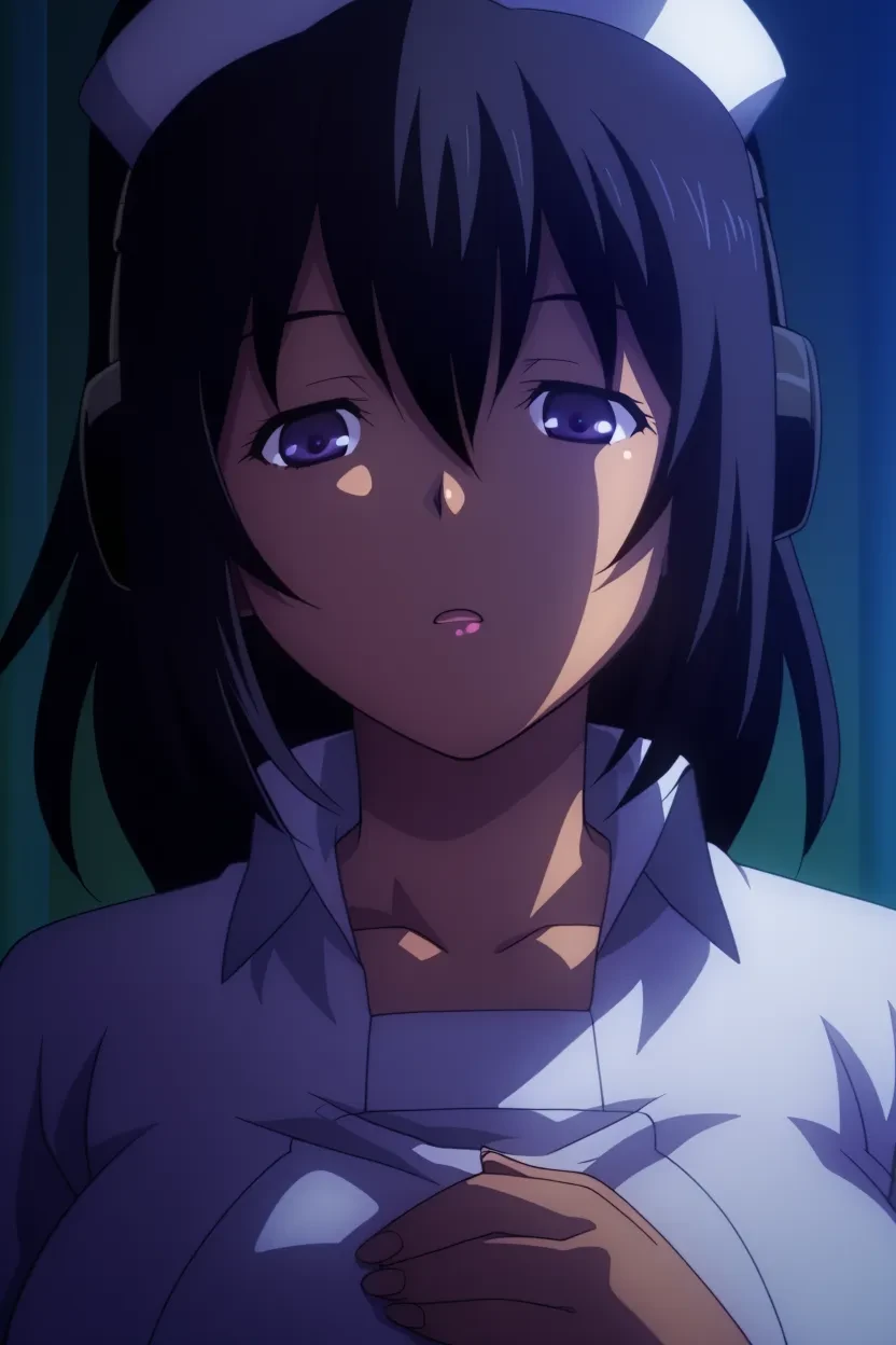 girl, Hiramatsu (Sakusei Byoutou The Animation), long hair, ponytail, black hair, purple eyes, glossy lips, dark skin, dark-skinned female, massive , , curvy, wide , thick thighs, , fully , , , Sakusei Byoutou The Animation_Art_Style, HD, 4k, high-resolution, superb quality, uncensored