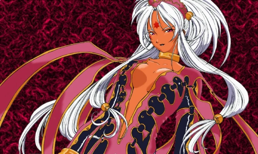 1girl, white hair, low-tied long hair, facial mark, forehead mark, star \(symbol\), choker, make up, dark-skinned female, purple eyes, large breast, mature female,