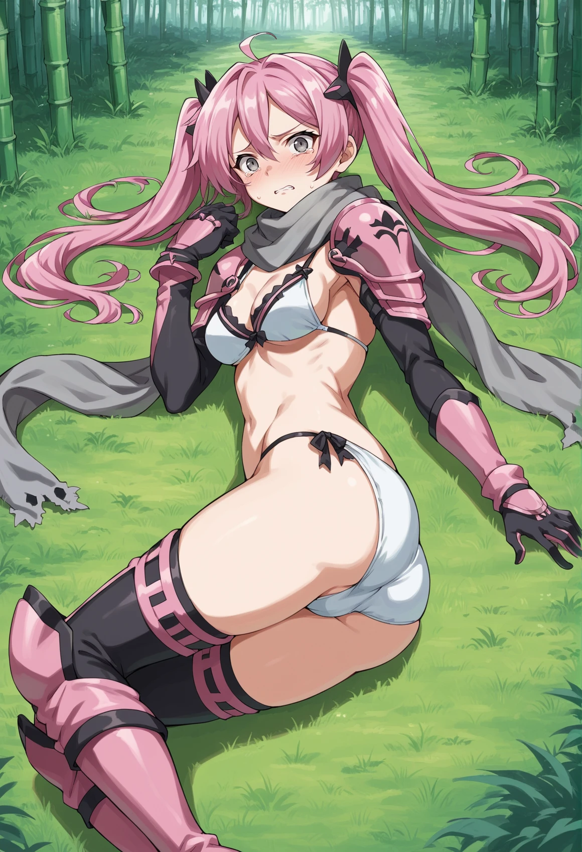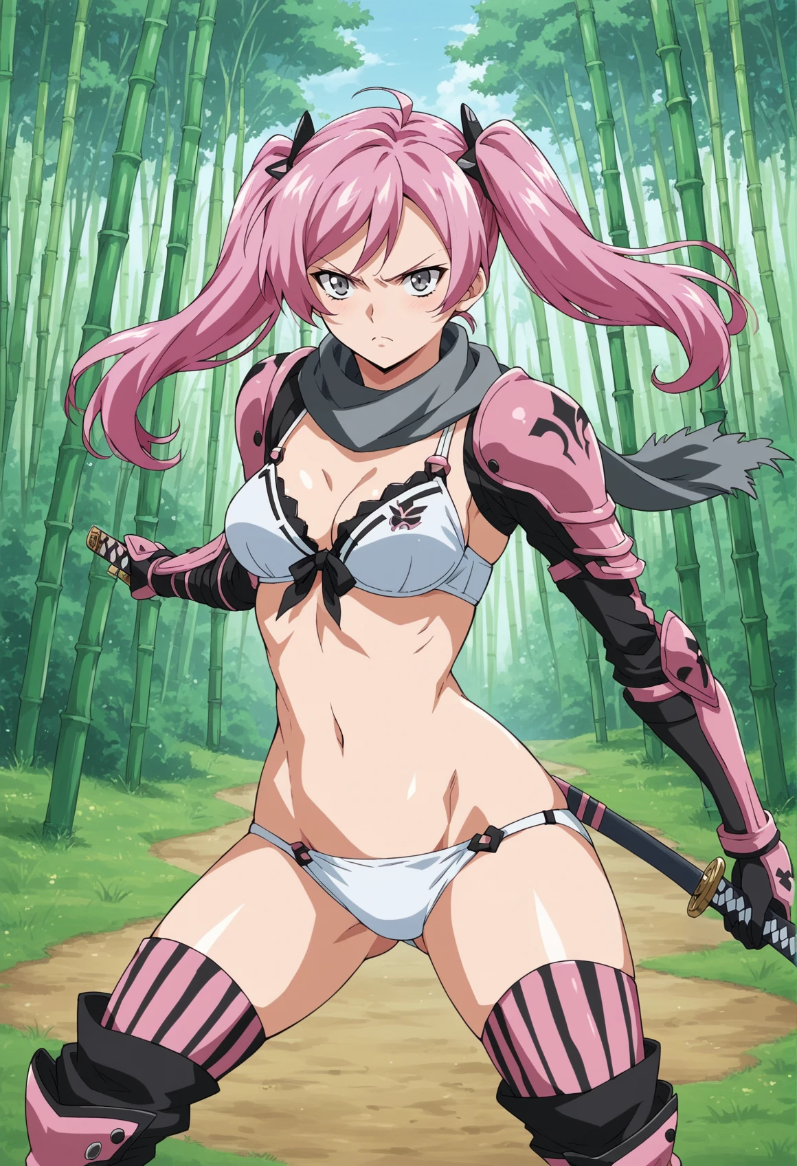 Notable tags: pink hair, grey eyes, long hair, twintails, hair ornament, bikini, scarf, detached sleeves, shoulder pads, gloves, Thighhighs, greaves