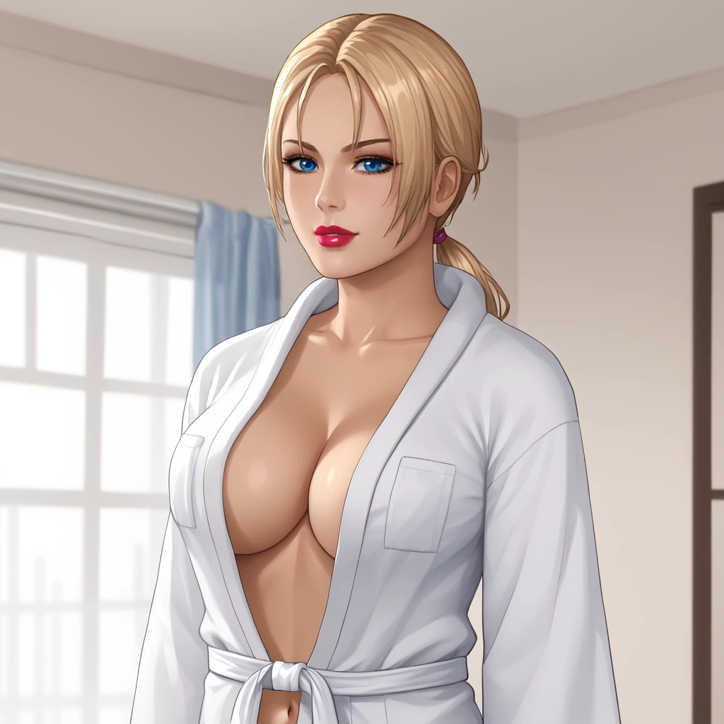 SonyaBladeMK9, 1girl, cleavage, midriff, navel, blue eyes, ponytail, jewelry, vest, belt, necklace, large breasts, fingerless gloves, short blonde hair, dog tags, cowboy shot