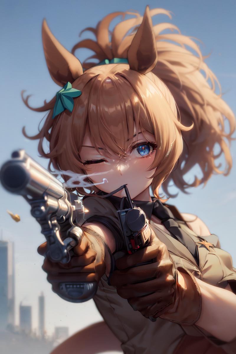 (optional) finger gun, hand up, handgun, holding gun, holding weapon, revolver