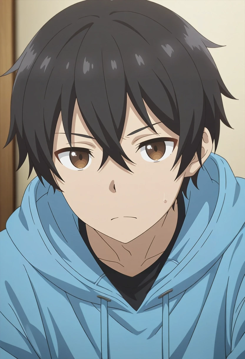 blue hoodie, black shirt