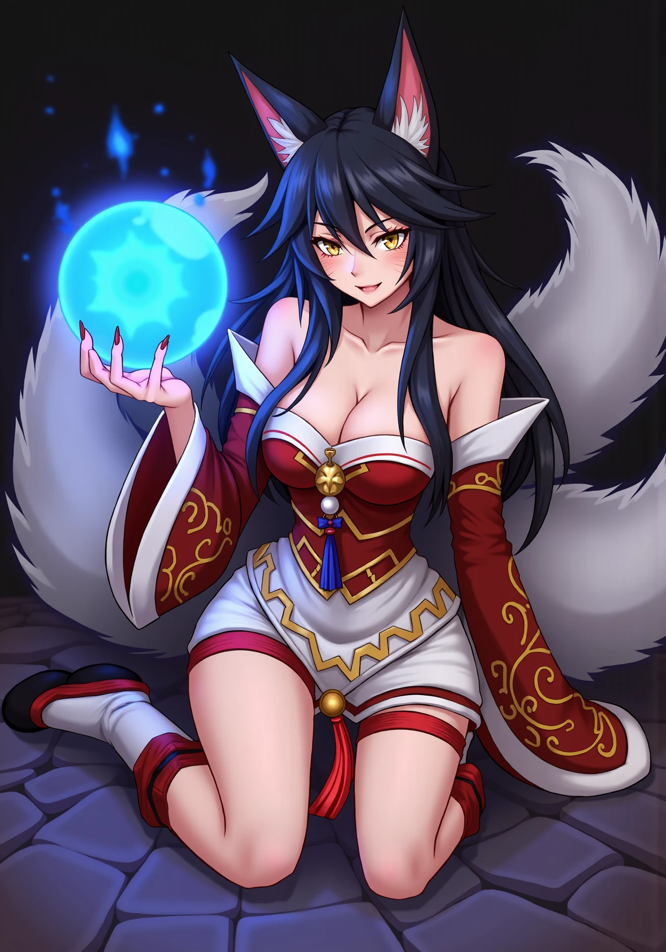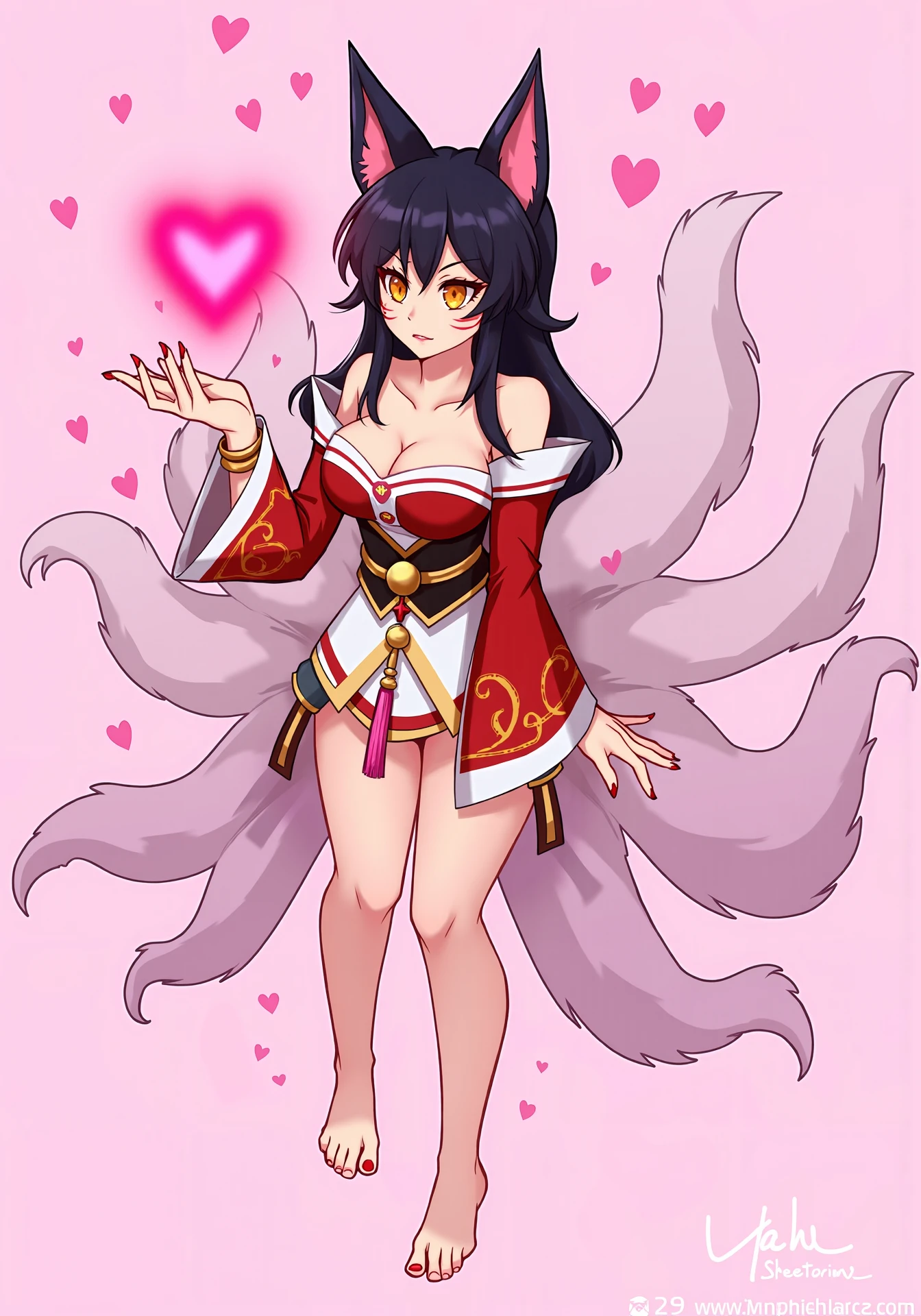 ahriDefault,1girl, black hair,yellow eyes,black hair,whisker markings,yellow eyes,long hair,multiple tails,fox ears,white fox tail,large breasts,red nails