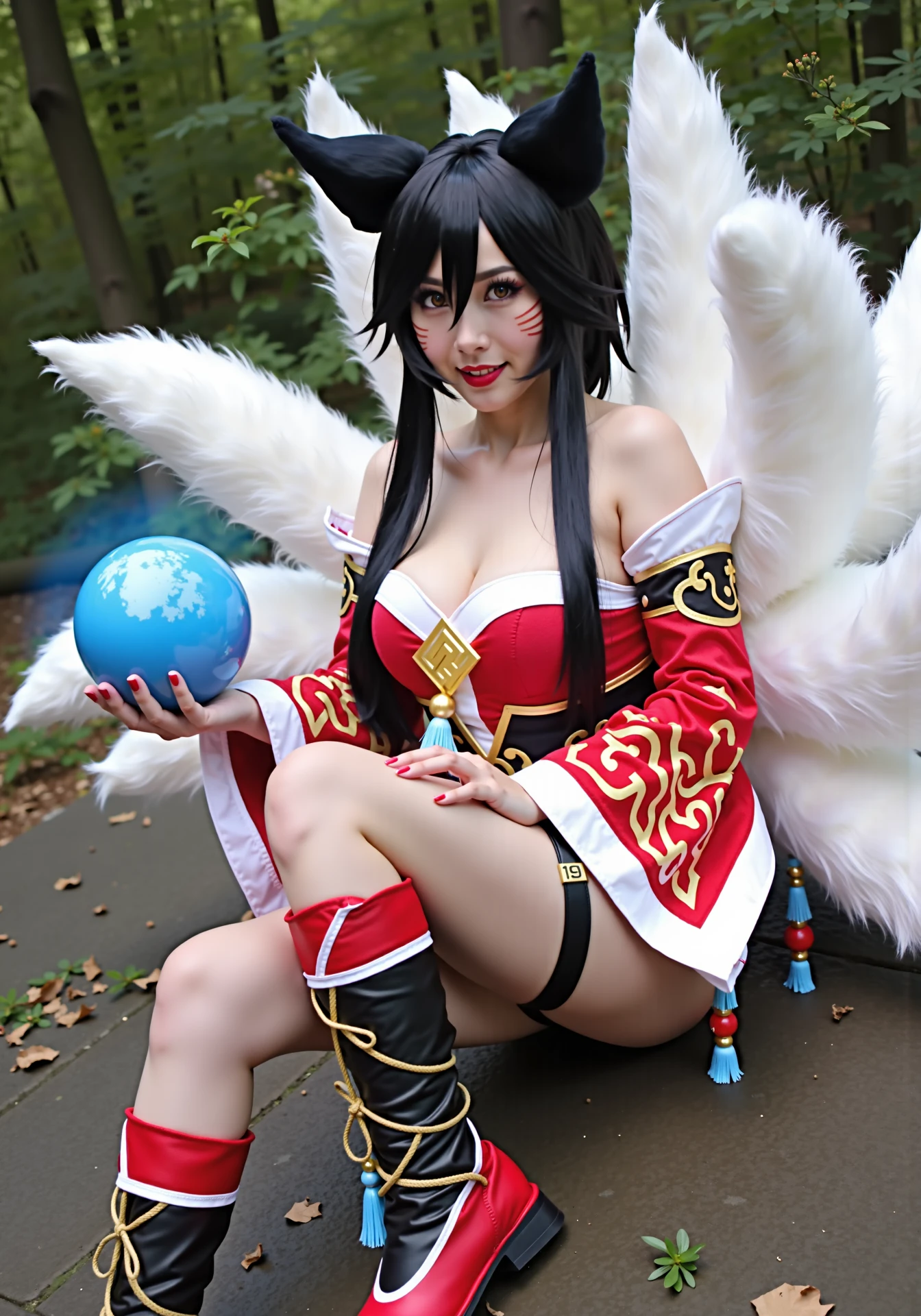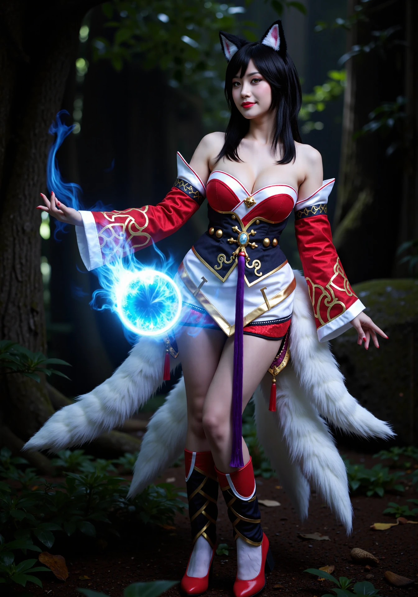 ahriDefaultReal,a woman,cosplay photo,realistic,black hair,yellow eyes,black hair,whisker markings,yellow eyes,long hair,multiple tails,fox ears,white fox tail,large breasts,red nails