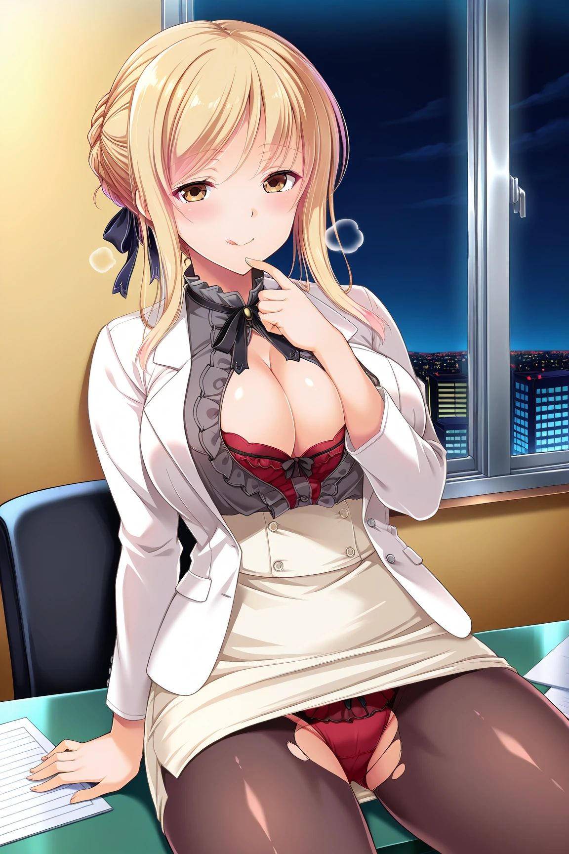 YoukoSensei,buttoned shirt, dark_grey_shirt, center frills, white_suit, open_suit, long_sleeves, pencil_skirt, pantyhose, tie_ribbon, black_necktie