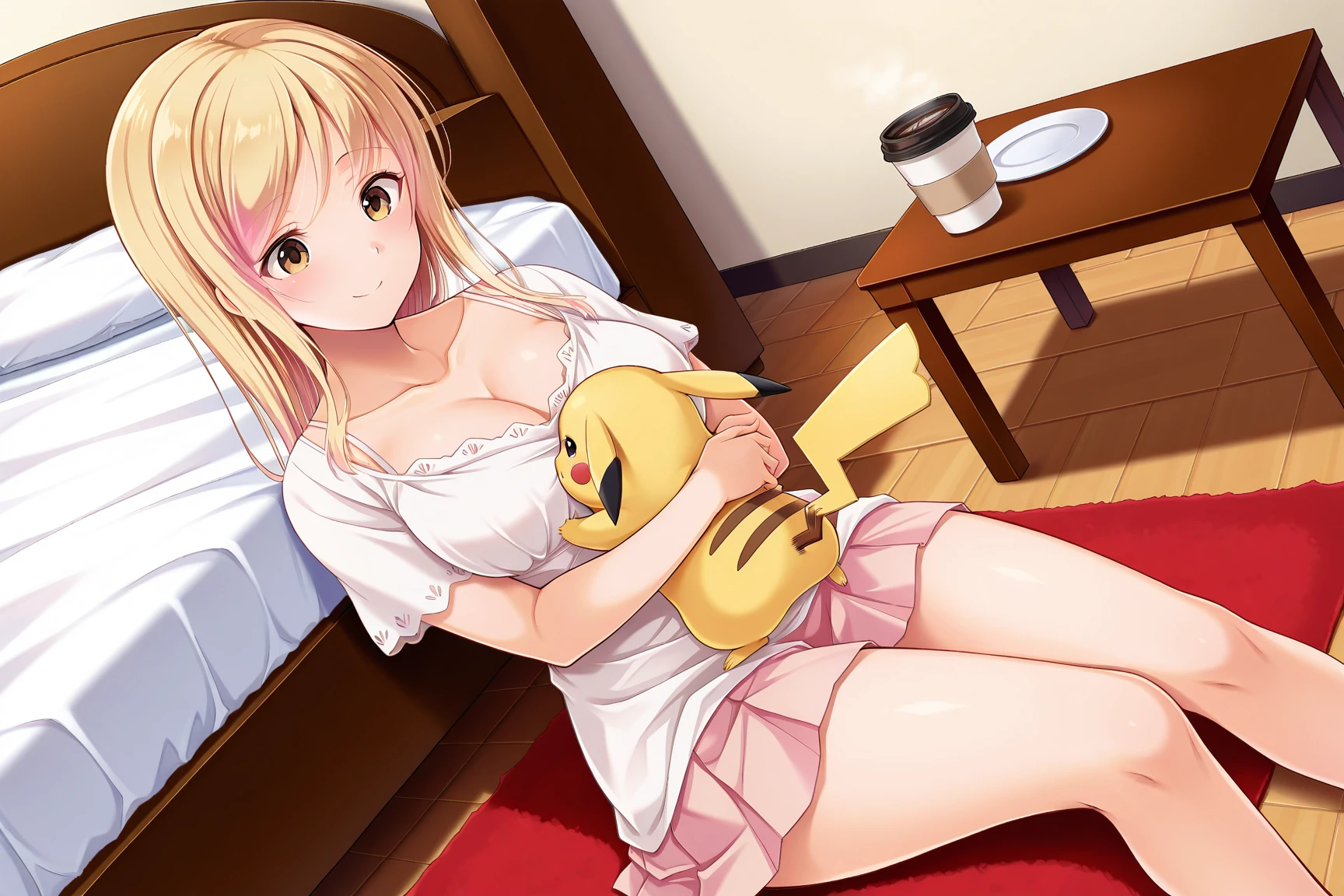 YoukoHomeCasual, white dress, short_dress, collarbone, short sleeves, cleavage, miniskirt, frills, pleated skirt, pink skirt,