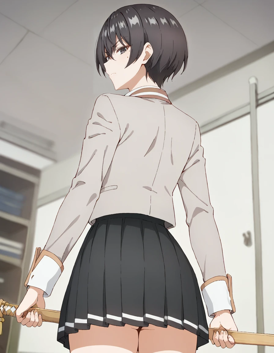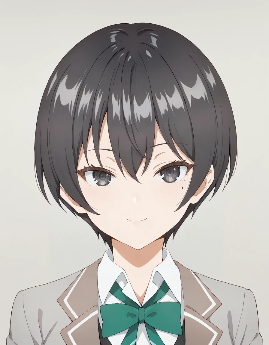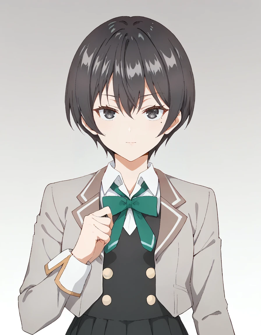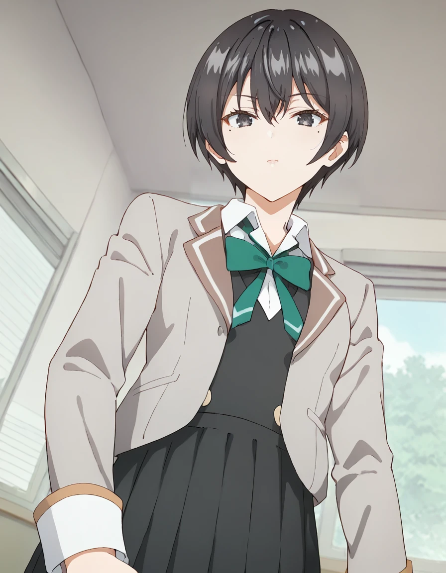 chisaki sarashina, black hair, short hair, hair between eyes, black eyes, (mole under eye:0.7)Outfit - School Uniform: