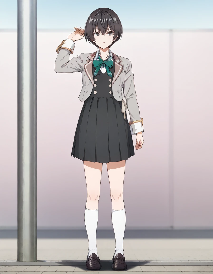 school uniform, grey jacket, open jacket, long sleeves, green bow, white shirt, collared shirt, black vest, buttons, black dress, white kneehighs, black loafersDescription