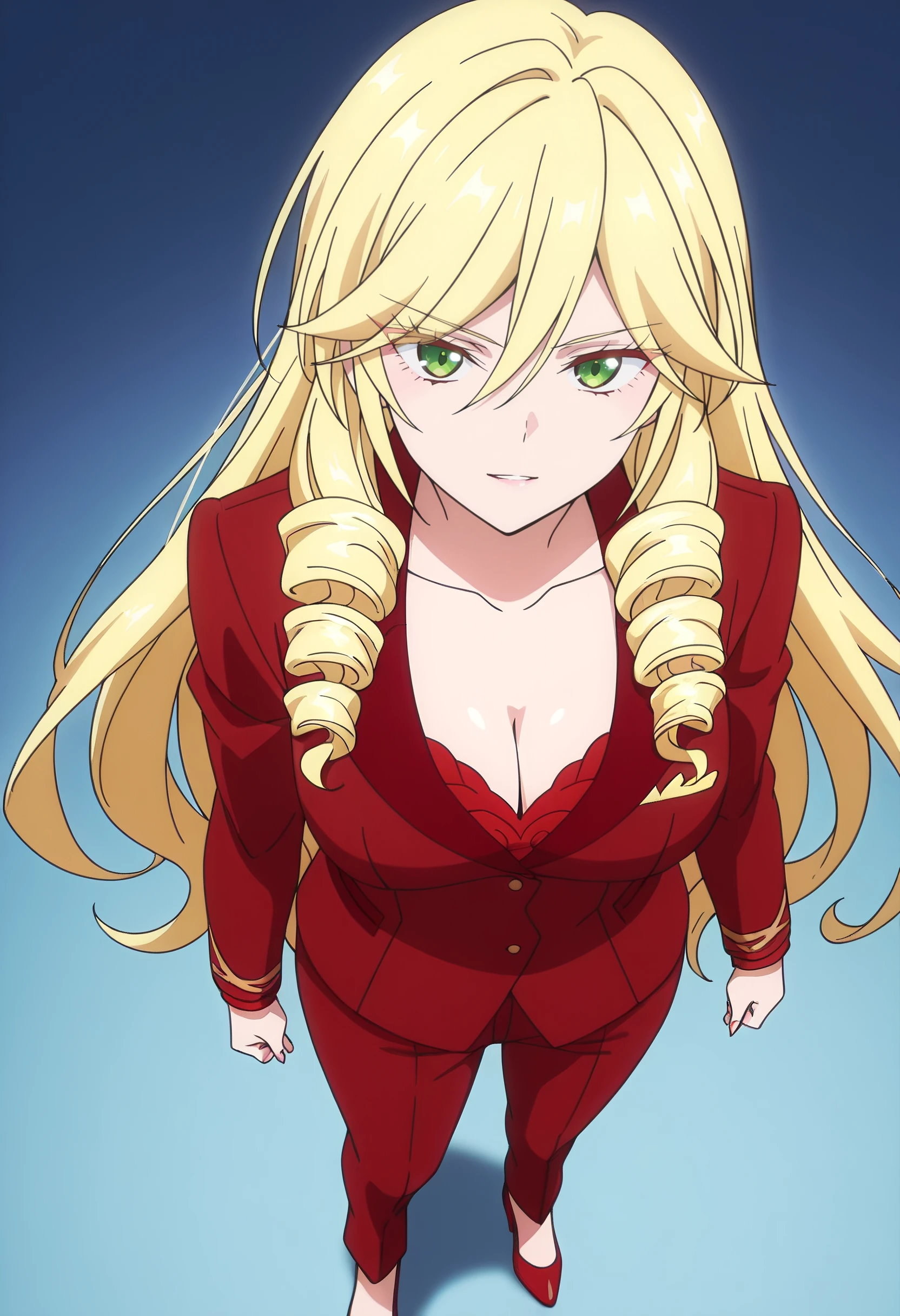 ScarletFormal, ringlets, cleavage, collarbone, jacket, shirt, formal, suit, long sleeves, red jacket, pants, red pants, high heels, shoes,