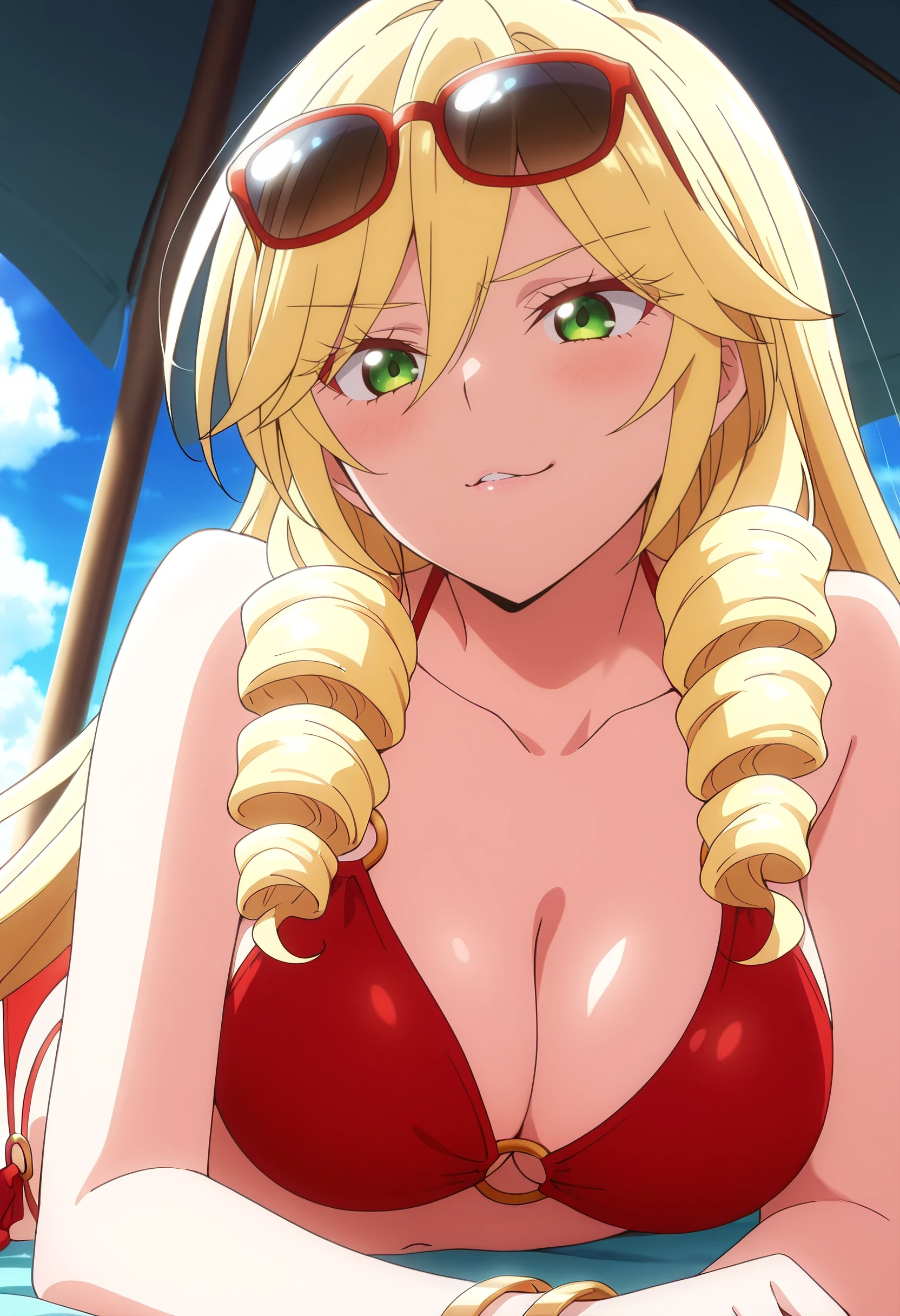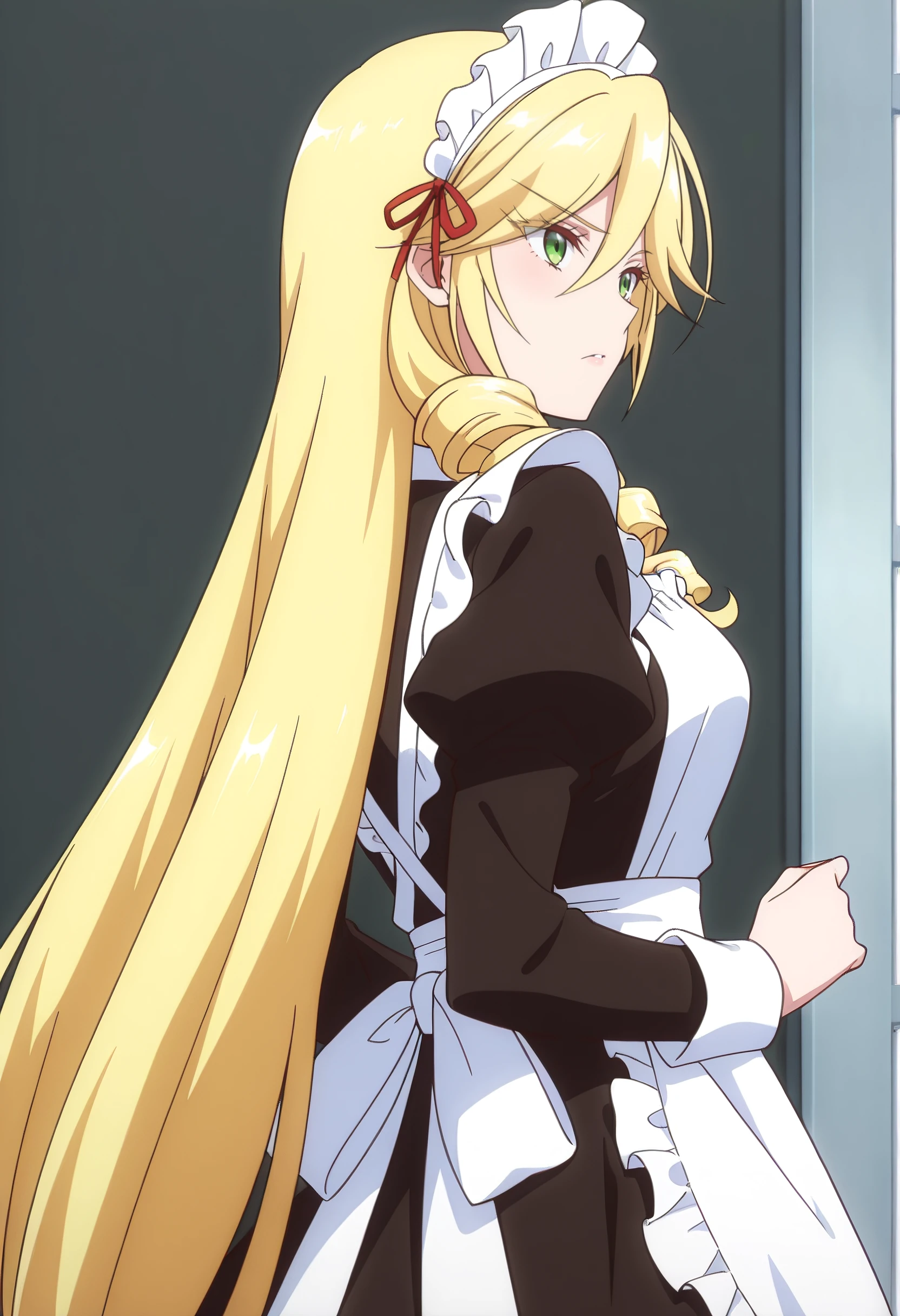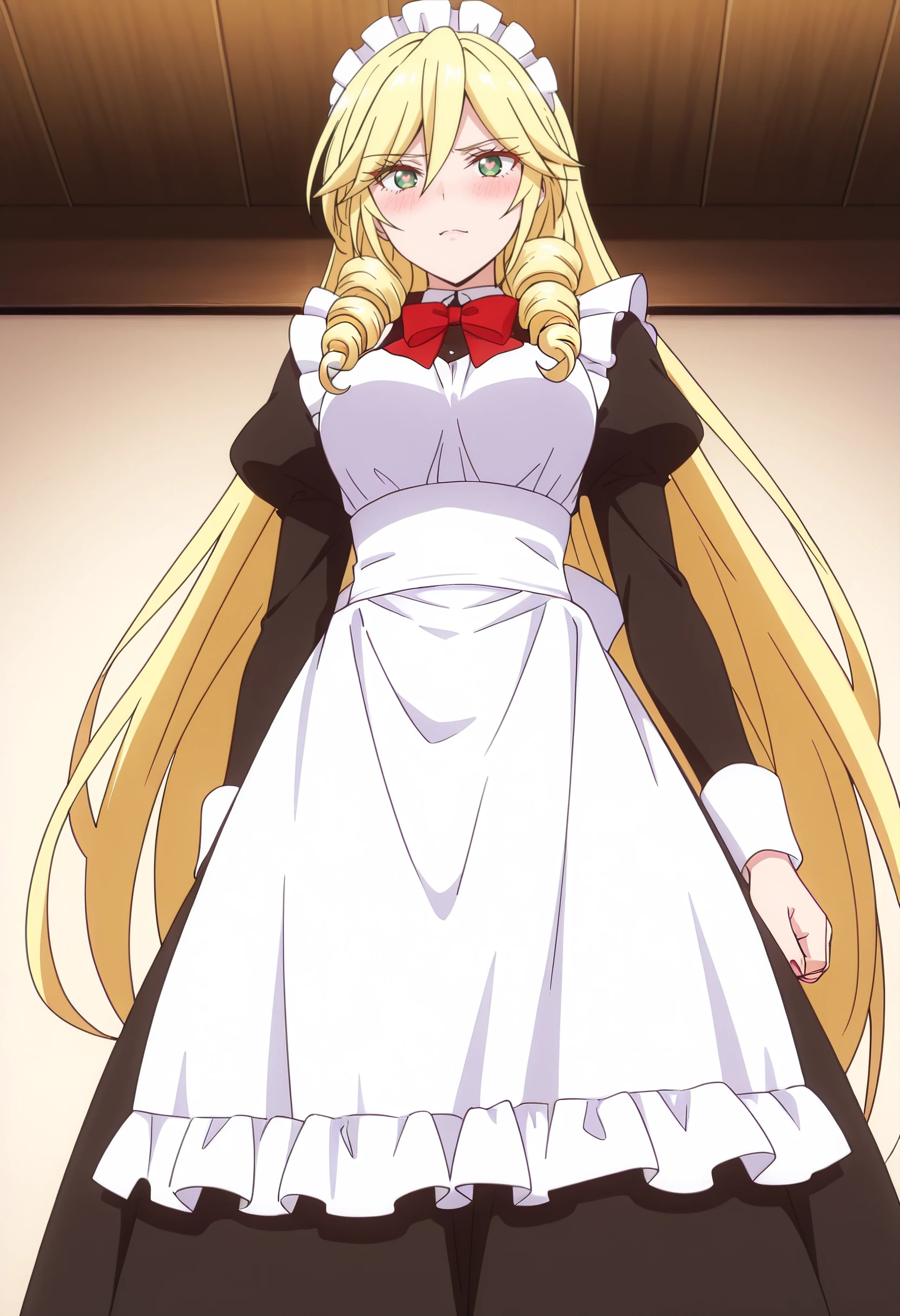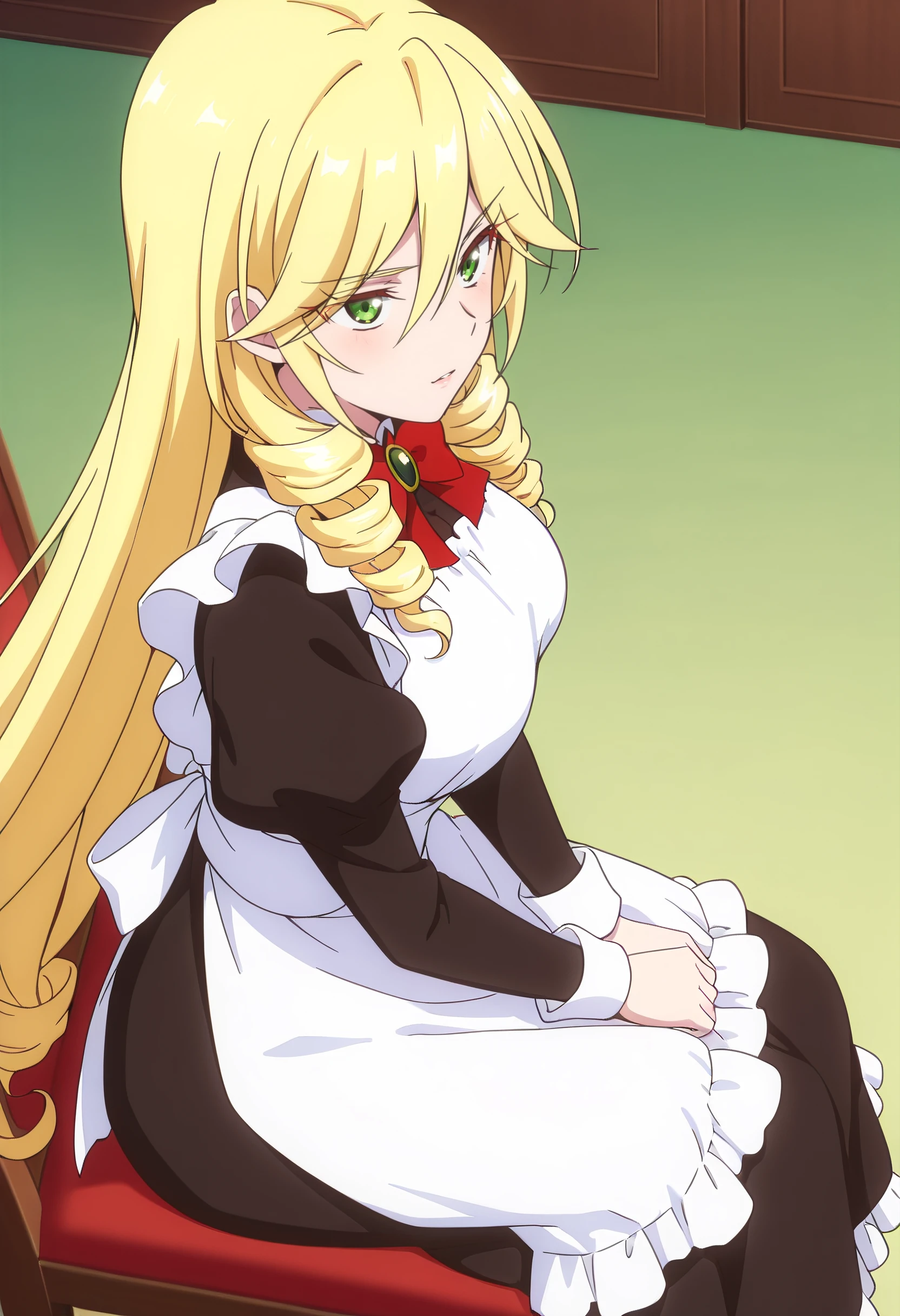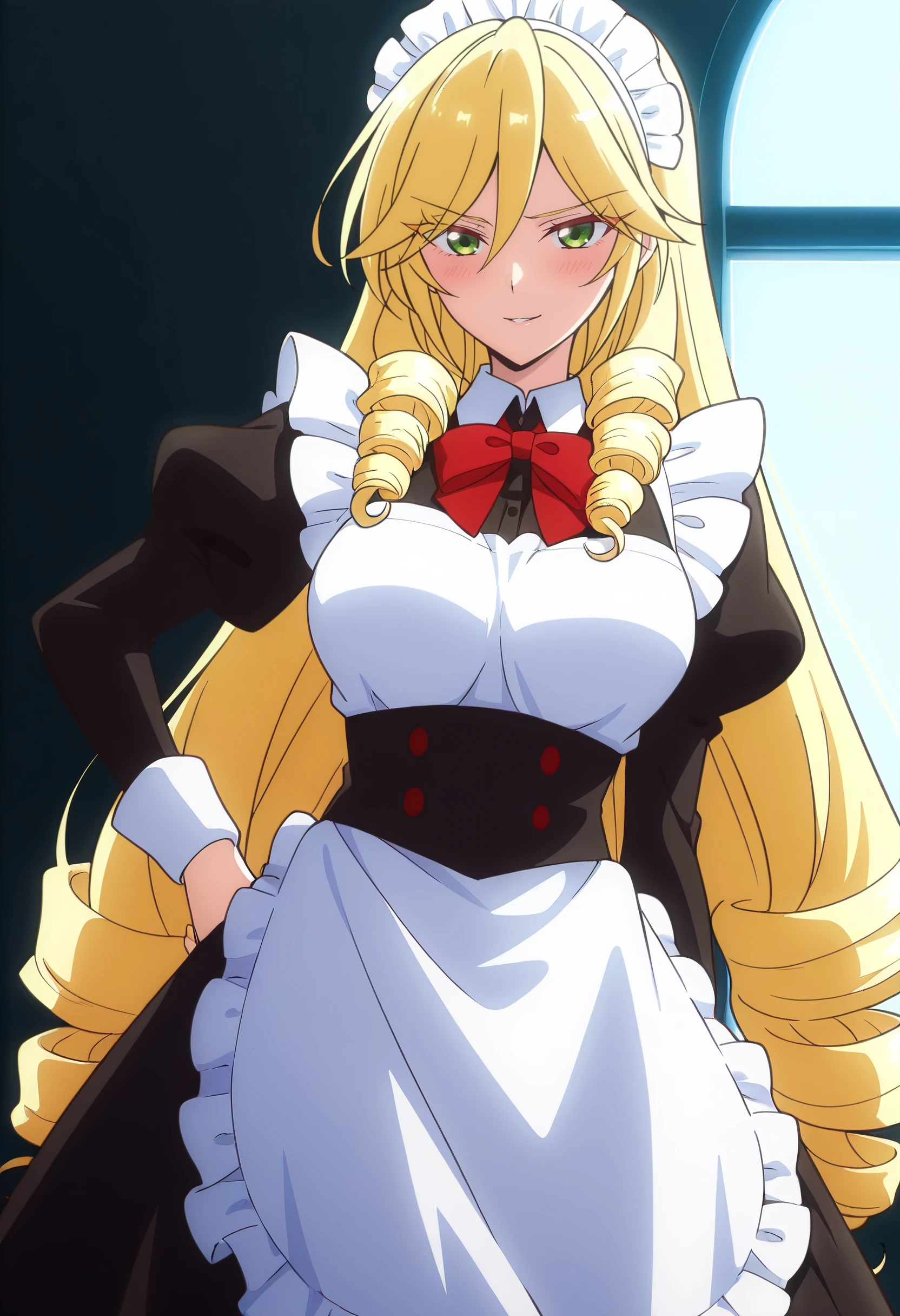 BYNScarlet, blonde hair, long hair, drill hair, green eyes, very long hair, hair between eyes, eyebrows visible through hair, bangs, curly hair, twin drills,