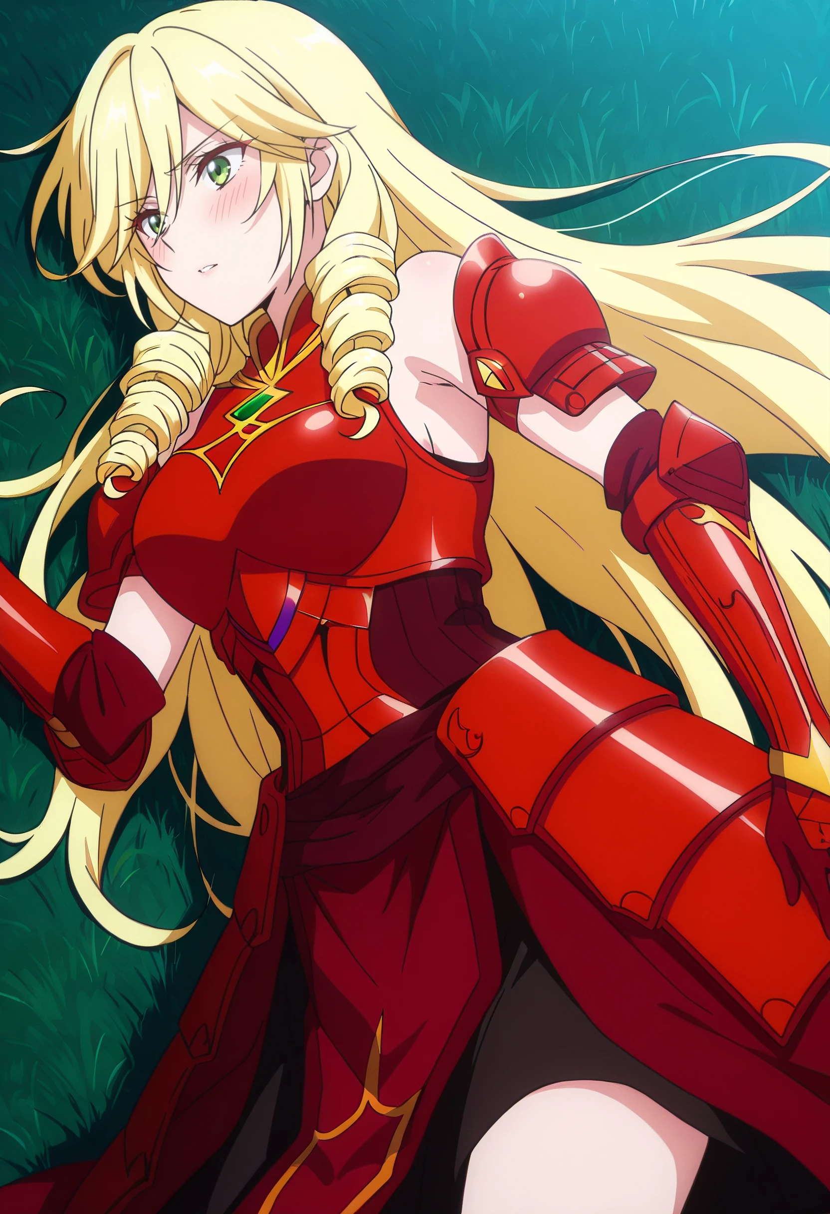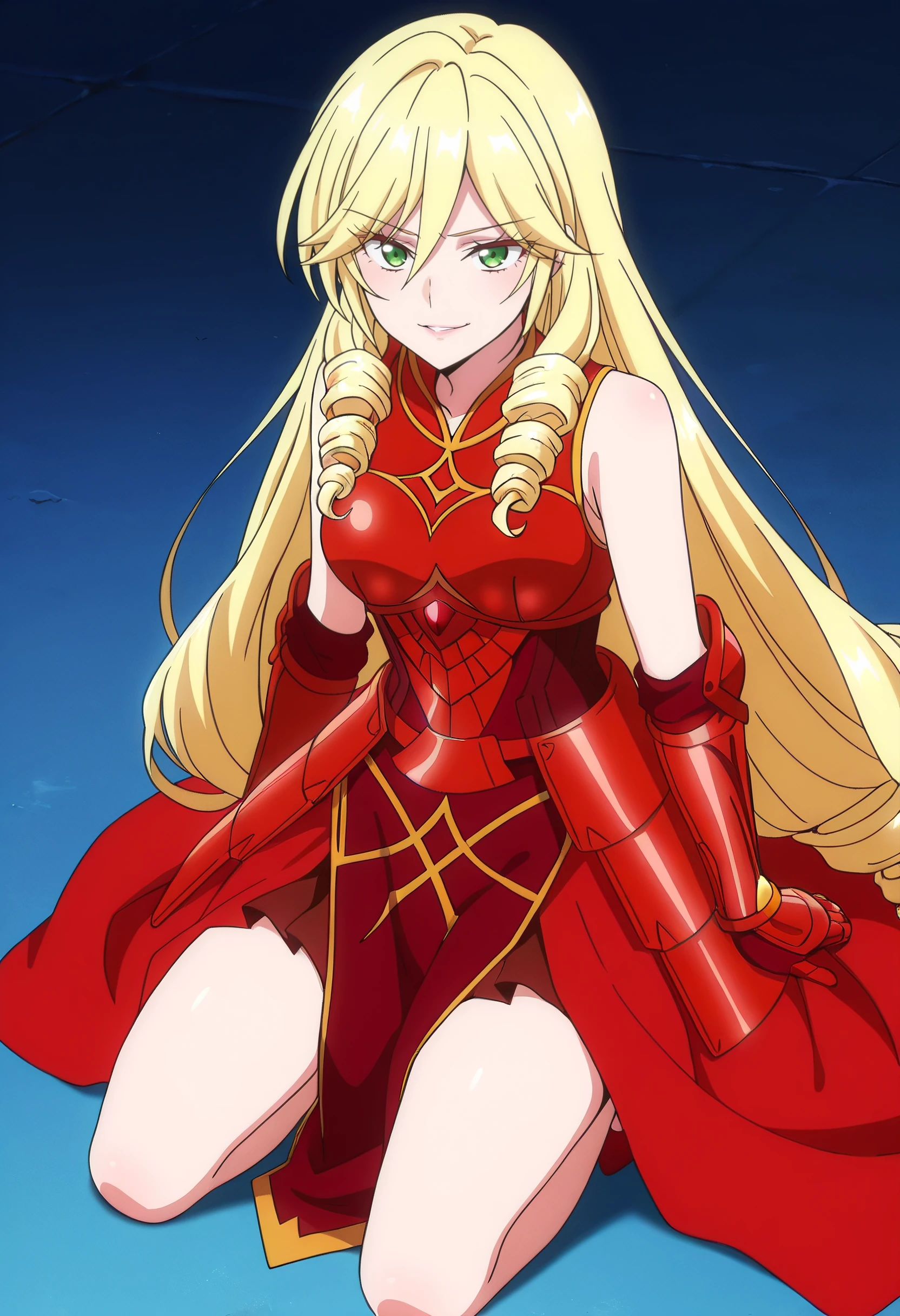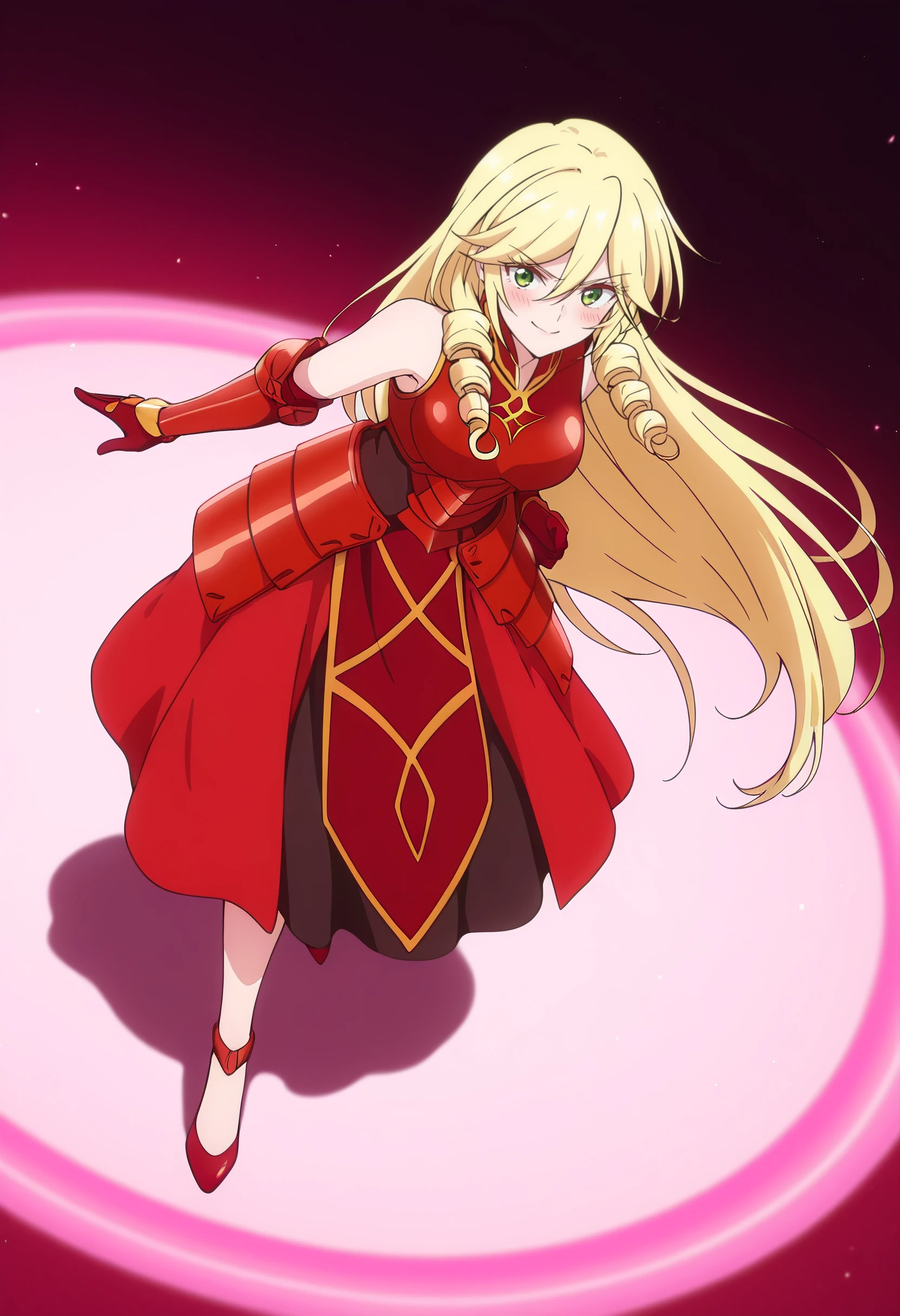 ScarletDress, dress, sleeveless, red dress, bare shoulders, ringlets, gloves, sleeveless dress, skirt, red footwear, shoes, high heels, elbow gloves, collarbone, armor, armored dress, breastplate,
