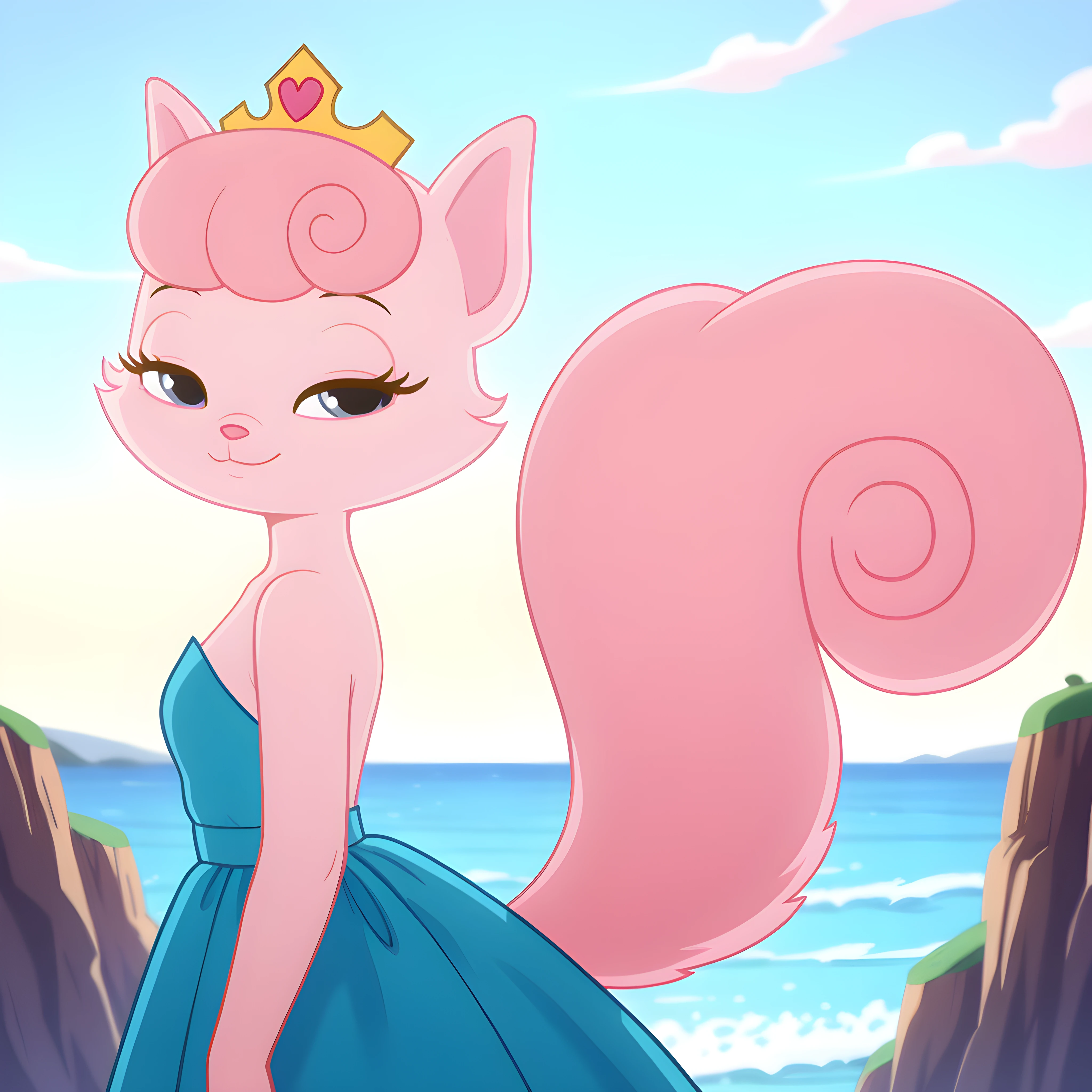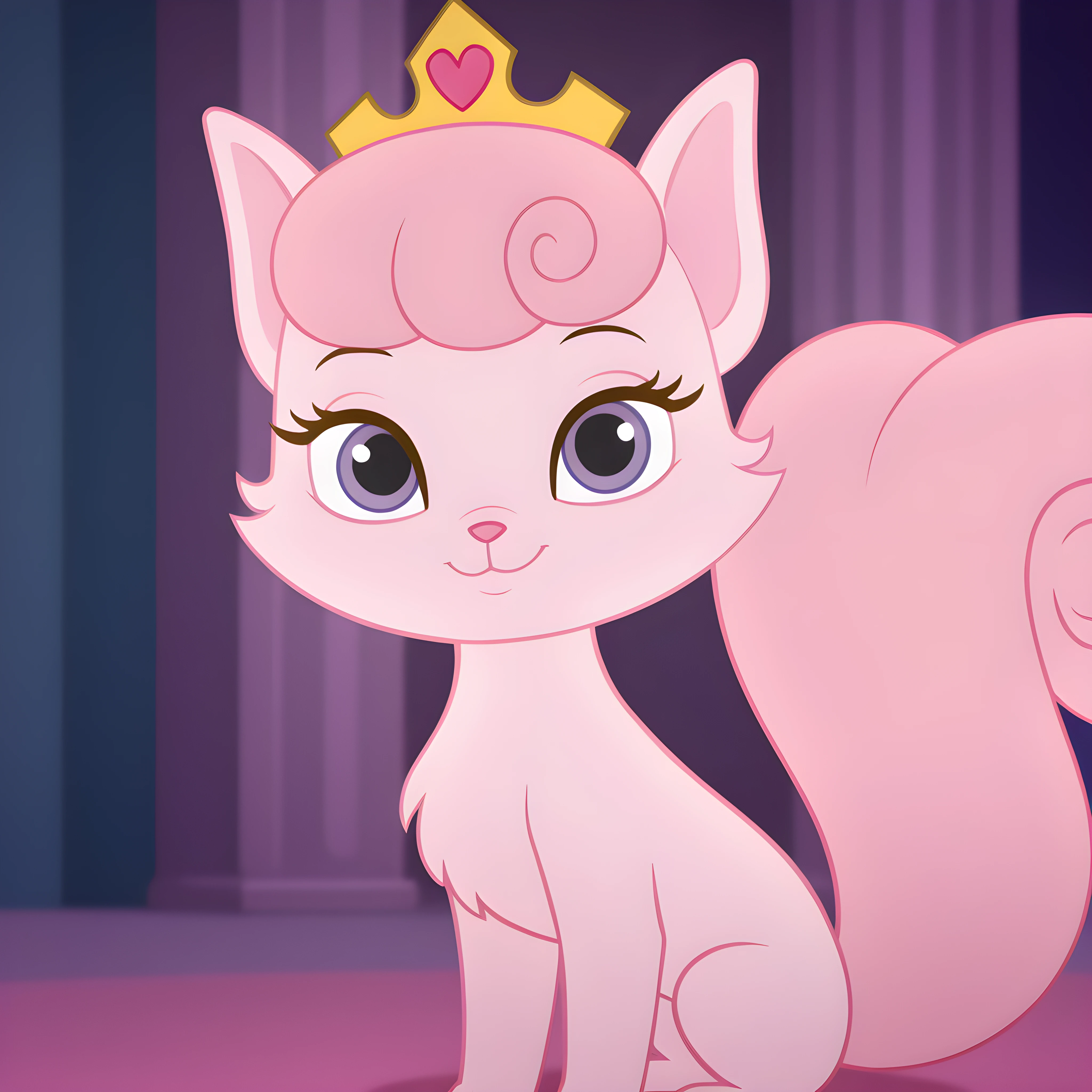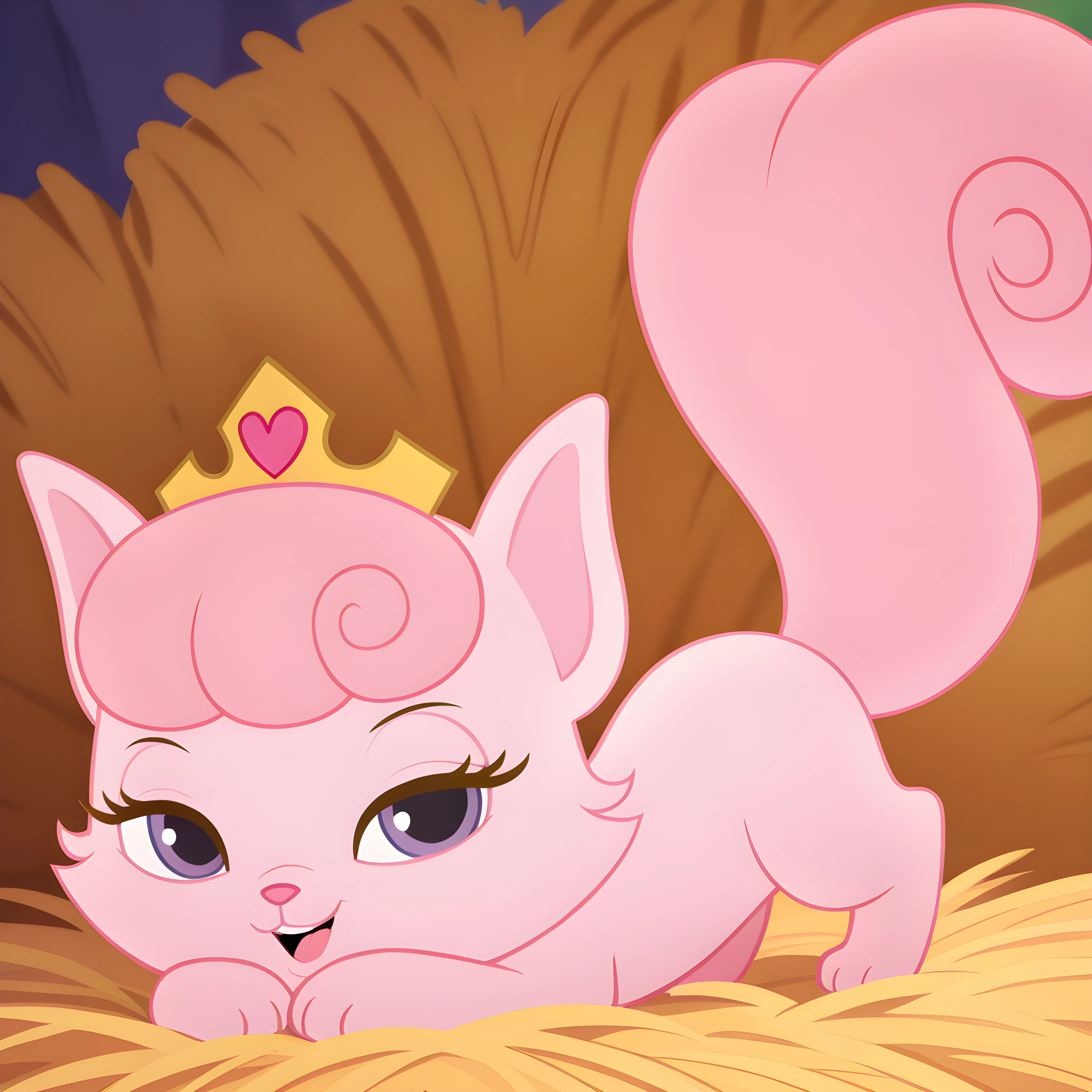 pink fur, pink nose, purple eyes, long eyelashes, pink hair, curly hair, bangs, huge tail, bushy tail, curled tail, fluffy tail, tiara, gold crown, gold crown with heart gem,