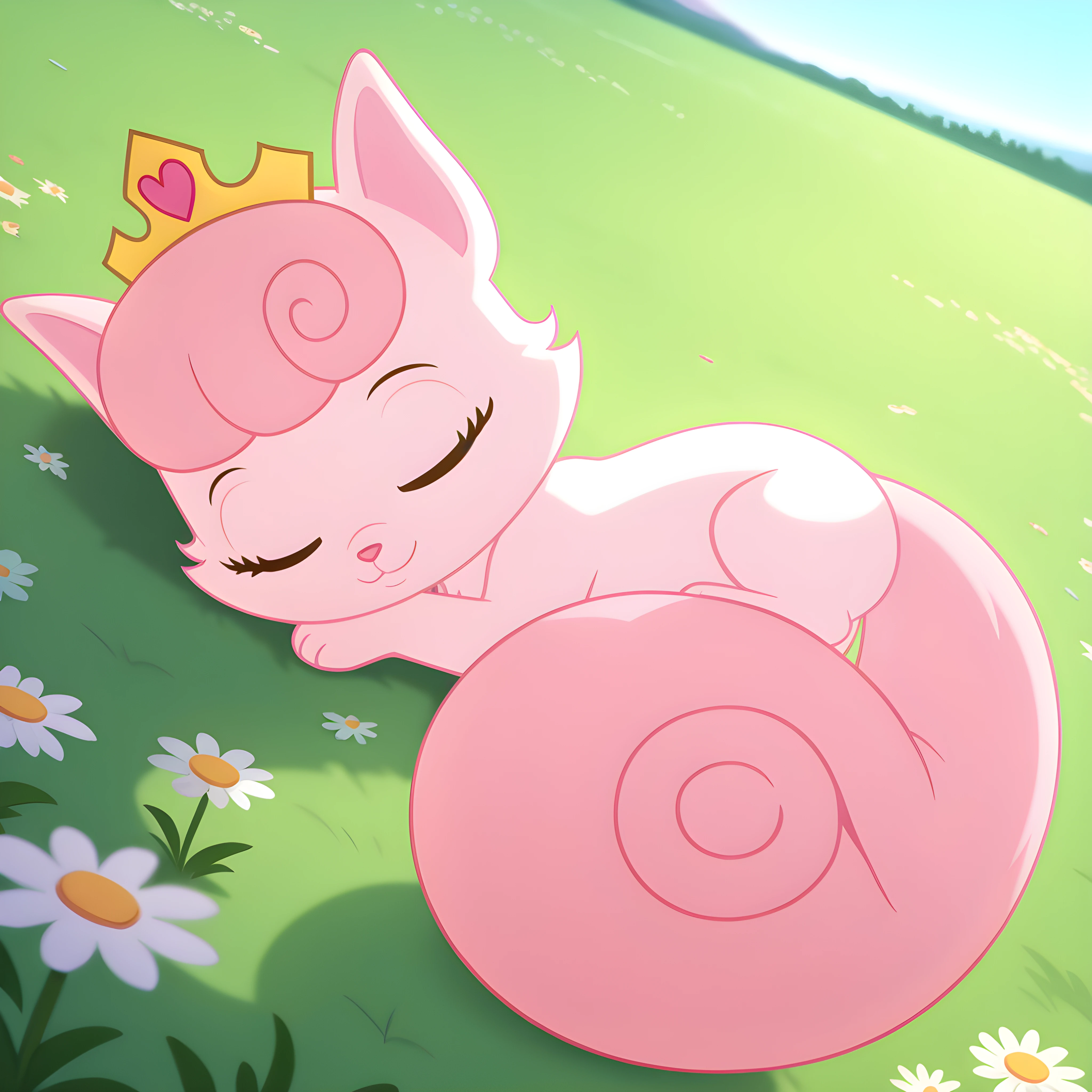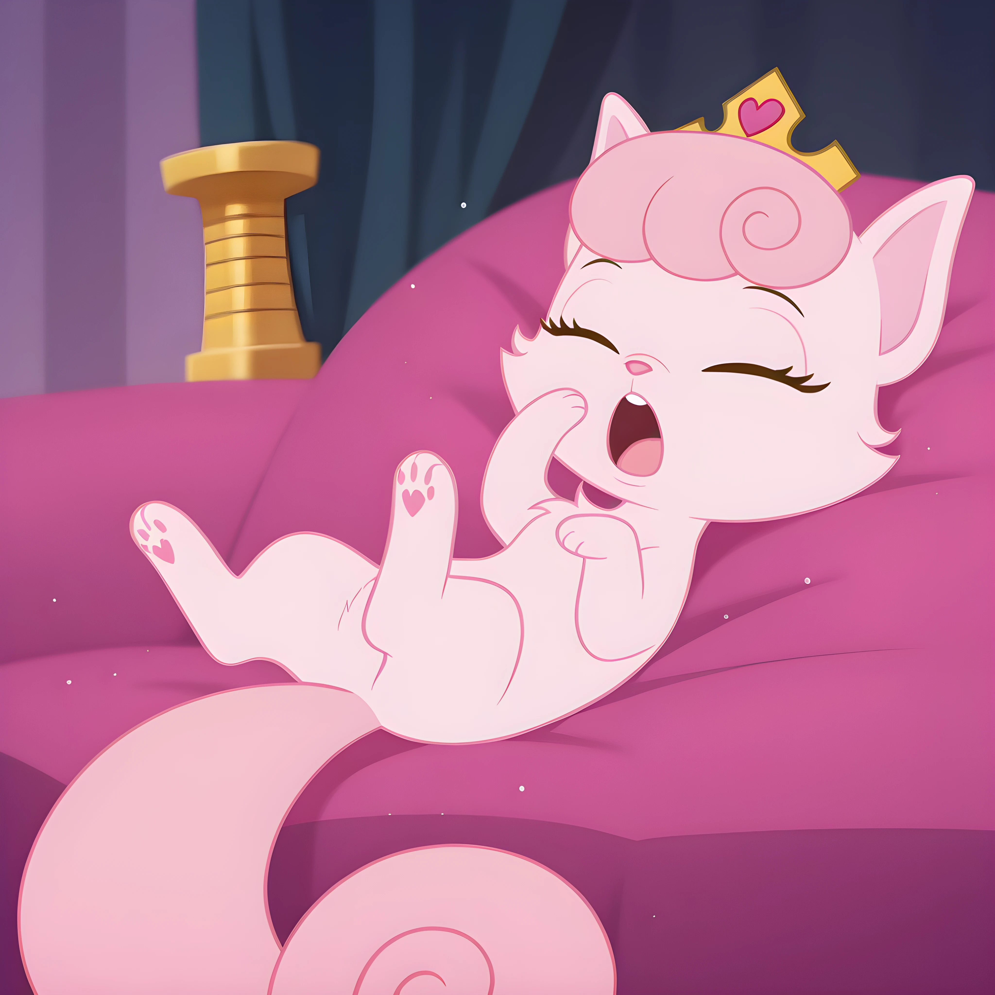 pink fur, pink nose, purple eyes, long eyelashes, pink hair, curly hair, bangs, huge tail, bushy tail, curled tail, fluffy tail, tiara, gold crown, gold crown with heart gem, still has problems with the Hair swirls and sometimes still makes two on both sides even though it's only on one side.