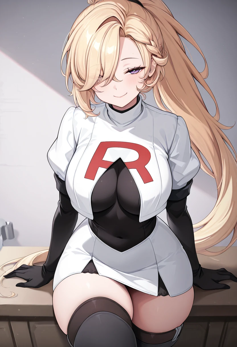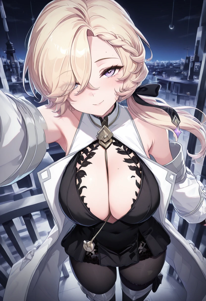 zzCoronis, purple eyes, hair between eyes, hair over one eye, blonde hair, long hair, ponytail, braid, hair ribbon, open clothes, off shoulder, black pantyhose, clothing cutout, black ribbon, thigh strap, short dress, cleavage cutout, white jacket, between breasts, black bridal gauntlets, black dress, white coat, thighband pantyhose,