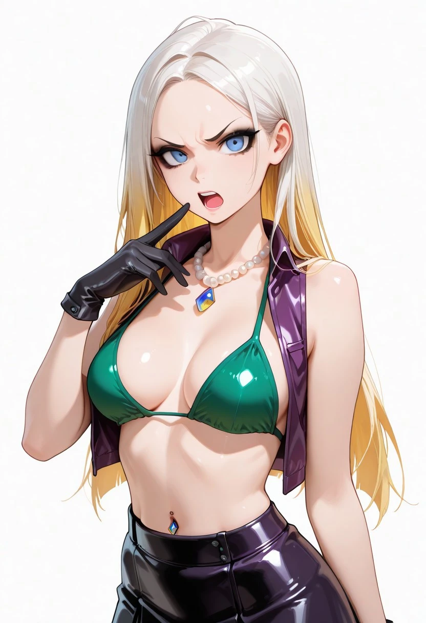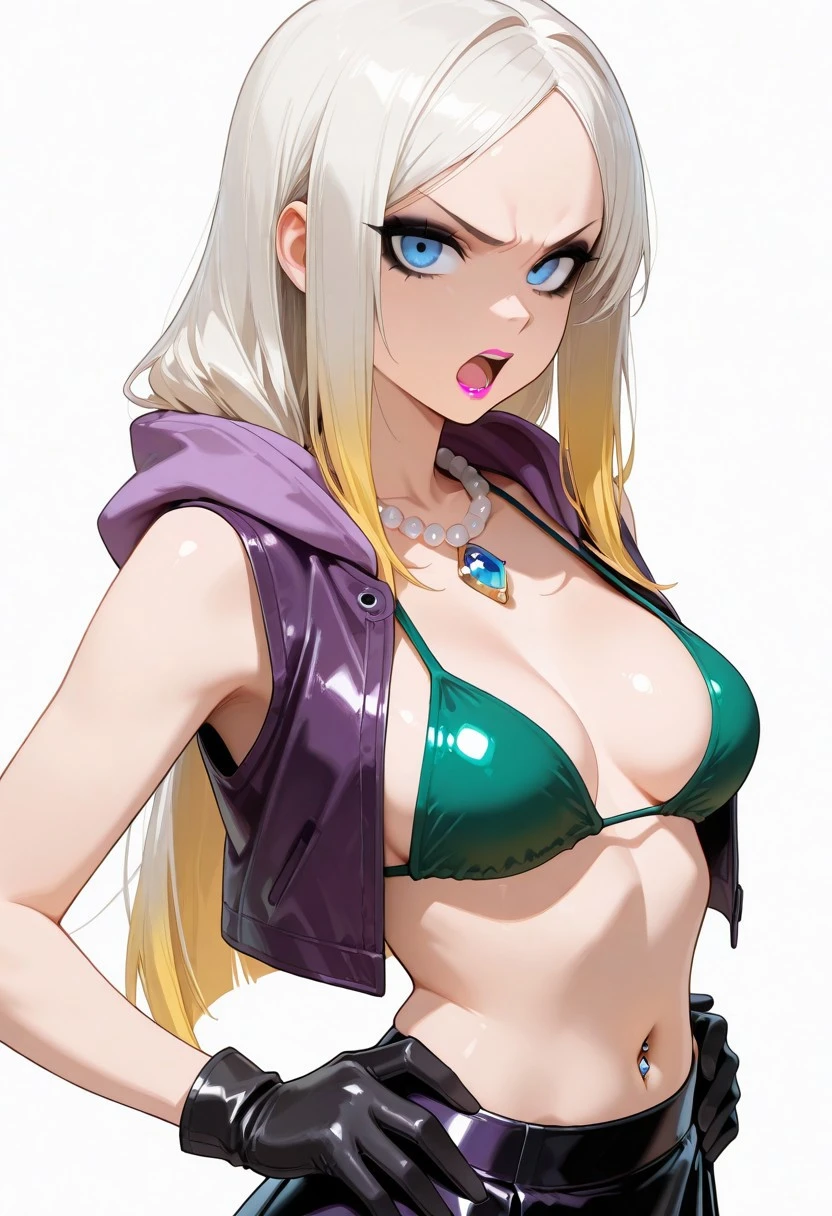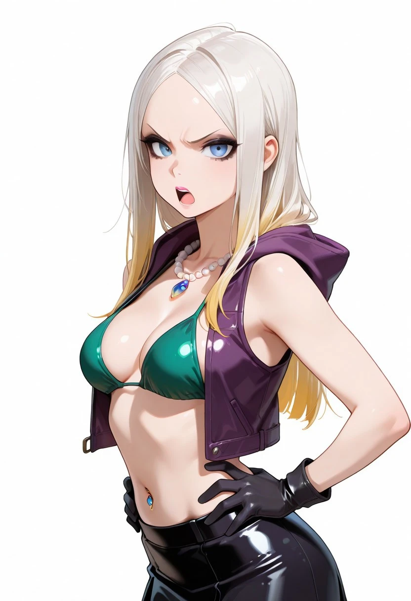 (navel_piercing(gem_piercing)), simple pearl necklace with blue gem, (girl clothes :((full open vest, purple vest with little pocket, green bikini top under vest, sleeveless leather vest), navel, black mini-skirt, no panties, medium breasts, black gloves),