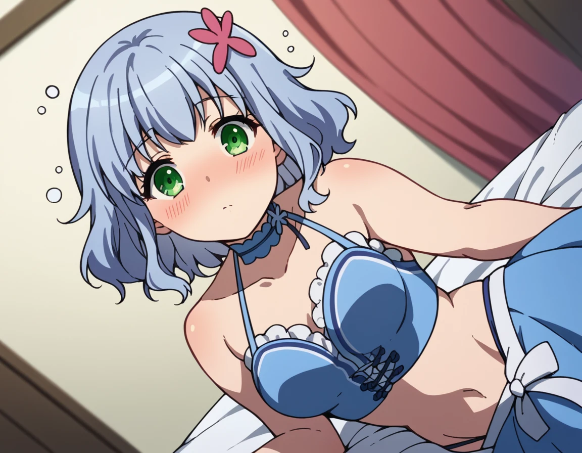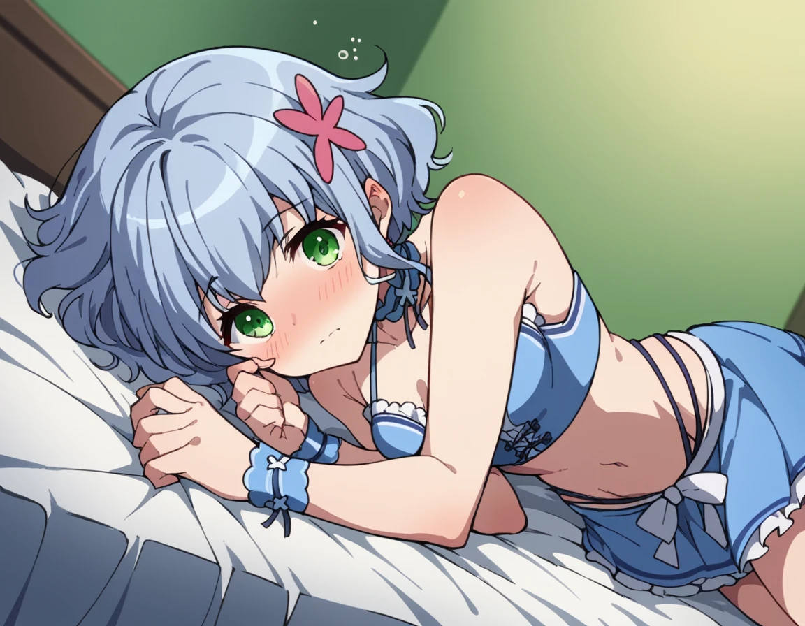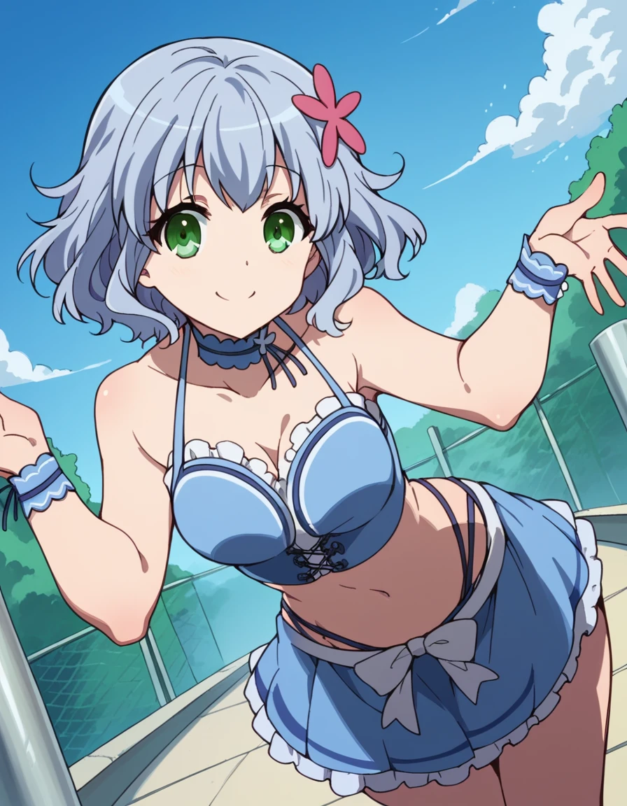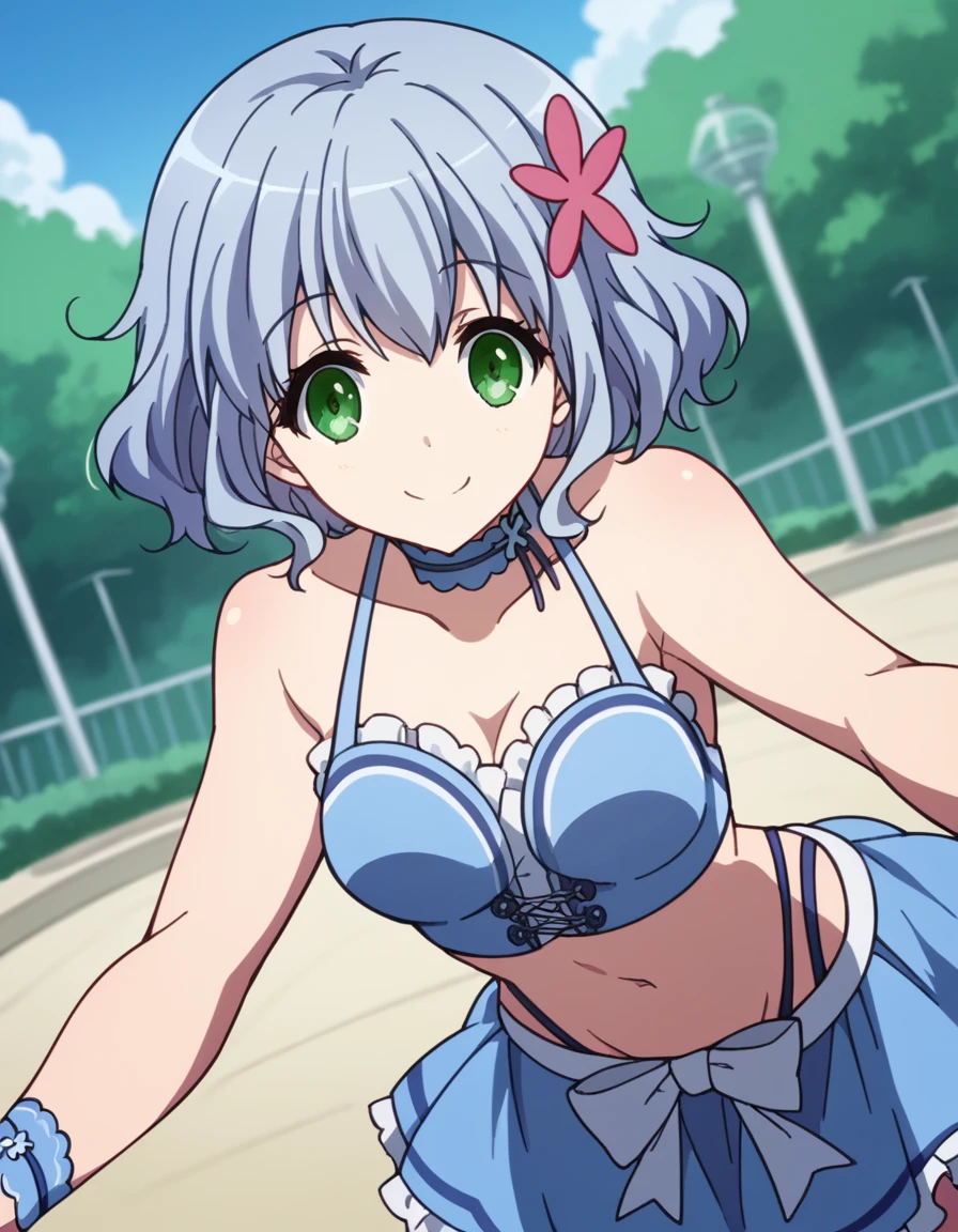muse, blue hair, green eyes, short hair, hair ornament,
