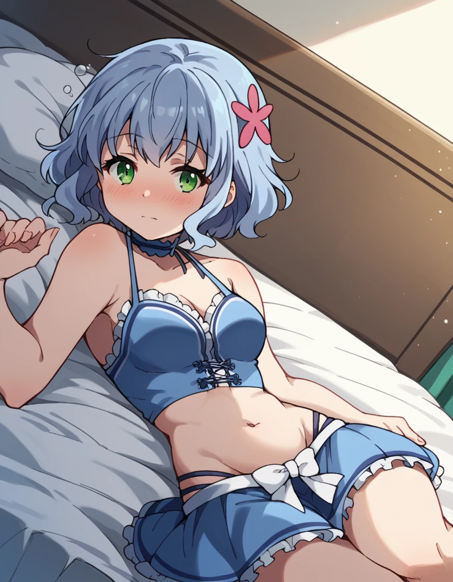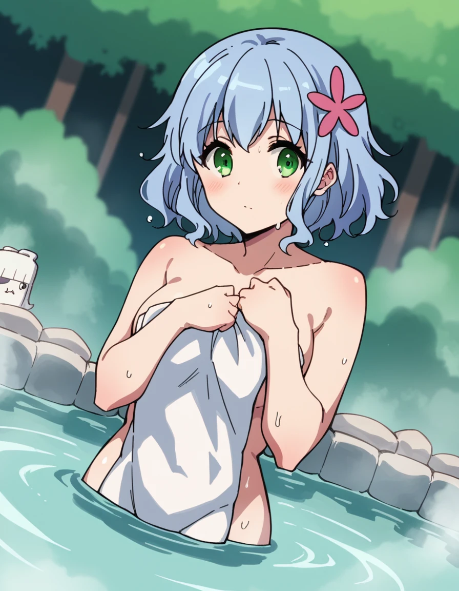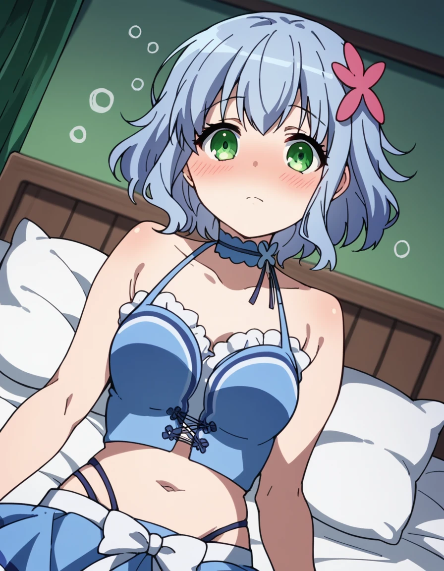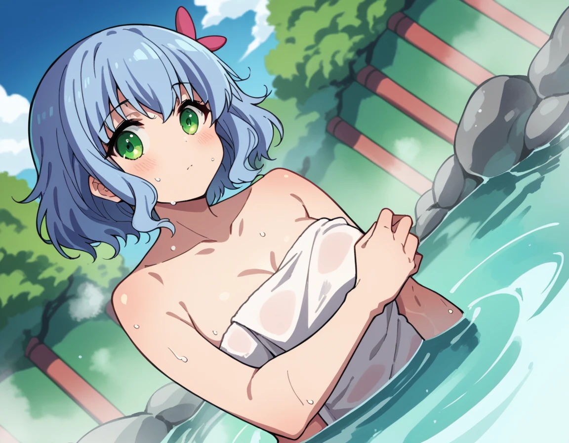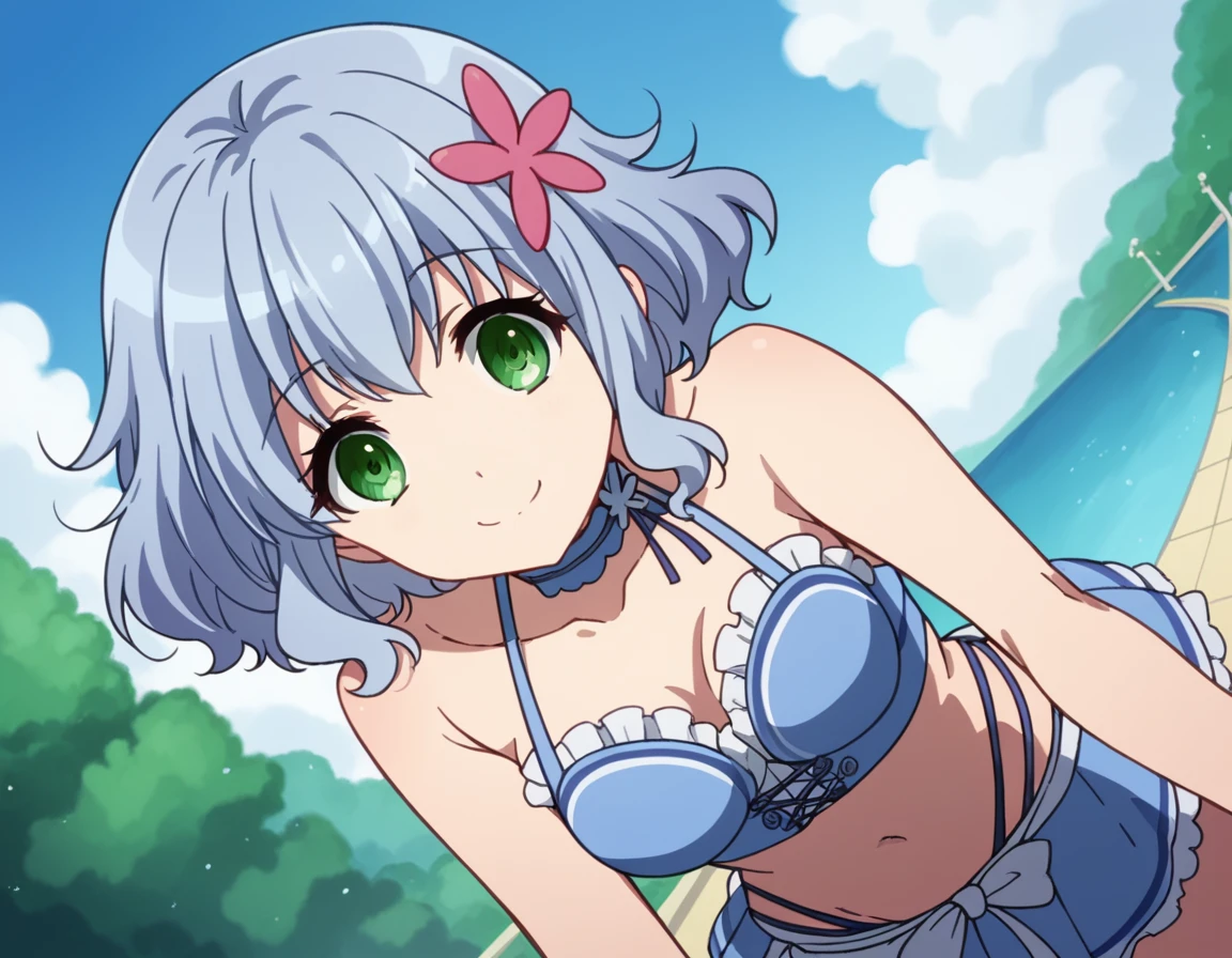 muse, blue hair, green eyes, short hair, hair ornament,