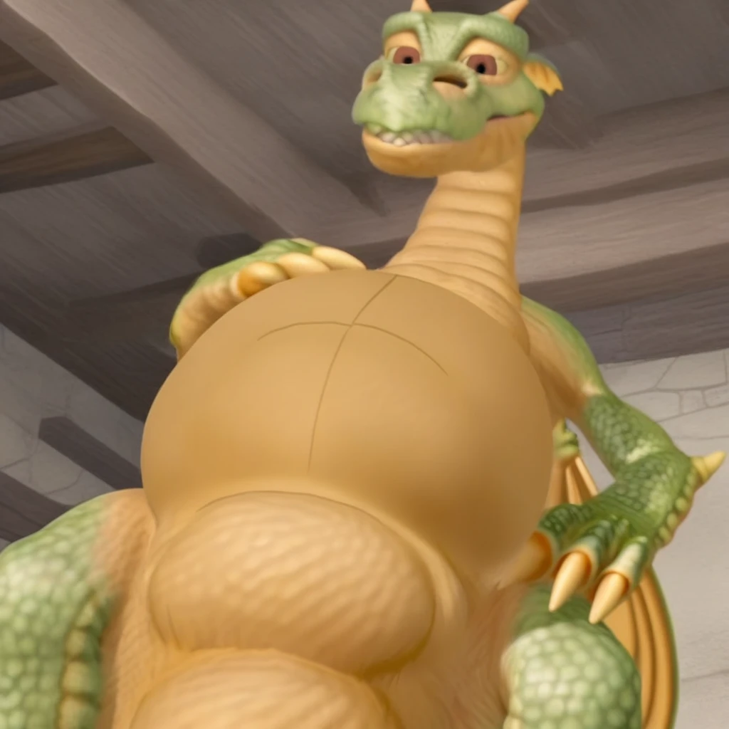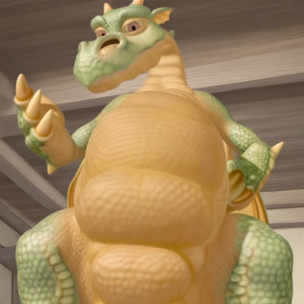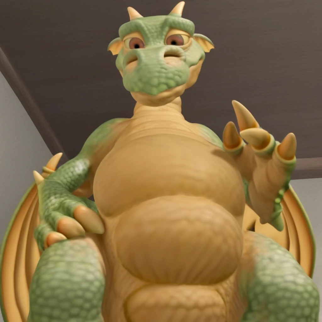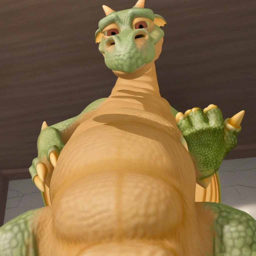 Tags: Jane's Dragon, dragon, scalie, male, feral, green scales, yellow inner scales, yellow belly scales, small head wings, long tail, horns, wings, big eyes, brown eyes, big mouth, big snout, nostrils, wings, large wings, arms, hands, 5 fingers, claws, sharp claws, sharp teeth, large feet, chubby, belly, 3D