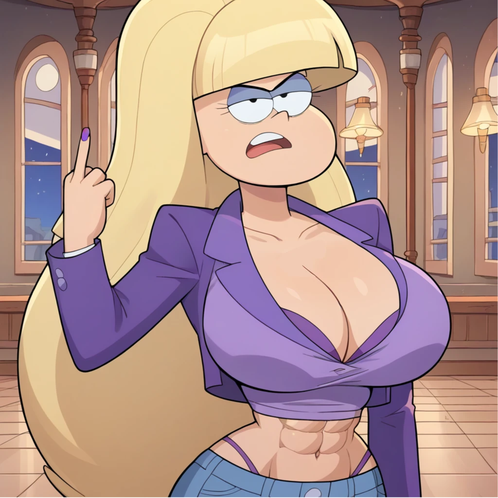 Pacifica Northwest, long blonde hair, bell-shaped hair, thin waist, hips showing, collarbone showing, 2d, cartoon, cartoon face, naked, completely naked, unnatural proportions , (((small hips, micro waist, narrow hips, small pelvis, narrow pelvis))), pink nipples, hoop earrings, black pupils, purple eyelids, massive breast, faintly shown abs, short stack, top-heavy woman, slim, thin, slender,