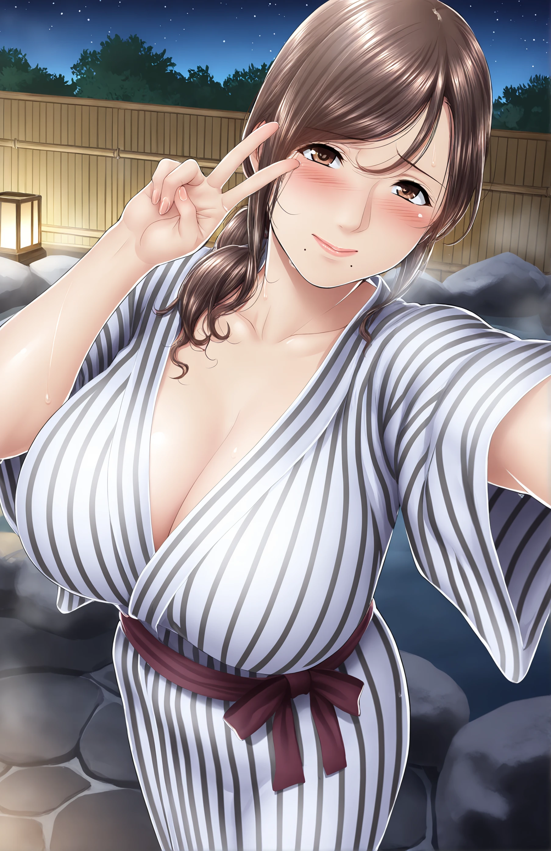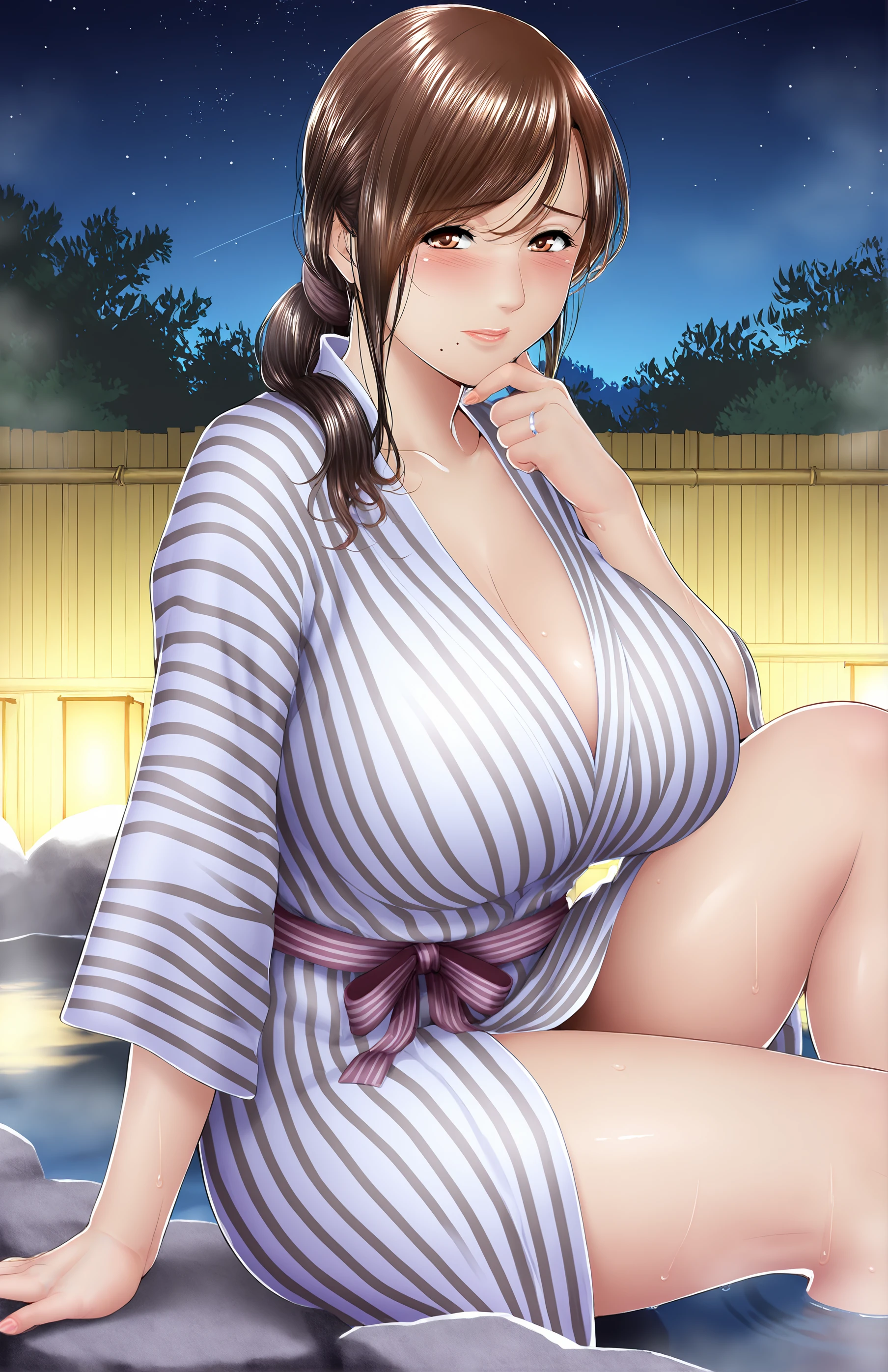 MomoseRieko, long hair, breasts, large breasts, brown hair, brown eyes, collarbone, ponytail, japanese clothes, striped, kimono, huge breasts, lips, mole under mouth, yukata, mature female, striped kimono, bath yukata