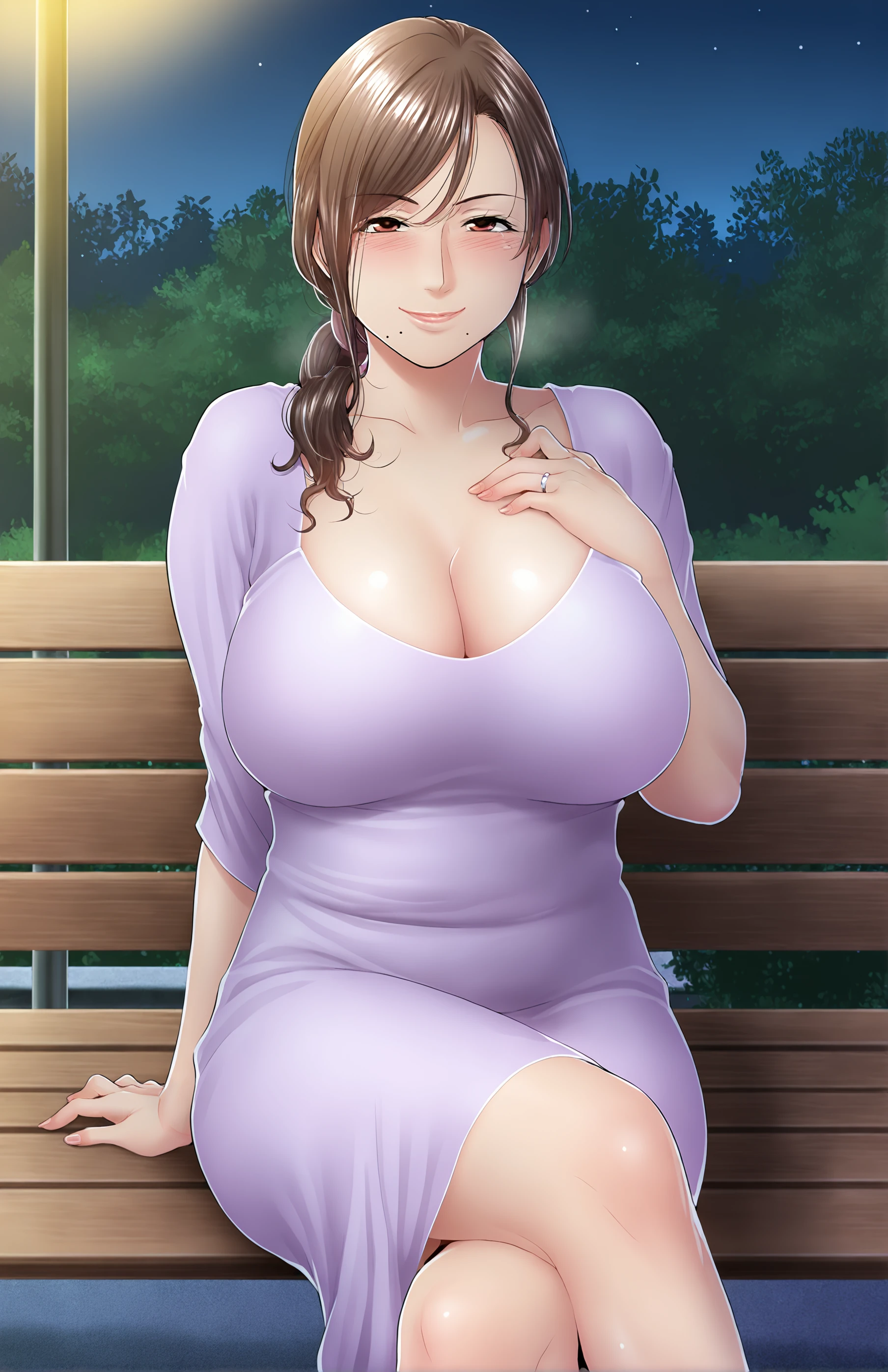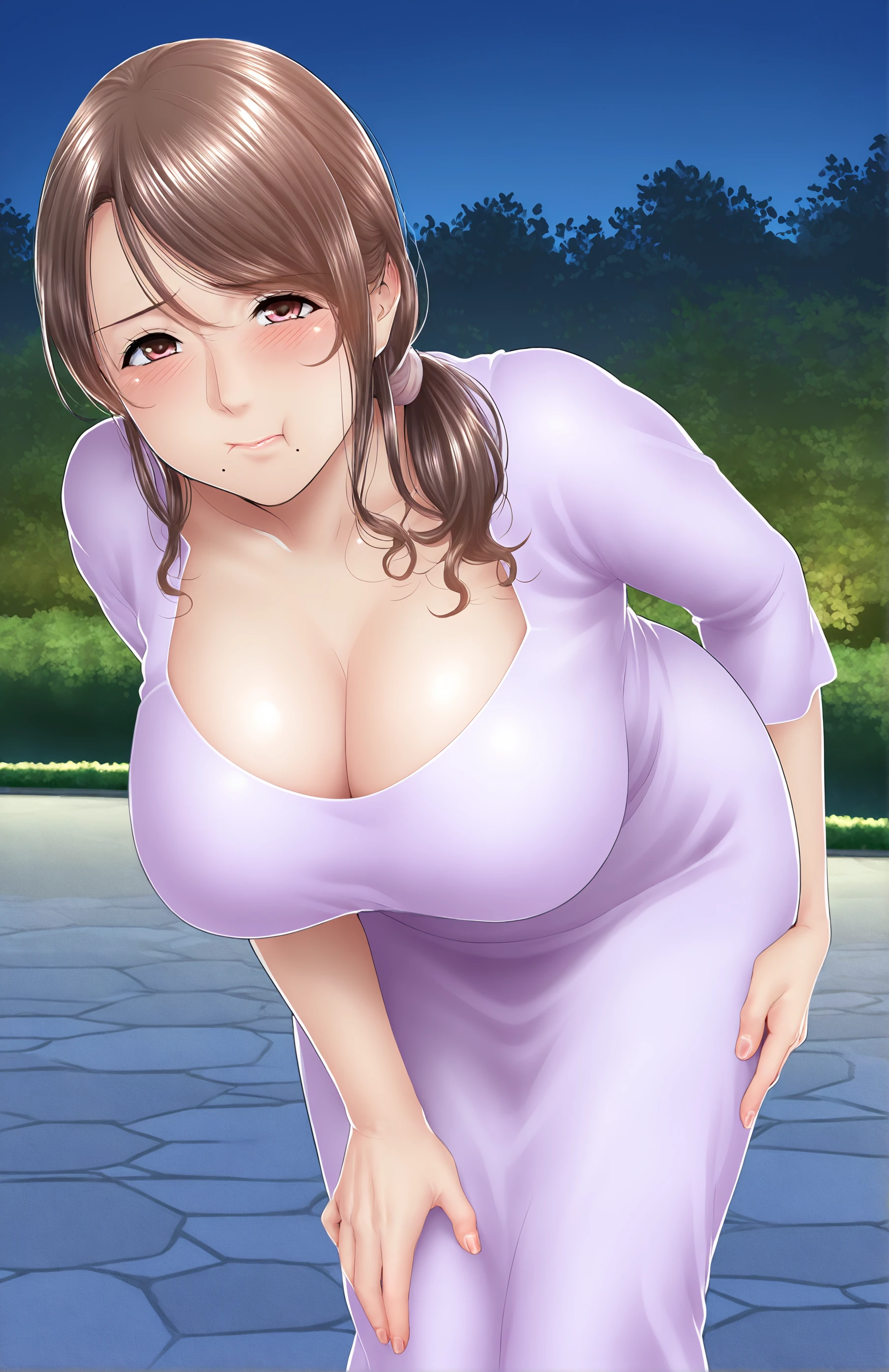 MomoseRieko, long hair, breasts, large breasts, brown hair, dress, cleavage, brown eyes, ponytail, mole under mouth, mature female, light purple dress