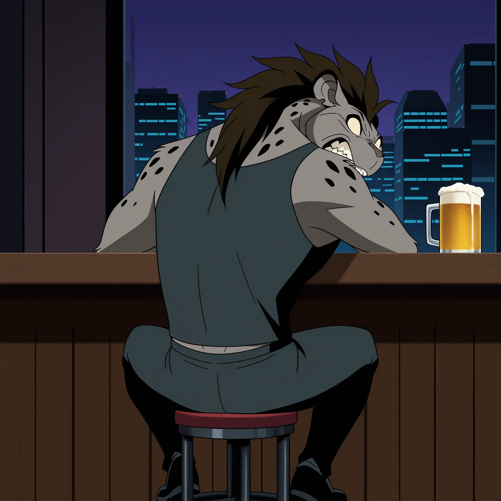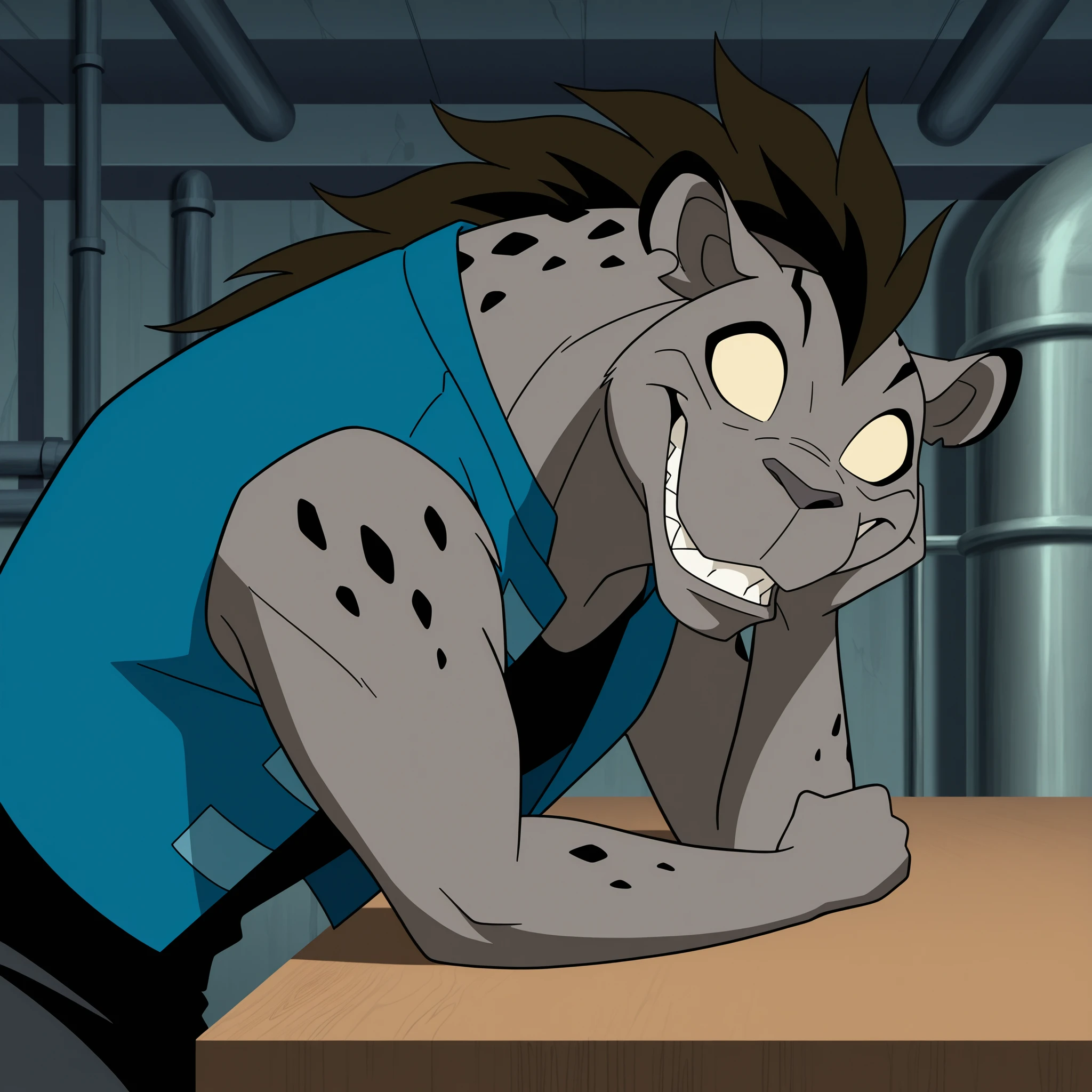 woofbb, brown hair, medium hair, hyena boy, hyena ears, yellow sclera, no pupils, animal nose, grey fur, spotted fur, no tail, blue vest, open vest, black tank top, black pants, black shoes, teeth, parted lips