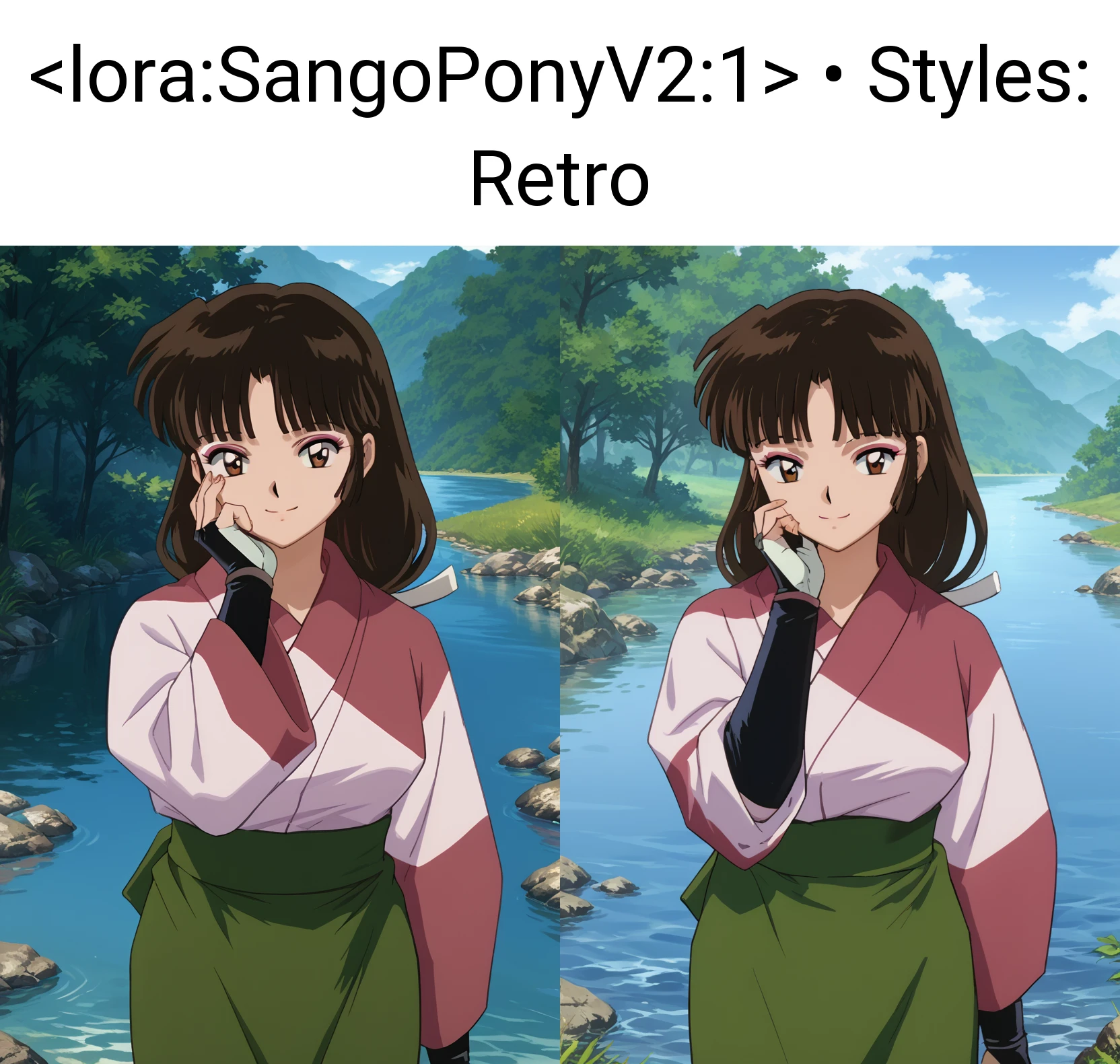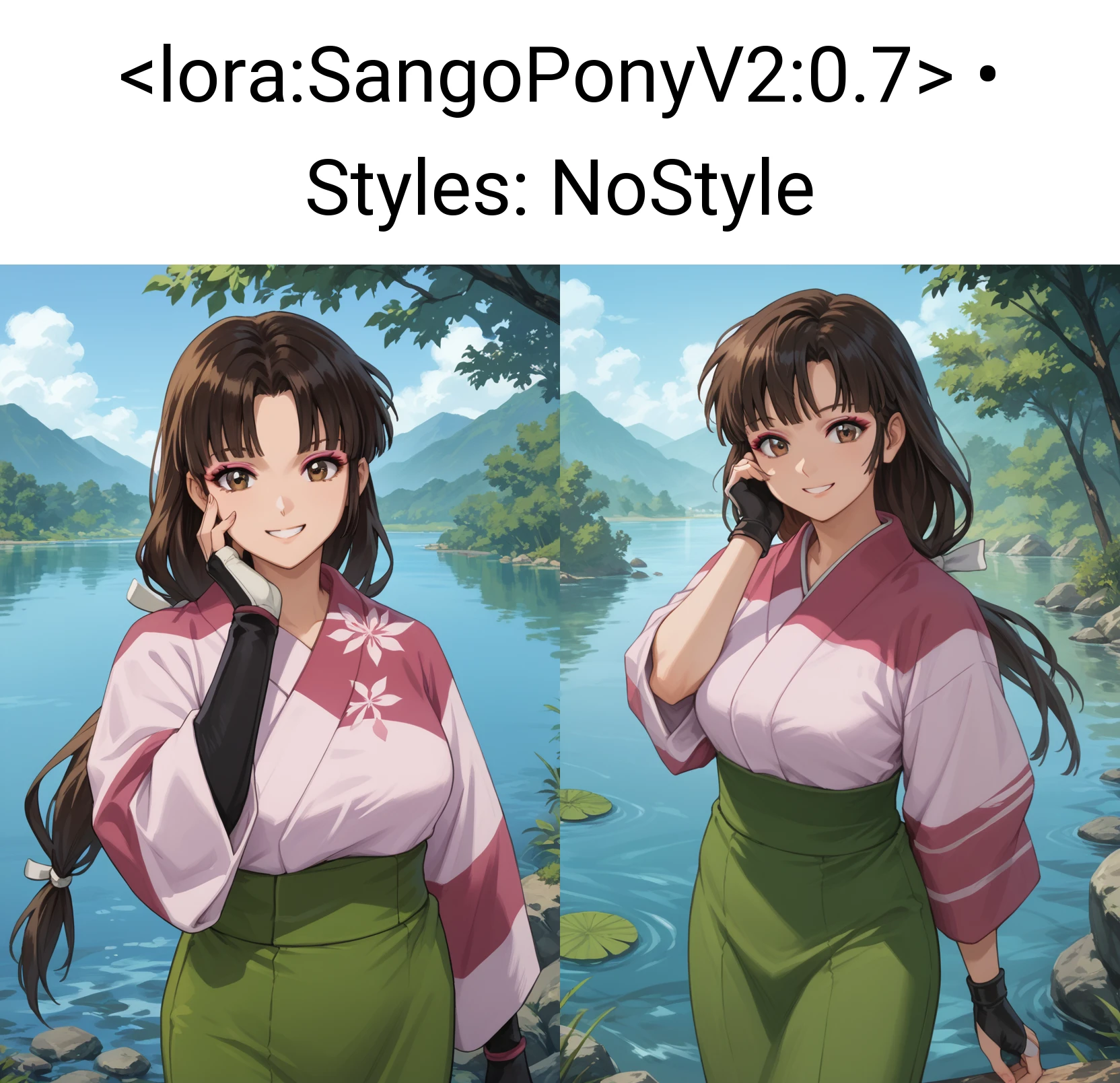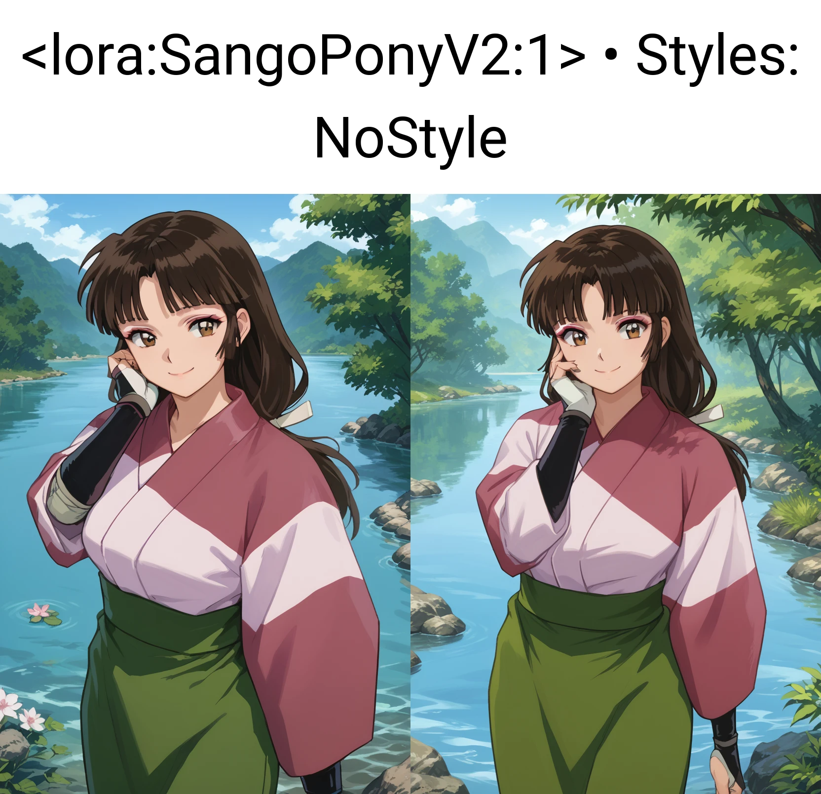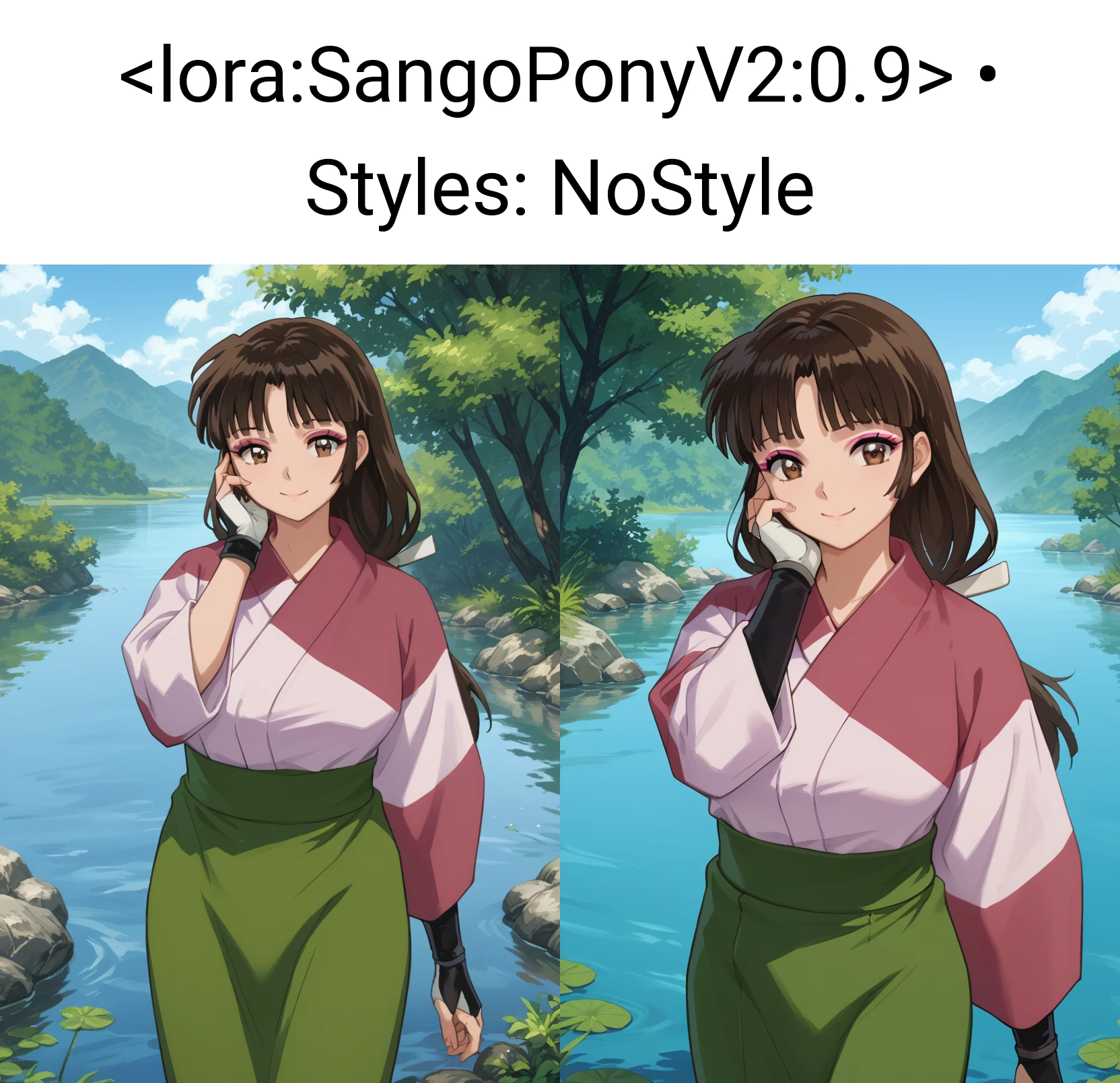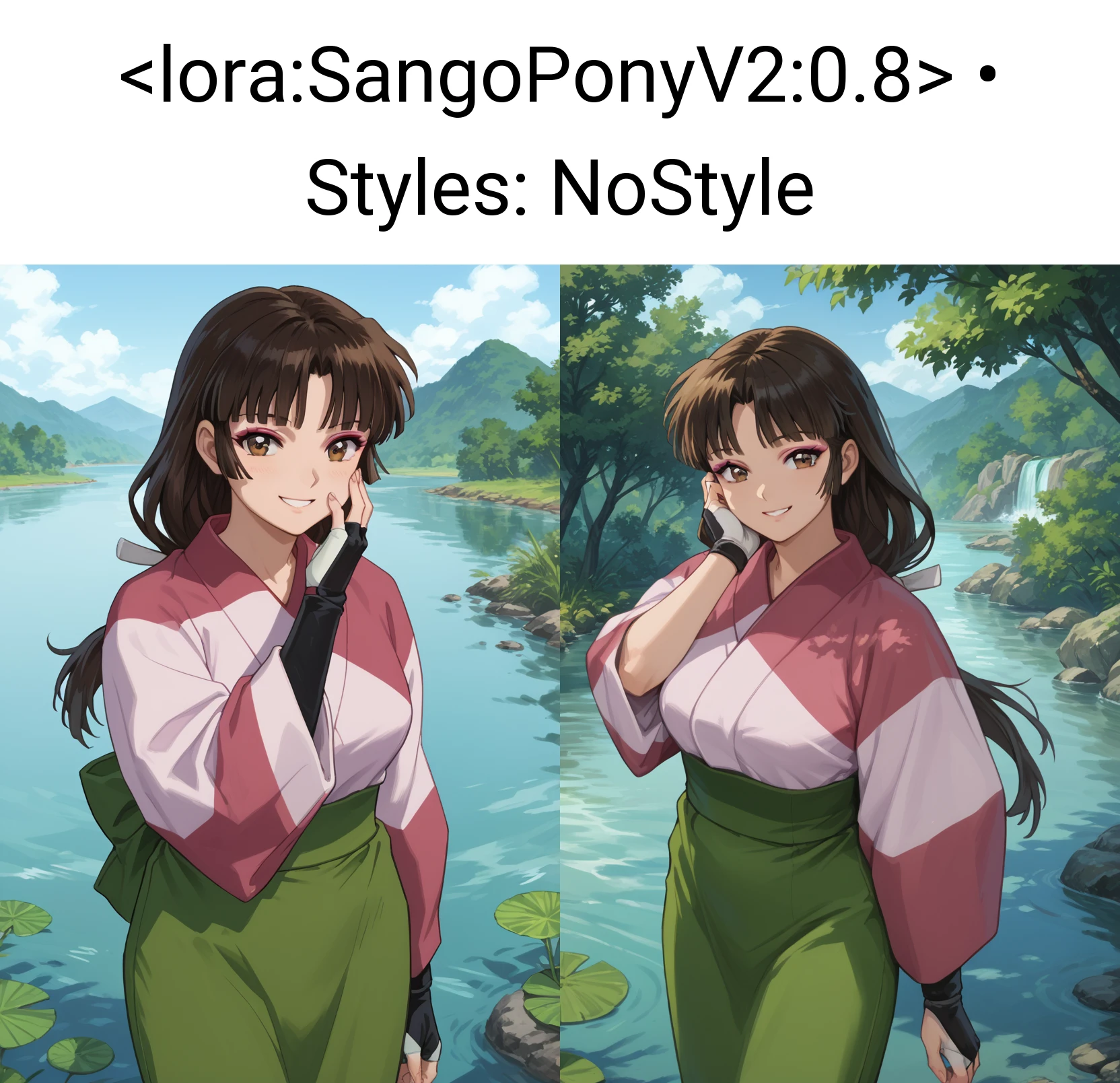 Sango, 1girl, solo, smile, brown eyes, makeup, bangs, black hair, brown hair, long hair, low-tied long hair, breasts, kimono, pink kimono, skirt, green skirt, fingerless gloves, looking at viewer, waving at viewer, standing, cowboy shot, outdoors, day, villageSango, 1girl, solo, smile, brown eyes, makeup, bangs, black hair, brown hair, ponytail, breasts, bodysuit, black bodysuit, shoulder pads, looking at viewer, hand on own chest, standing, cowboy shot, outdoors, day, villageSango, 1girl, solo, annoyed, brown eyes, makeup, bangs, black hair, brown hair, long hair, breasts, bodysuit, black bodysuit, shoulder pads, looking at viewer, crossed arms, standing, cowboy shot, outdoors, day, villageDo note these are examples. Be sure to use score tags, expressions.. probably make use of BREAK if your prompts are over 75 tokens. I'm currently learning about that.