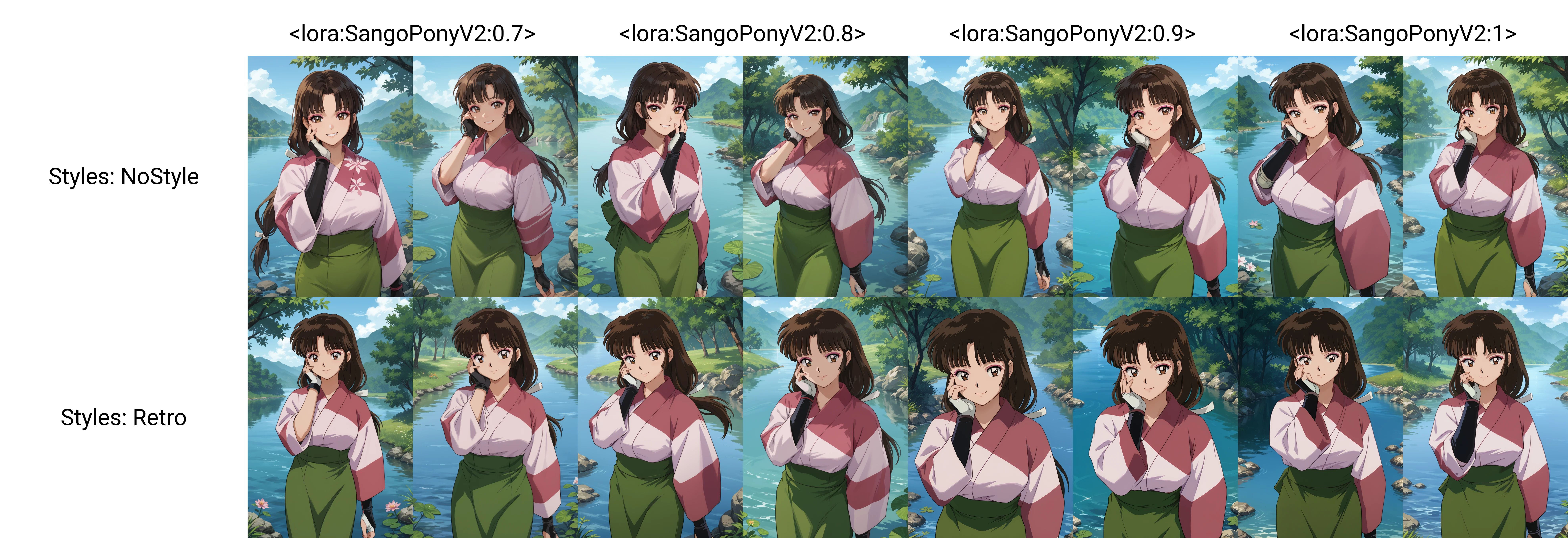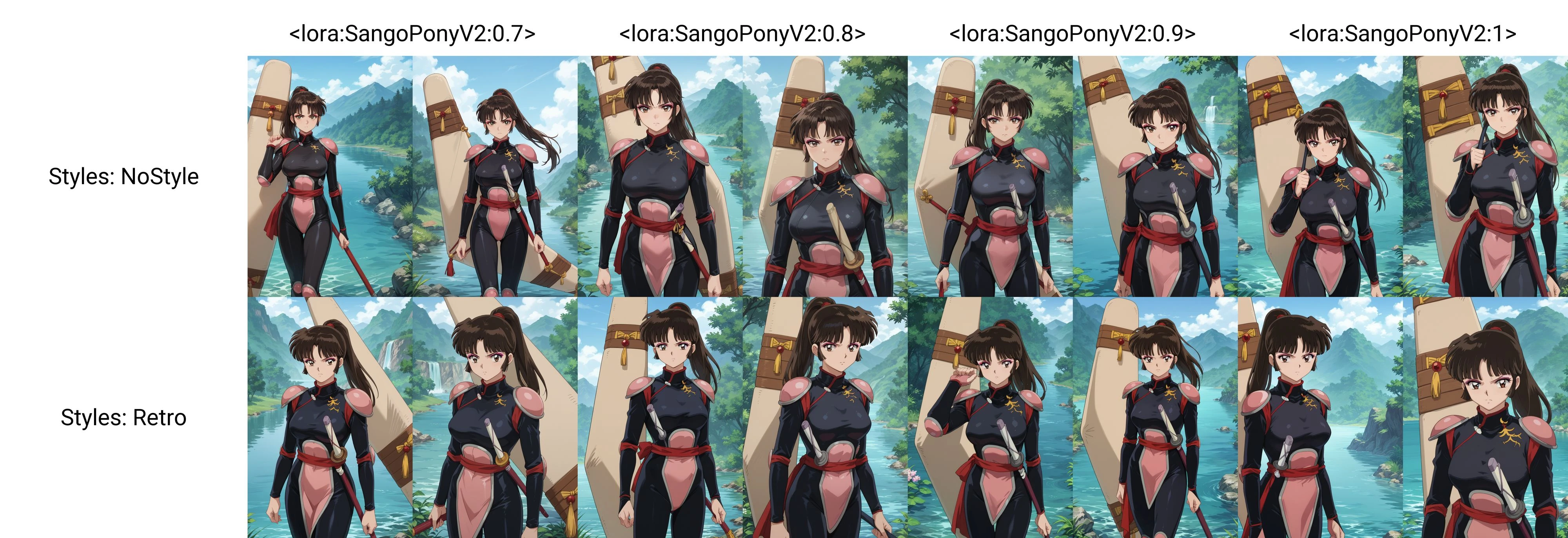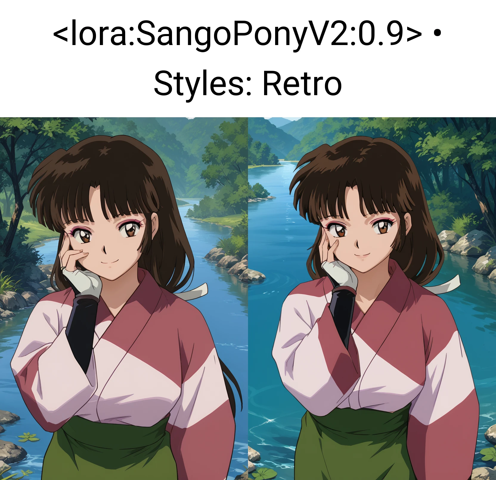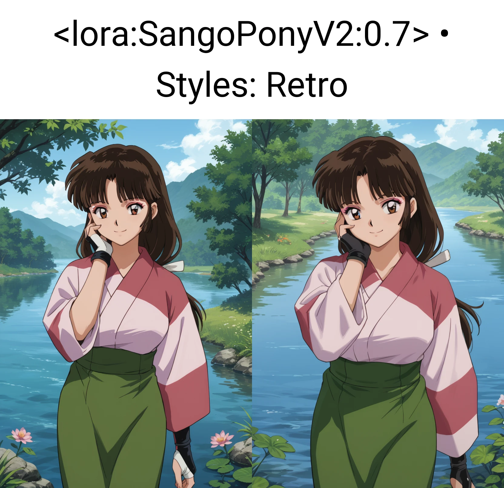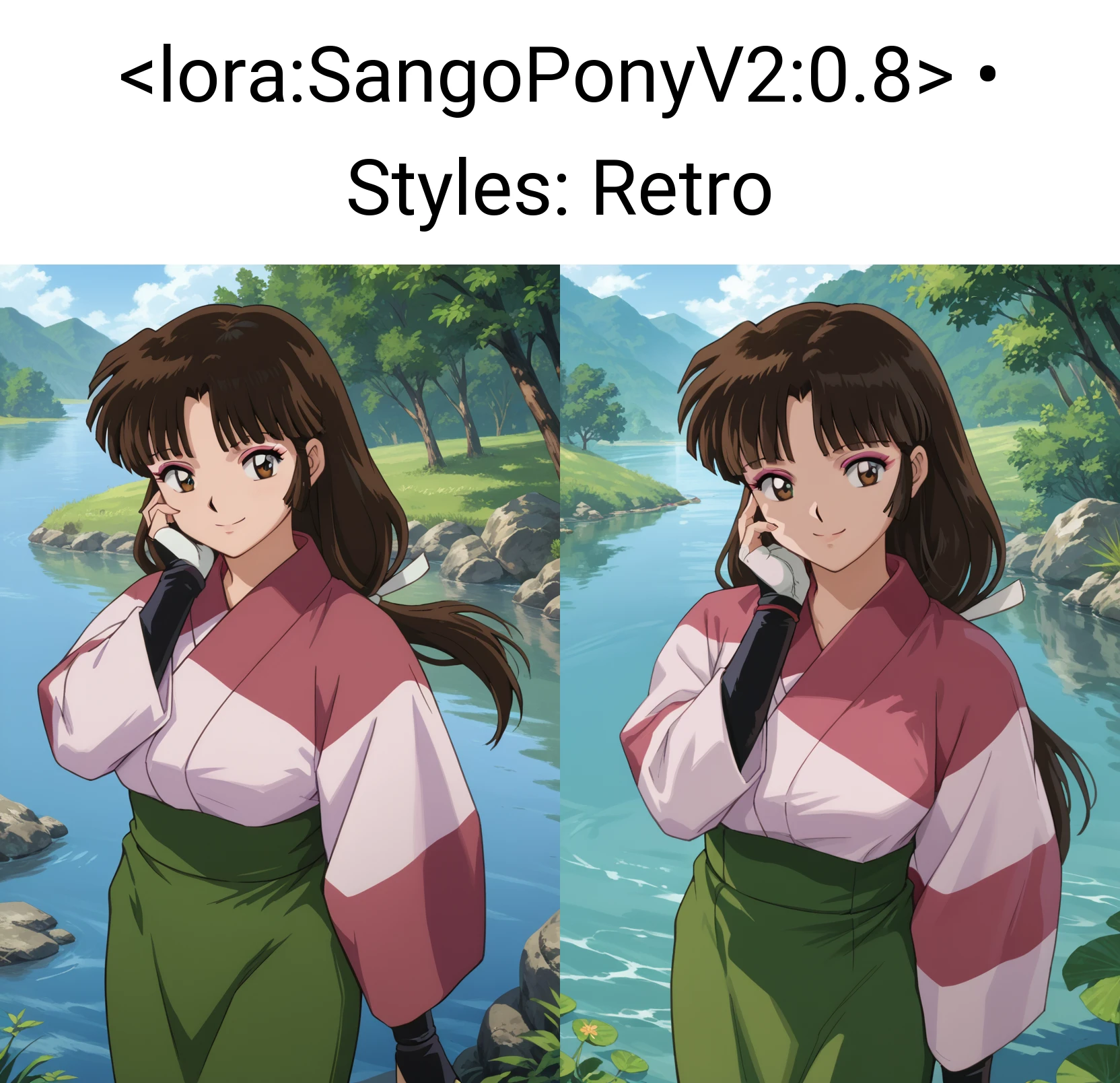 Sango, 1girl, solo, smile, brown eyes, makeup, bangs, black hair, brown hair, long hair, low-tied long hair, breasts, kimono, pink kimono, skirt, green skirt, fingerless gloves, looking at viewer, waving at viewer, standing, cowboy shot, outdoors, day, villageSango, 1girl, solo, smile, brown eyes, makeup, bangs, black hair, brown hair, ponytail, breasts, bodysuit, black bodysuit, shoulder pads, looking at viewer, hand on own chest, standing, cowboy shot, outdoors, day, villageSango, 1girl, solo, annoyed, brown eyes, makeup, bangs, black hair, brown hair, long hair, breasts, bodysuit, black bodysuit, shoulder pads, looking at viewer, crossed arms, standing, cowboy shot, outdoors, day, villageDo note these are examples. Be sure to use score tags, expressions.. probably make use of BREAK if your prompts are over 75 tokens. I'm currently learning about that.