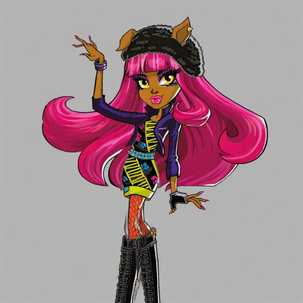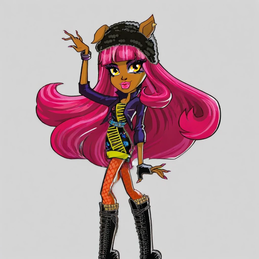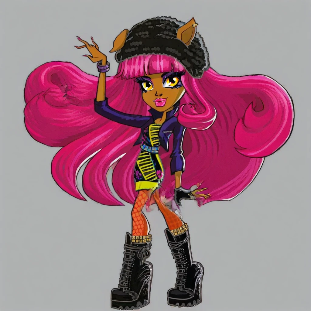 Brown skin, yellow eyes, long curly hair, wolf ears, left ear drooping and right ear raised, purple makeup, red lips, wolf tail,