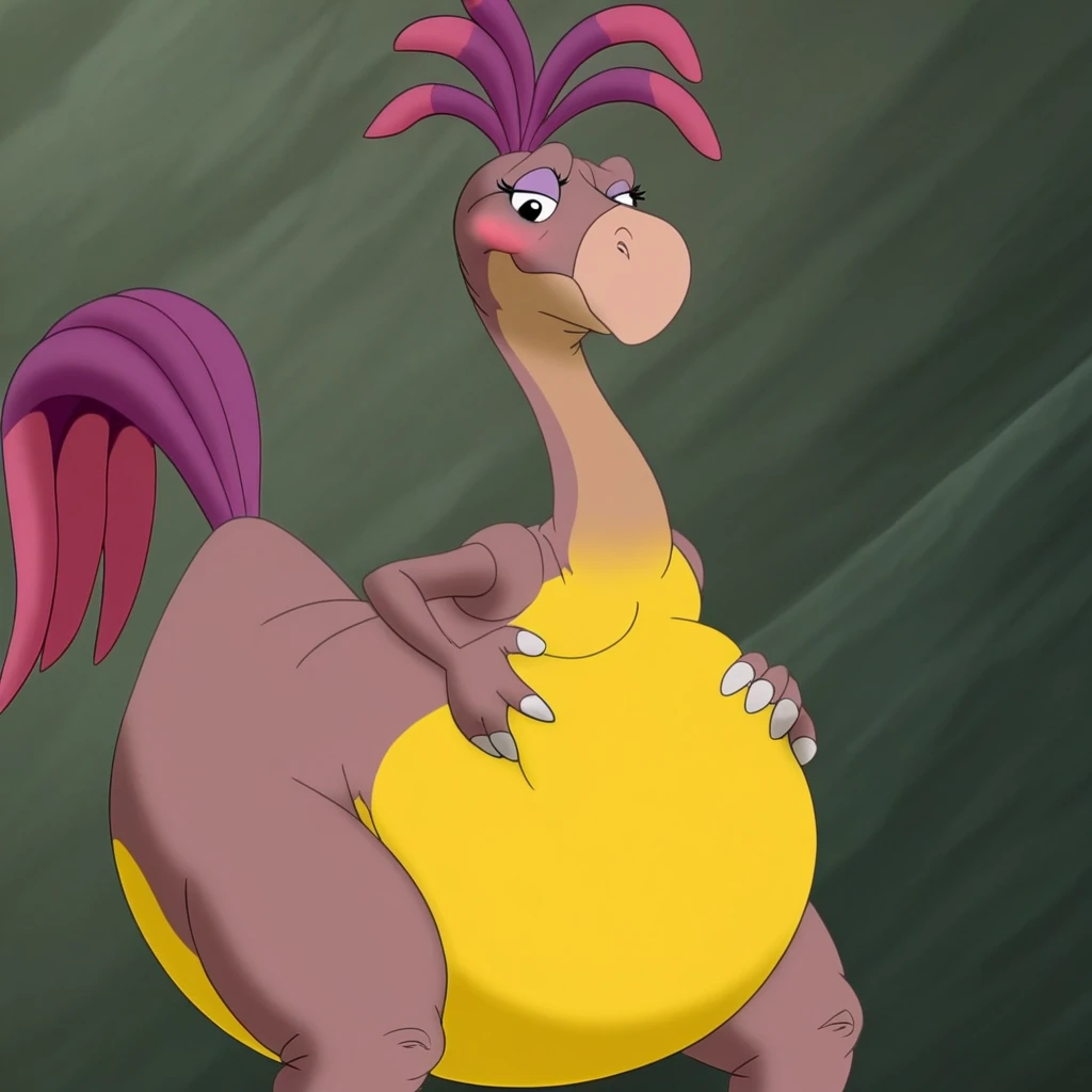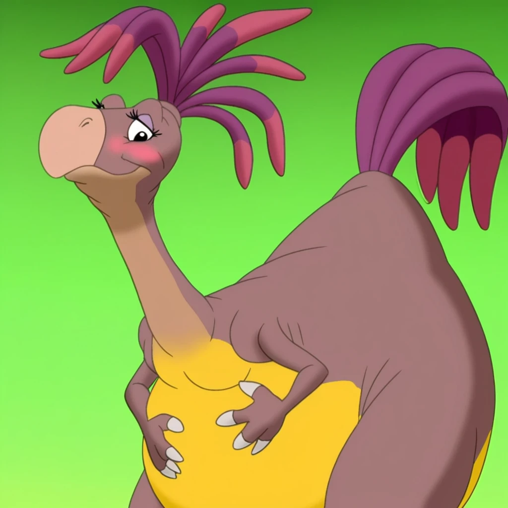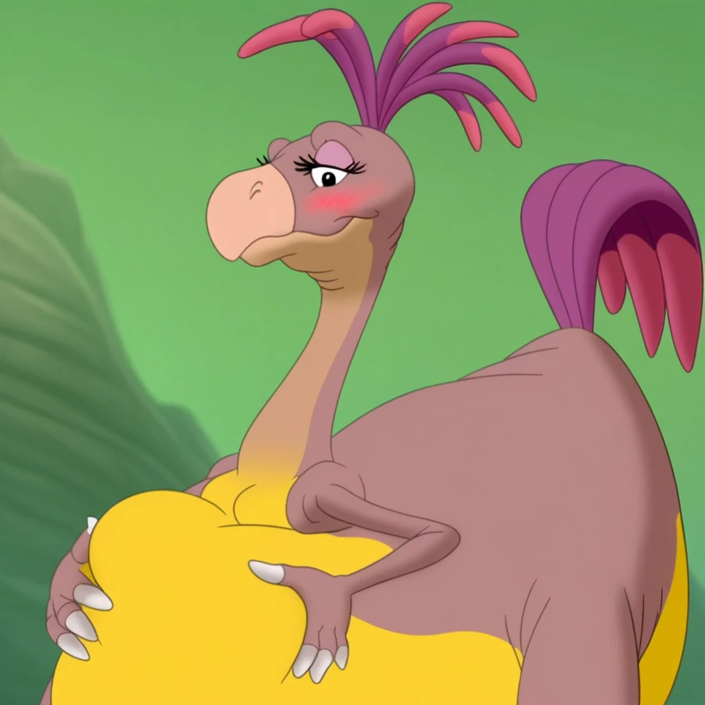 Tags: Doofah, yellow belly, big belly, chubby, big butt, breasts, skin folds, eye lashes, small eyes, dull pink body, pink and purple head feathers, pink and purple tail feathers, stubby tail, tan beak, small arms, claws, thick thighs, short legs, wide body, female