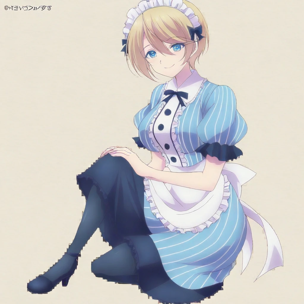 akane hououji \(megami cafe\), blonde hair, short hair, blue eyes, maid headdress, bangs, ribbons, blue and white maid outfit, apron, skirt, pantyhose, heels, large breasts, 1girl, solo