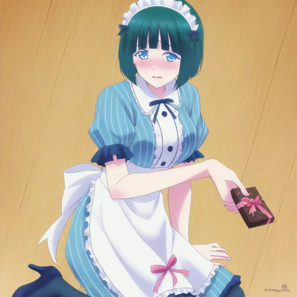 shiragiku ono \(megami cafe\), dark green hair, short hair, blue eyes, maid headdress, bangs, ribbons, blue and white maid outfit, apron, skirt, pantyhose, heels, large breasts, 1girl, solo