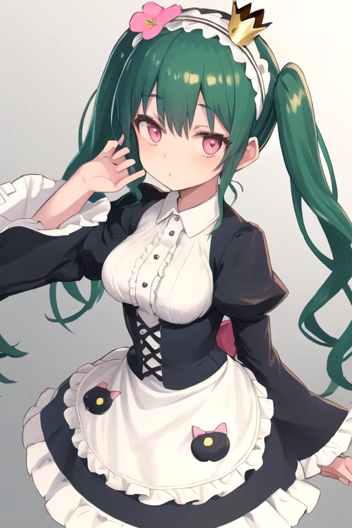 GinkoKuroi, 1girl, solo, long hair, skirt, white shirt, hair ornament, long sleeves, black dress, twintails, medium breasts, pink eyes, purple pantyhose, sidelocks, hairband, frills, green hair, puffy sleeves, collared shirt, hair flower, wide sleeves, waist apron, maid, maid headdress, mini crown, frilled sleeves, white apron, corset, underbust,