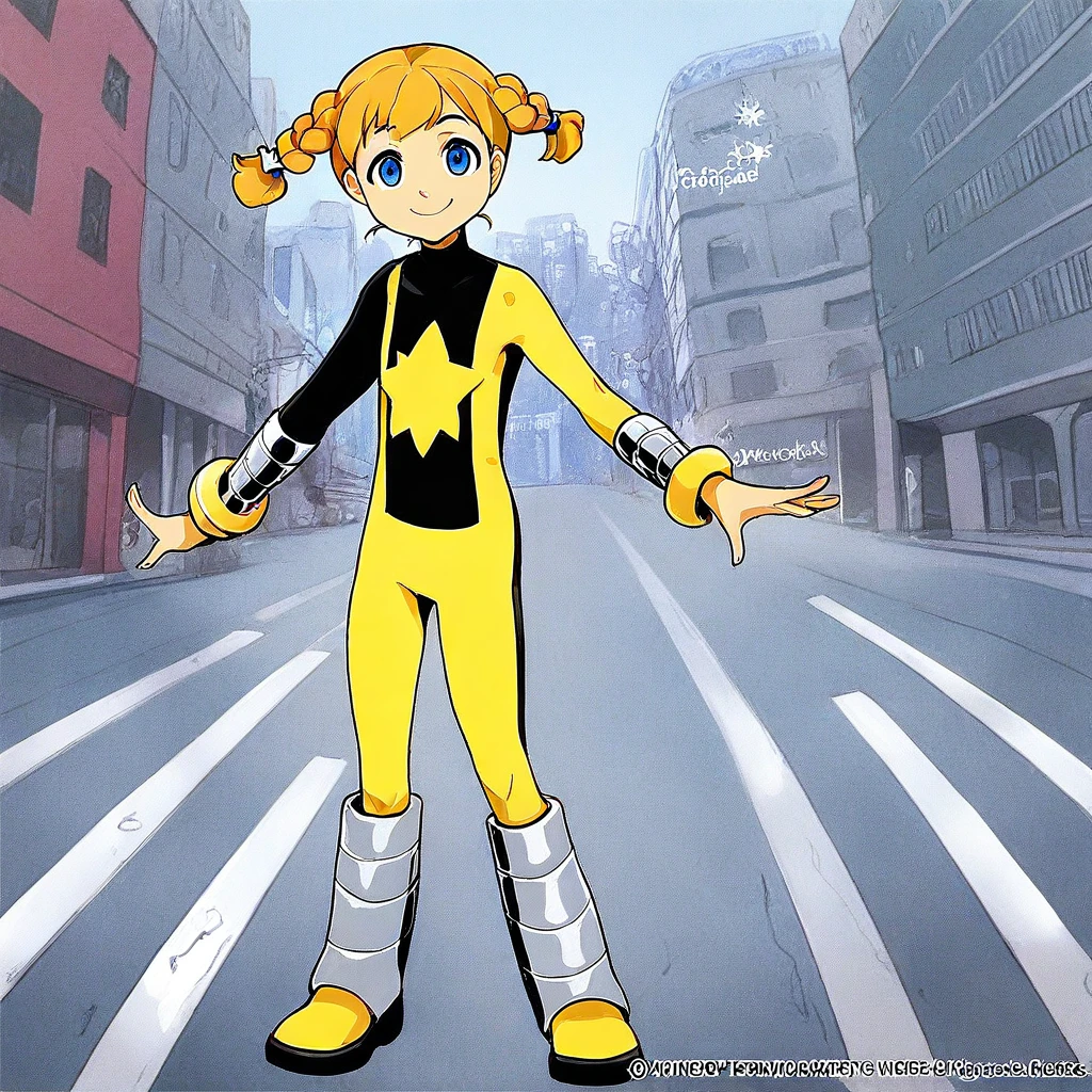 Costume: Power Pack uniform, asymmetrical clothes, star (symbol), eng_emb, print bodysuit, yellow bodysuit, black bodysuit, two-tone bodysuit, bracer, metal bracer, knee boots, metal boots,