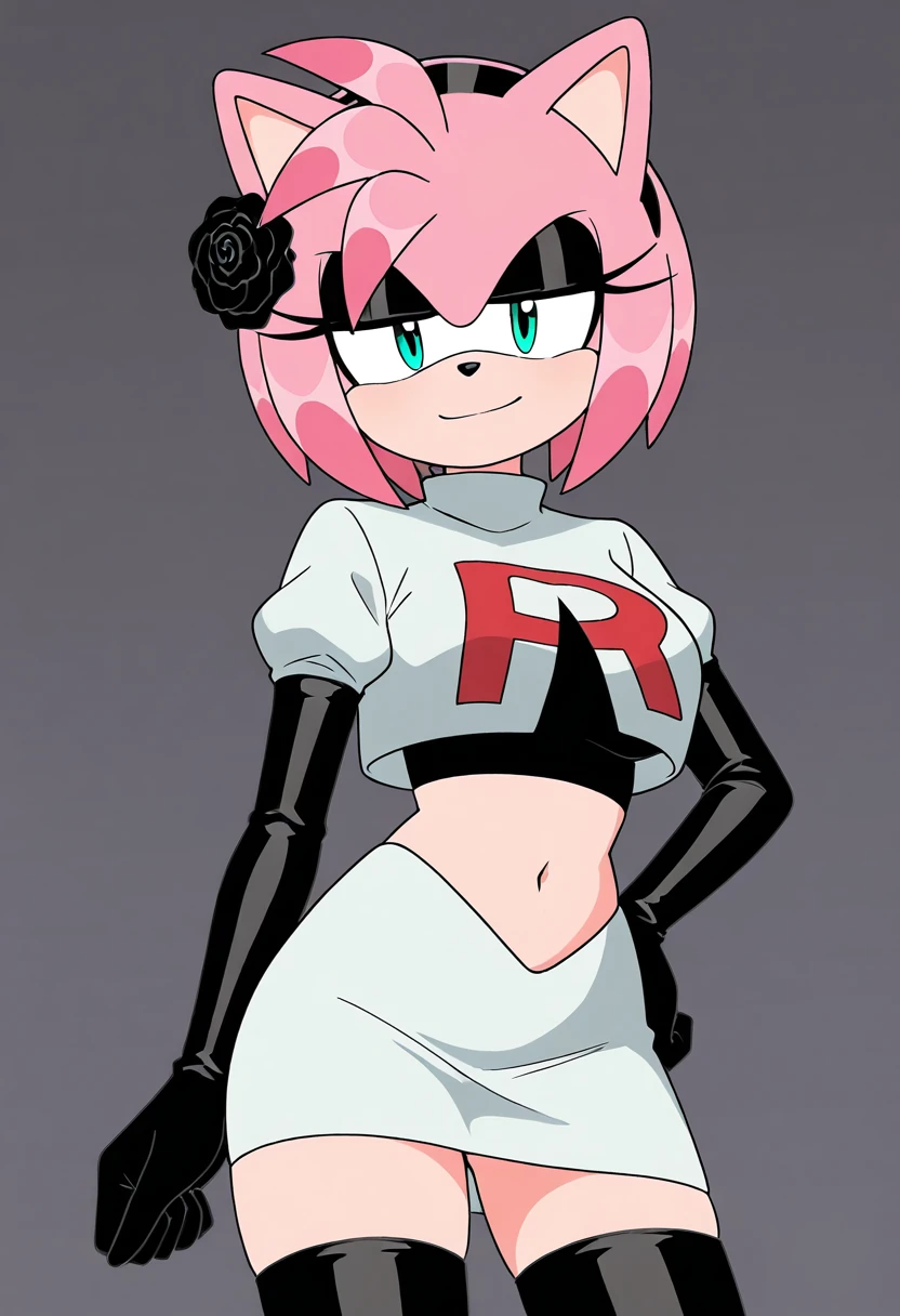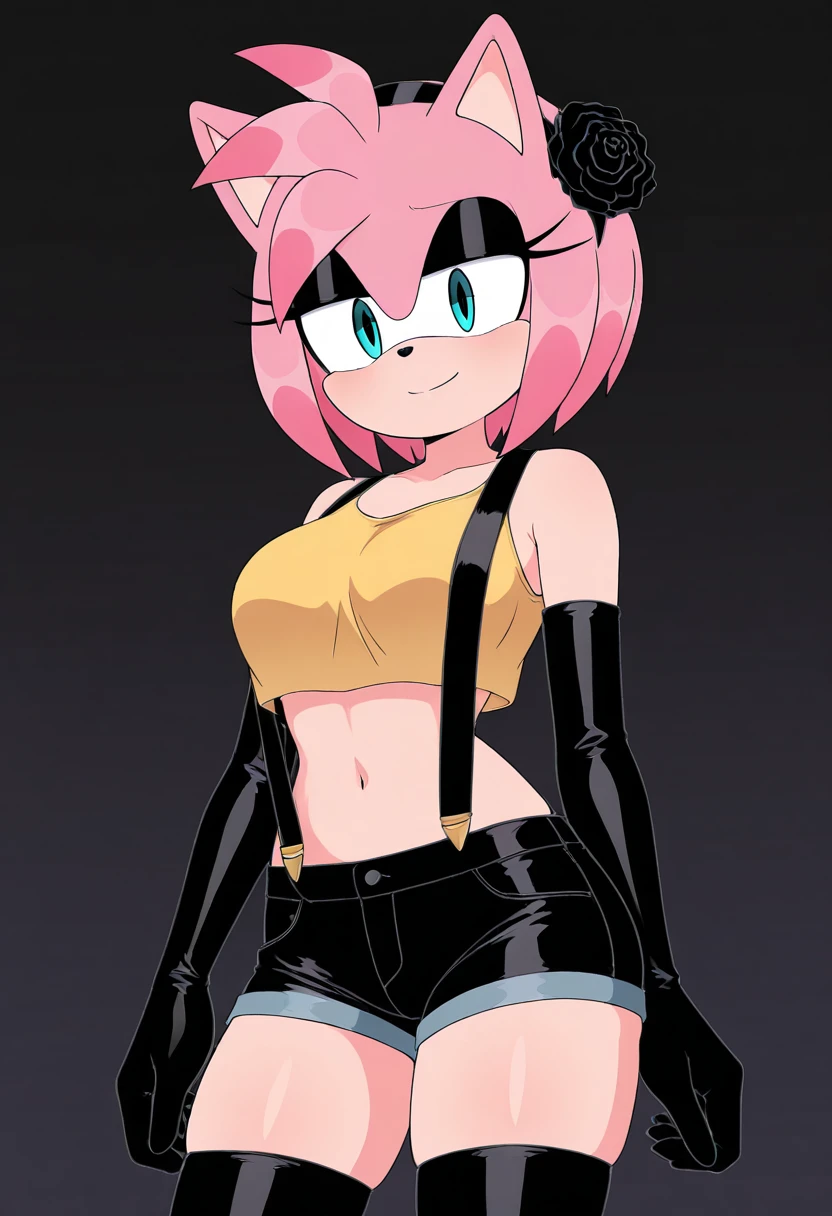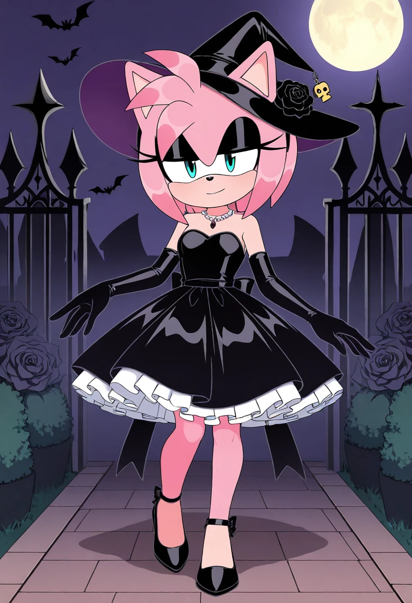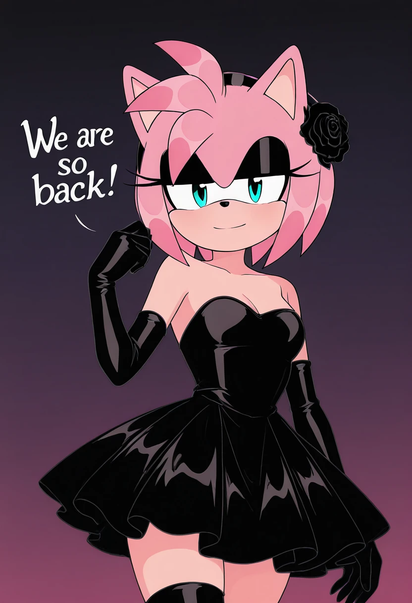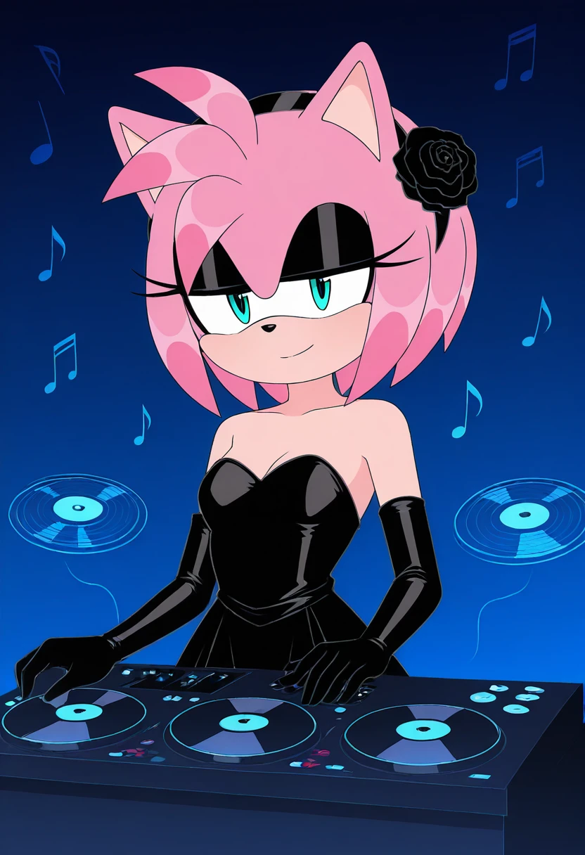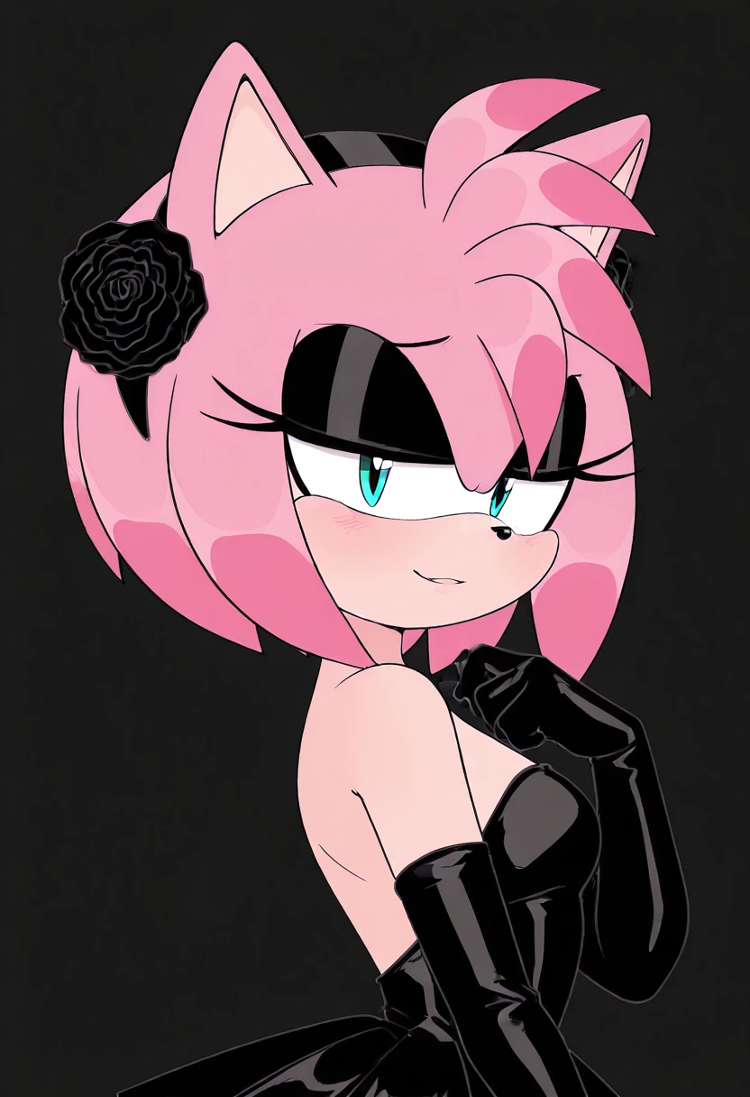 zzAmy, aqua eyes, pink hair, short hair, black eyeshadow, eyelashes, eyeliner, animal nose, black rose, hair ornament, hairband, strapless dress, elbow gloves, black gloves,